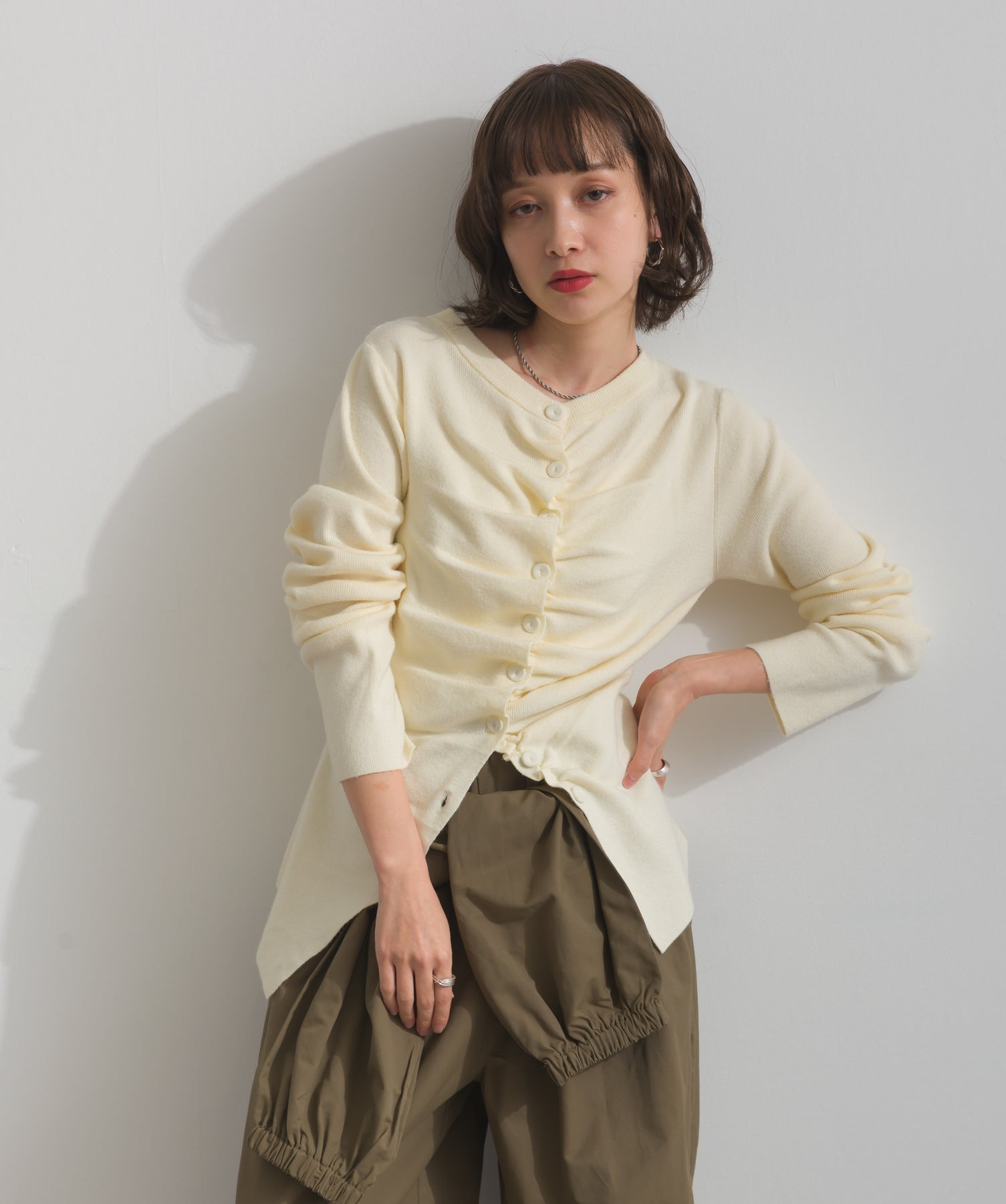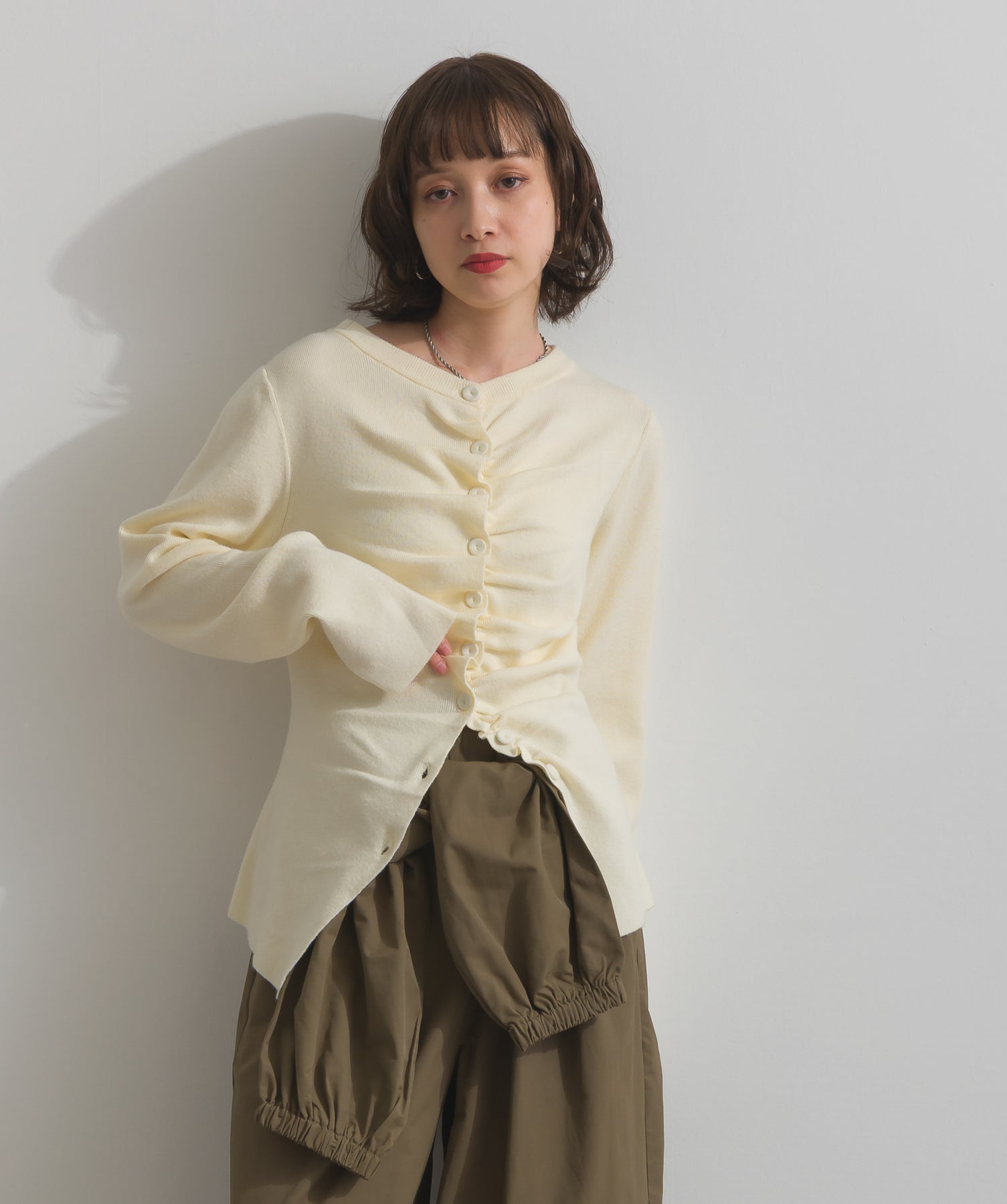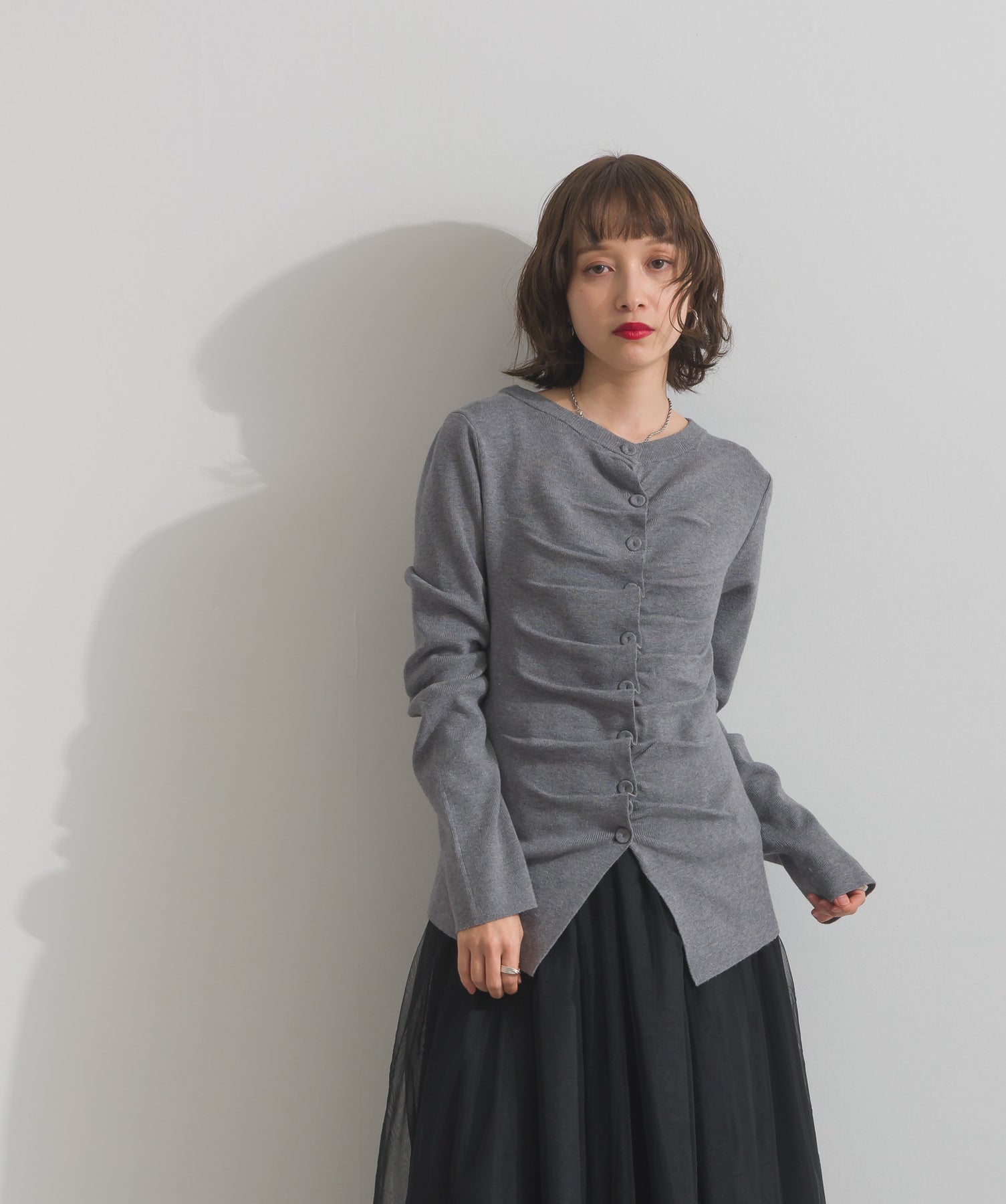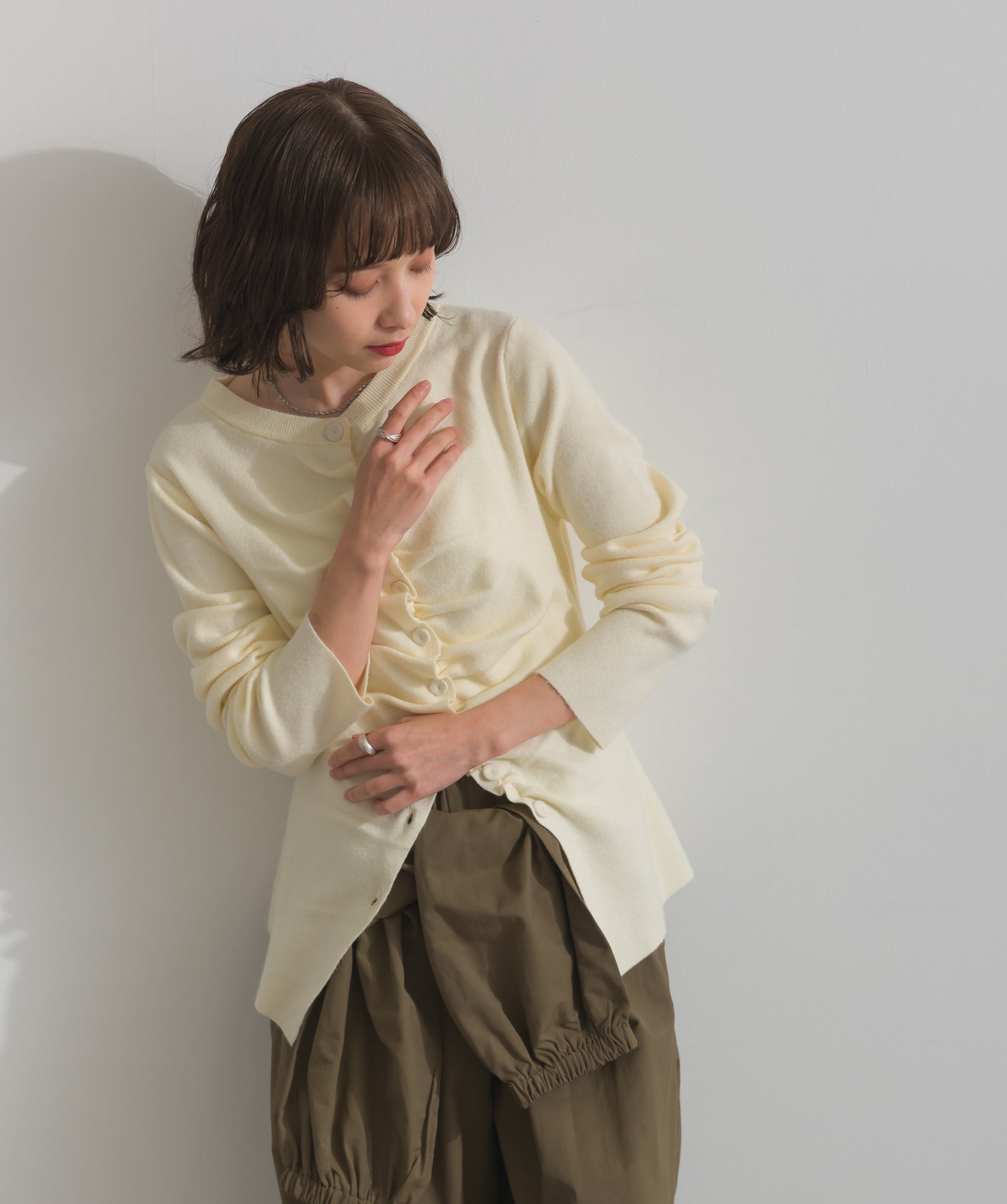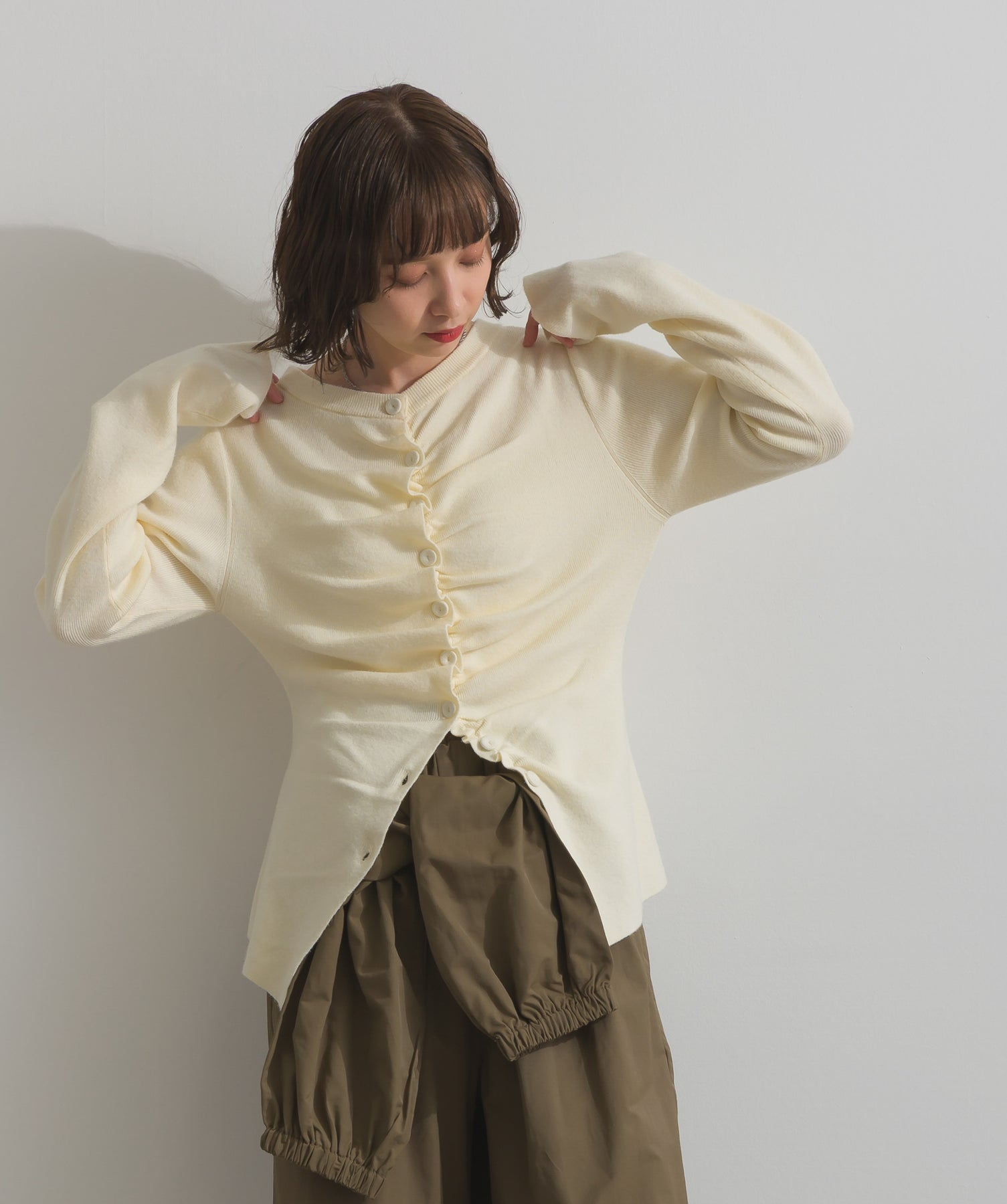 センシュアルに魅せる、計算されたギャザーデザイン。甘さ控えめ、なのにフェミニン。センターのギャザーが視線を引き寄せる、洗練カーディガン。-material-程よい厚みと柔らかさを備えたレーヨン混ニット素材を使用。ストレッチ性があり、心地よく身体にフィット。シーズンレスで着用できるライトな質感で、インナー使いにも活躍します。-design-フロントにあしらわれた大胆かつ繊細なギャザーが、豊かな陰影とリズムを生み出し、シンプルながらも奥行きのある表情を演出します。身体のラインを美しく魅せるコンパクトなシルエットで、ハイウエストのボトムスや、裾からレースを覗かせるレイヤードスタイルとも相性抜群。袖口はやや長めに設計され、手元にニュアンスを加えながら華奢見えも叶えます。大人の日常に洗練されたアクセントを加える一着です。