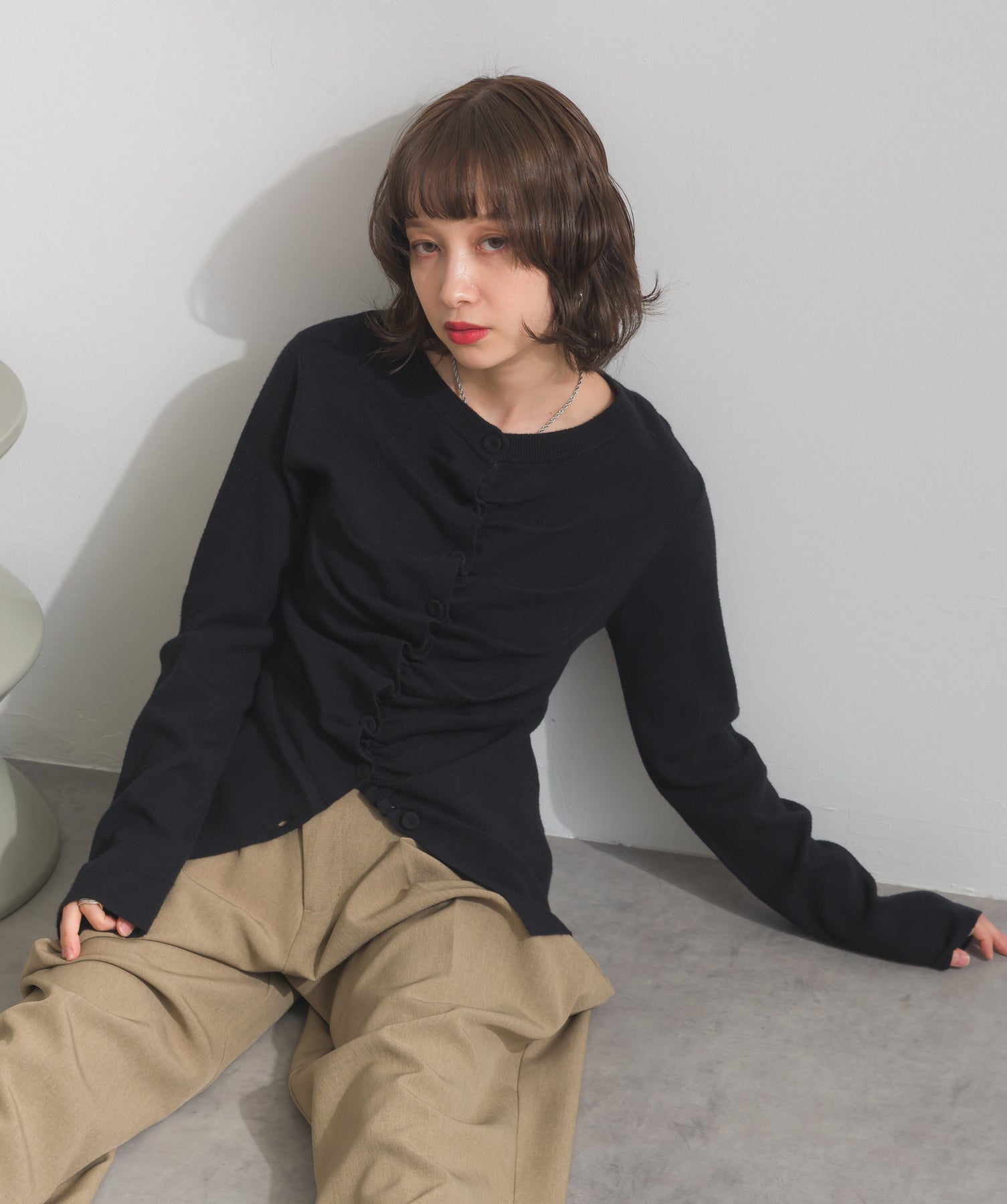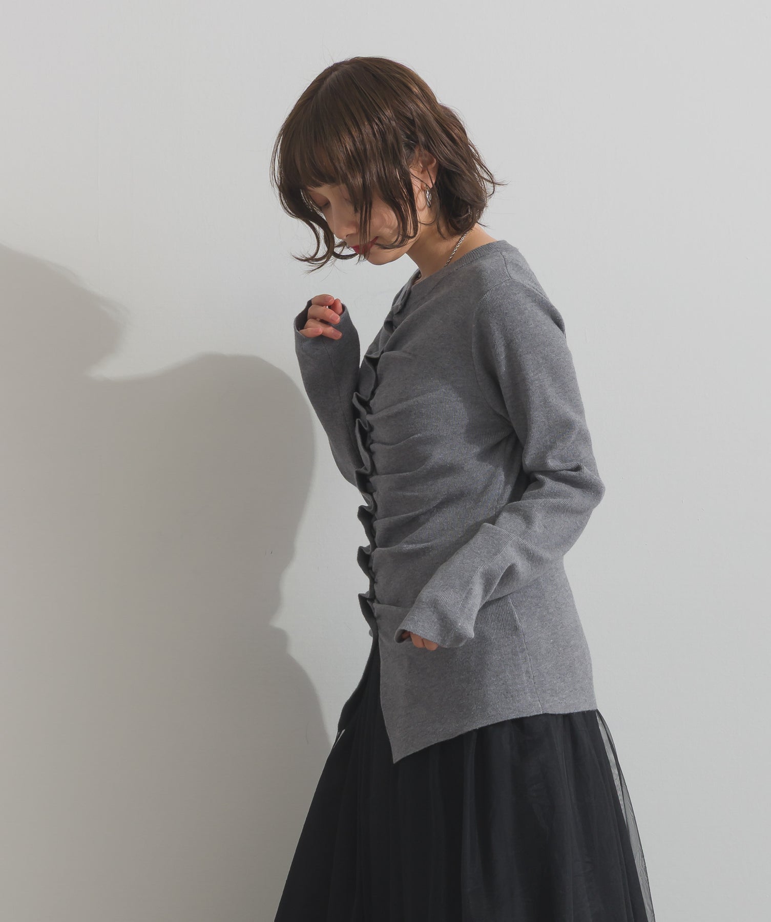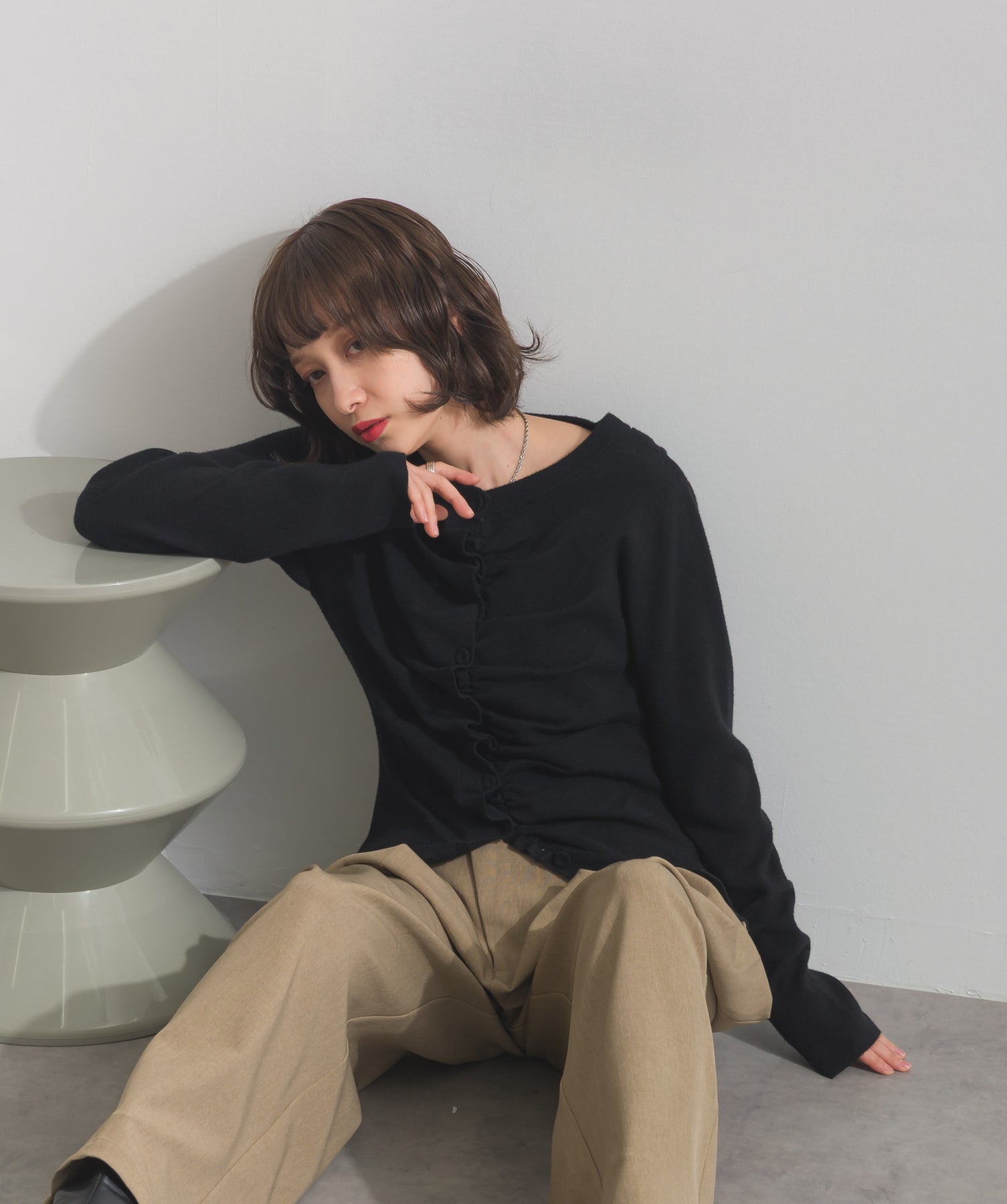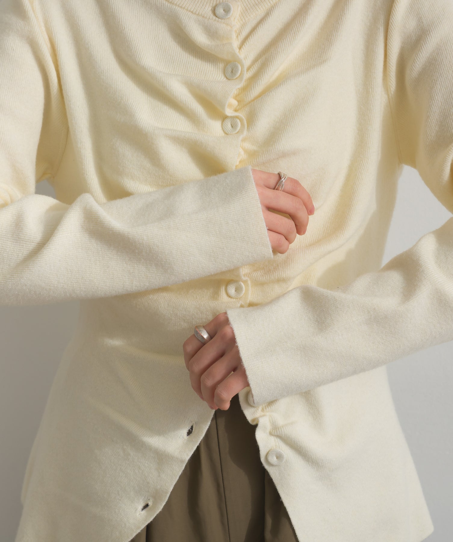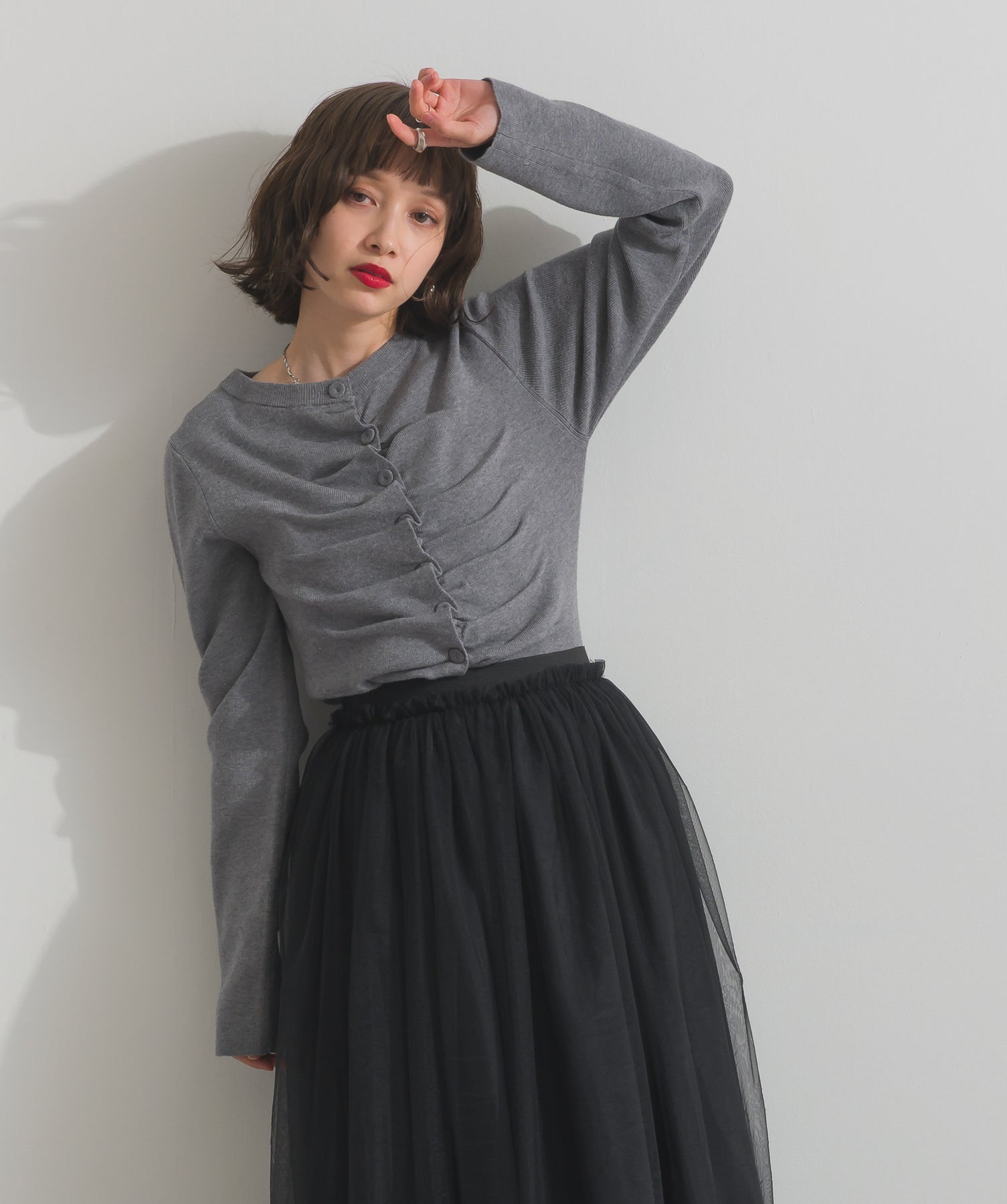 センシュアルに魅せる、計算されたギャザーデザイン。甘さ控えめ、なのにフェミニン。センターのギャザーが視線を引き寄せる、洗練カーディガン。-material-程よい厚みと柔らかさを備えたレーヨン混ニット素材を使用。ストレッチ性があり、心地よく身体にフィット。シーズンレスで着用できるライトな質感で、インナー使いにも活躍します。-design-フロントにあしらわれた大胆かつ繊細なギャザーが、豊かな陰影とリズムを生み出し、シンプルながらも奥行きのある表情を演出します。身体のラインを美しく魅せるコンパクトなシルエットで、ハイウエストのボトムスや、裾からレースを覗かせるレイヤードスタイルとも相性抜群。袖口はやや長めに設計され、手元にニュアンスを加えながら華奢見えも叶えます。大人の日常に洗練されたアクセントを加える一着です。