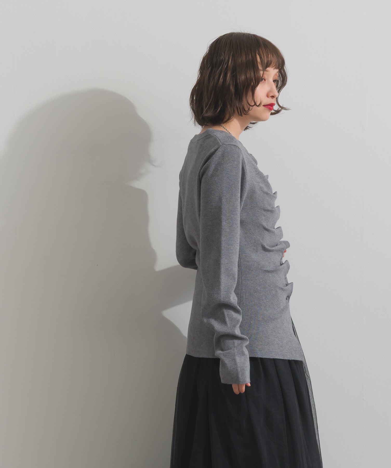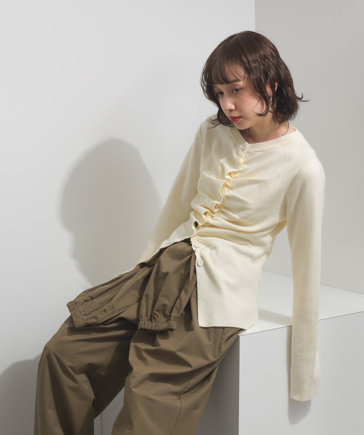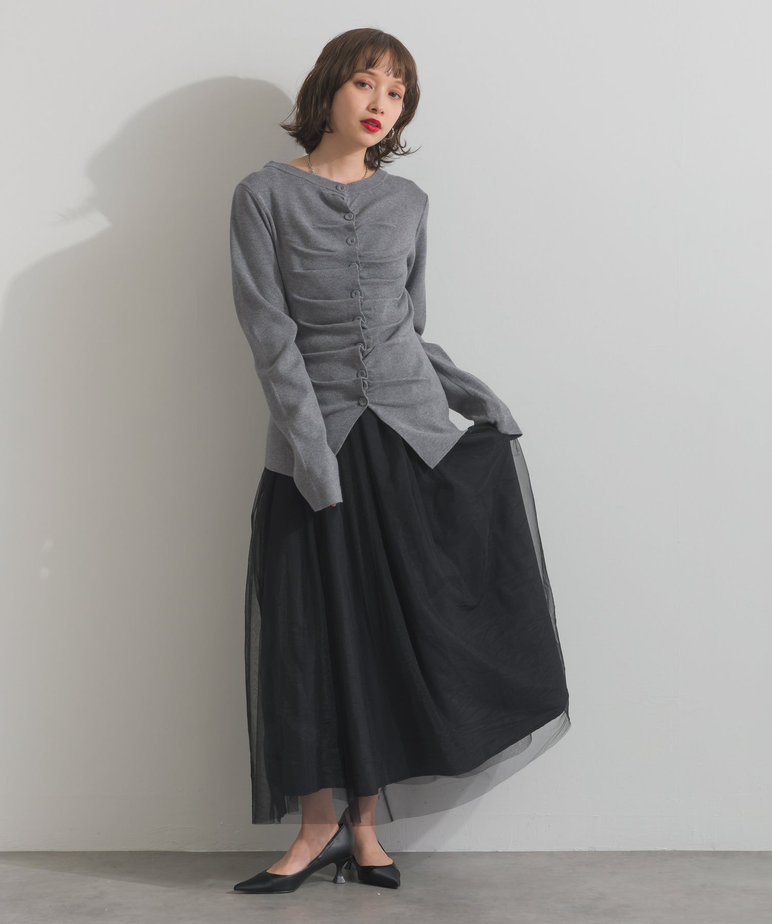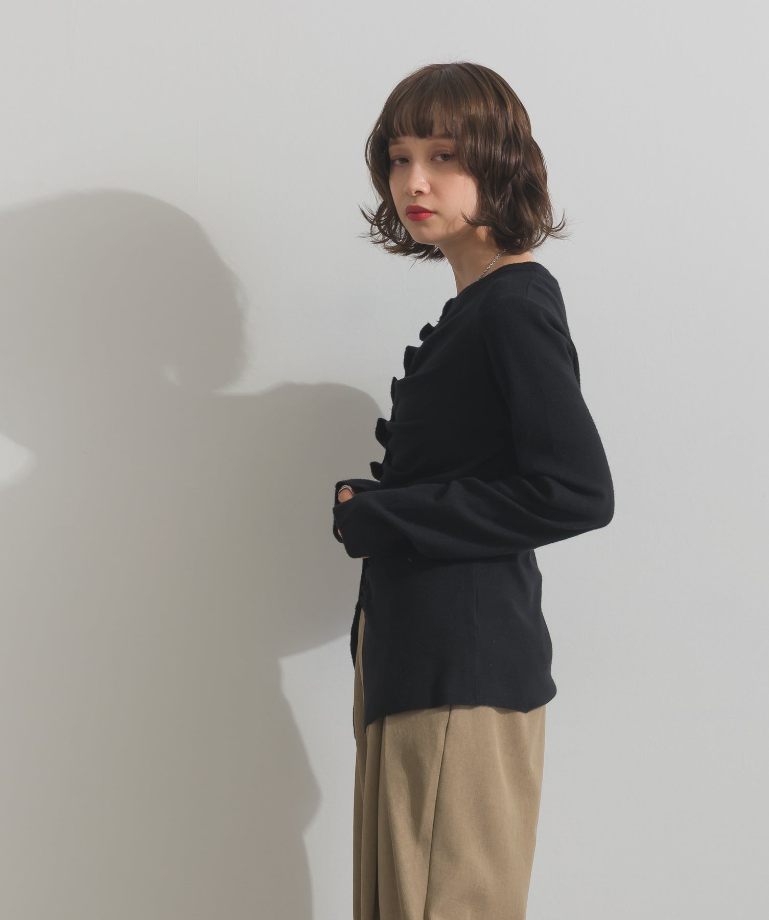 センシュアルに魅せる、計算されたギャザーデザイン。甘さ控えめ、なのにフェミニン。センターのギャザーが視線を引き寄せる、洗練カーディガン。-material-程よい厚みと柔らかさを備えたレーヨン混ニット素材を使用。ストレッチ性があり、心地よく身体にフィット。シーズンレスで着用できるライトな質感で、インナー使いにも活躍します。-design-フロントにあしらわれた大胆かつ繊細なギャザーが、豊かな陰影とリズムを生み出し、シンプルながらも奥行きのある表情を演出します。身体のラインを美しく魅せるコンパクトなシルエットで、ハイウエストのボトムスや、裾からレースを覗かせるレイヤードスタイルとも相性抜群。袖口はやや長めに設計され、手元にニュアンスを加えながら華奢見えも叶えます。大人の日常に洗練されたアクセントを加える一着です。