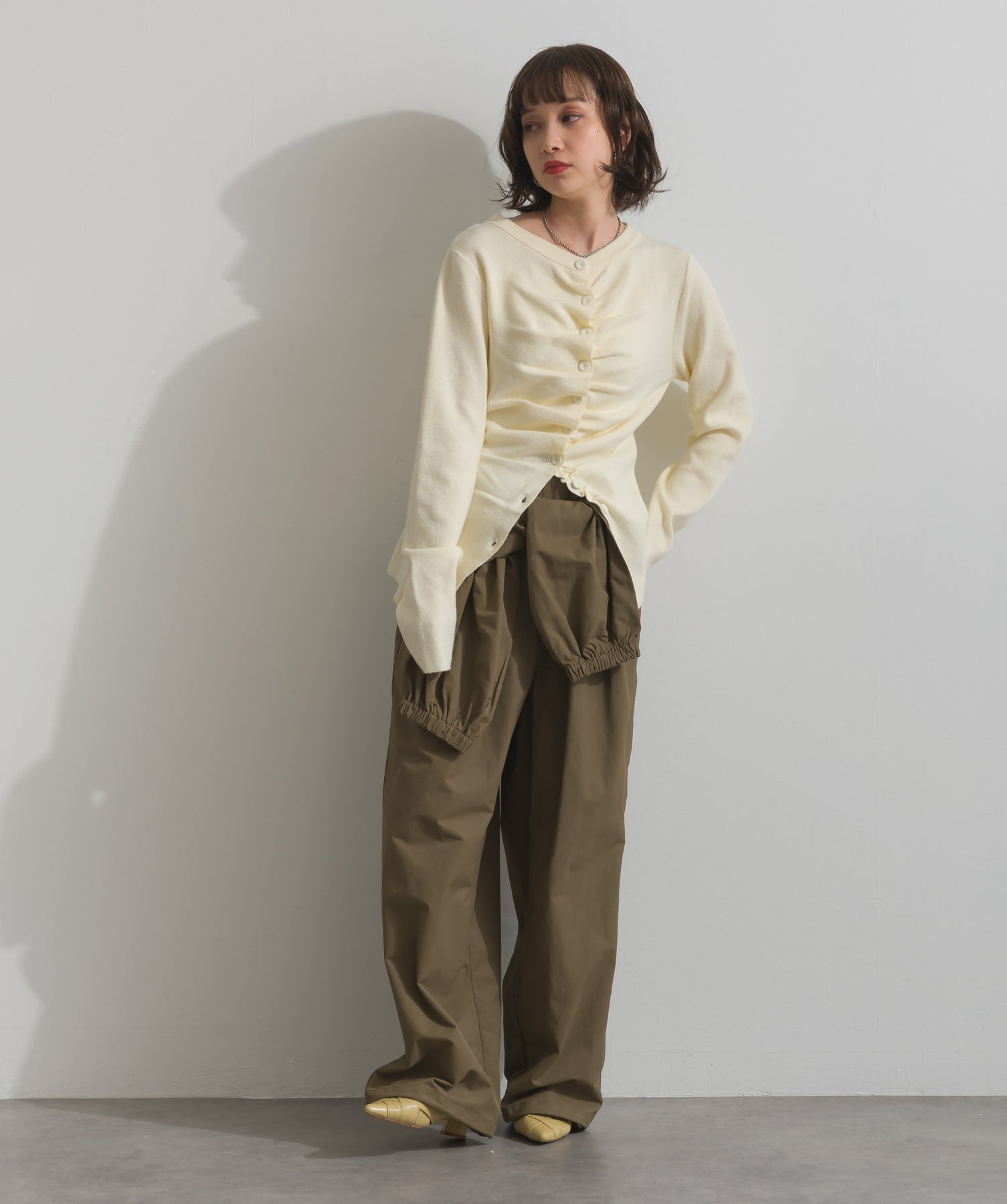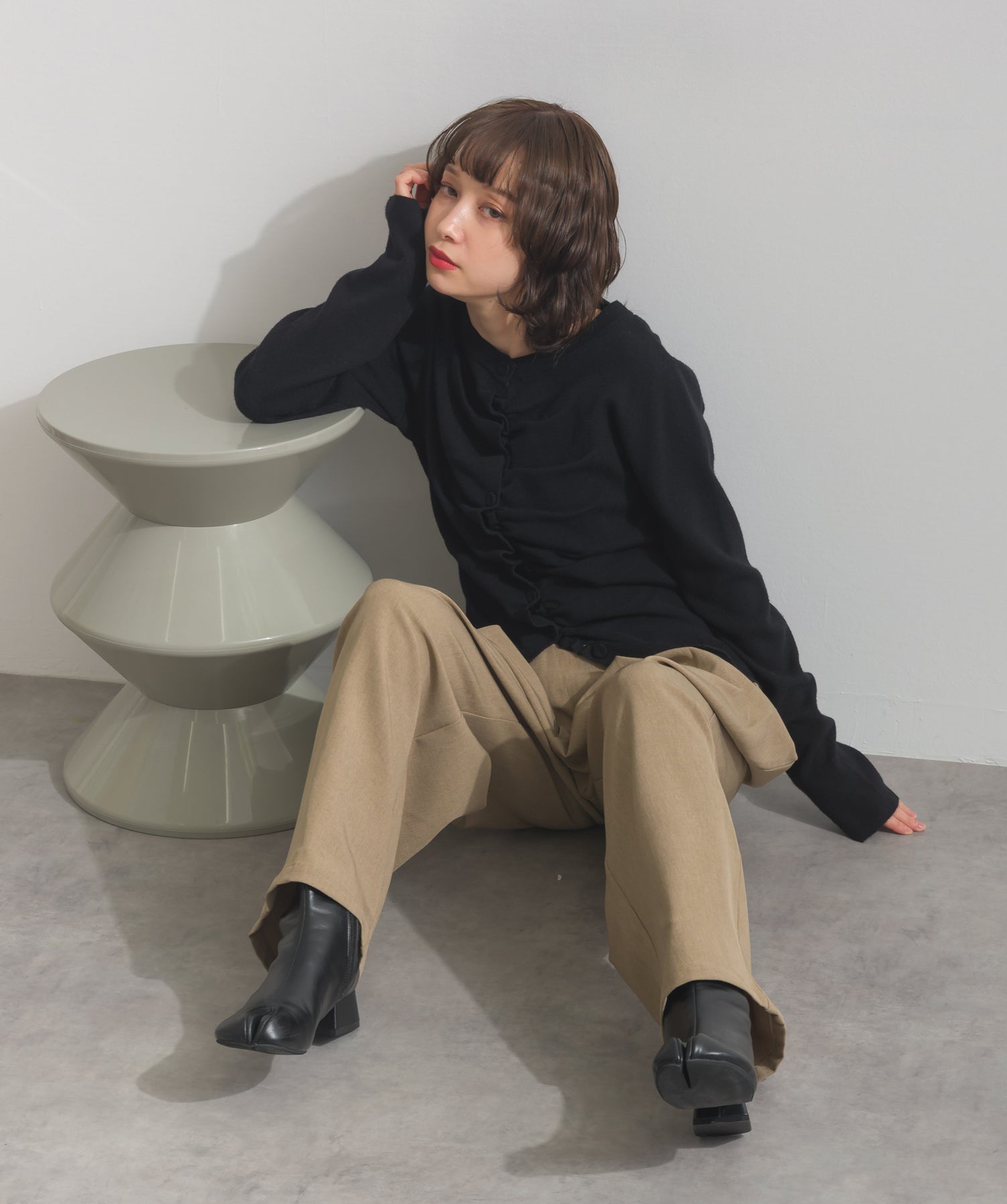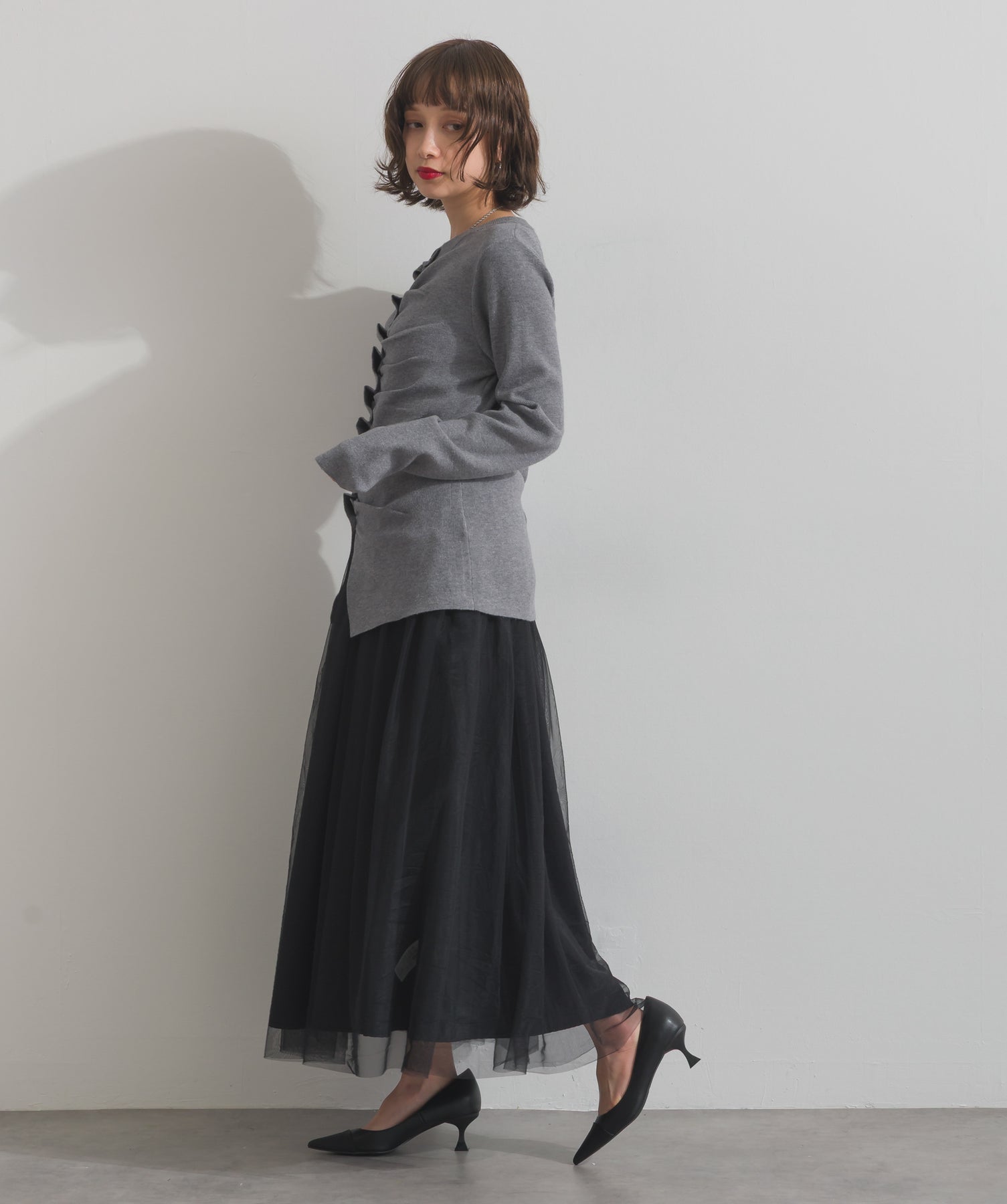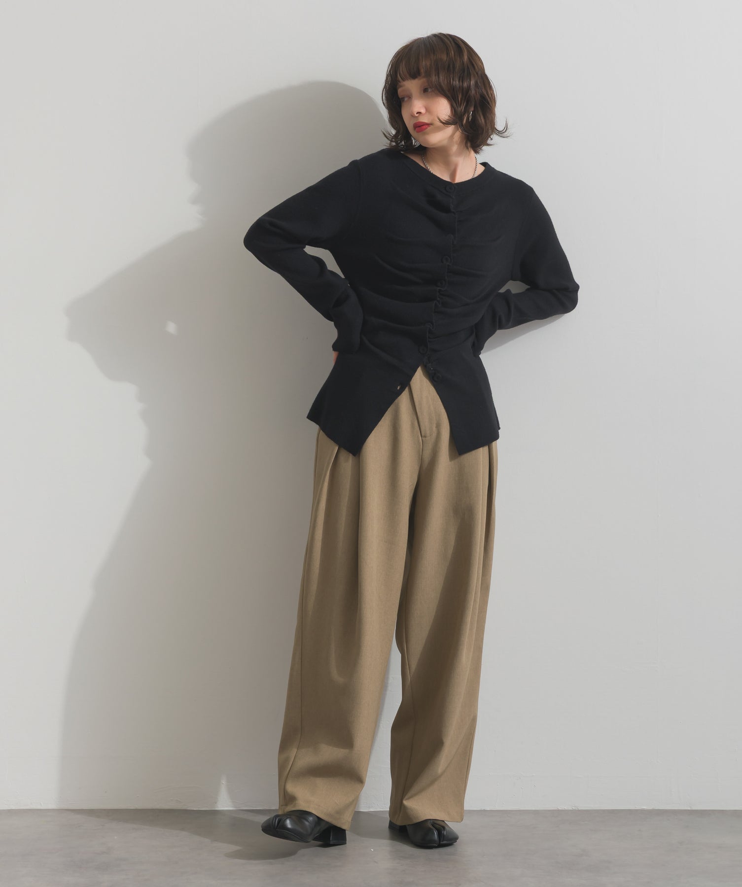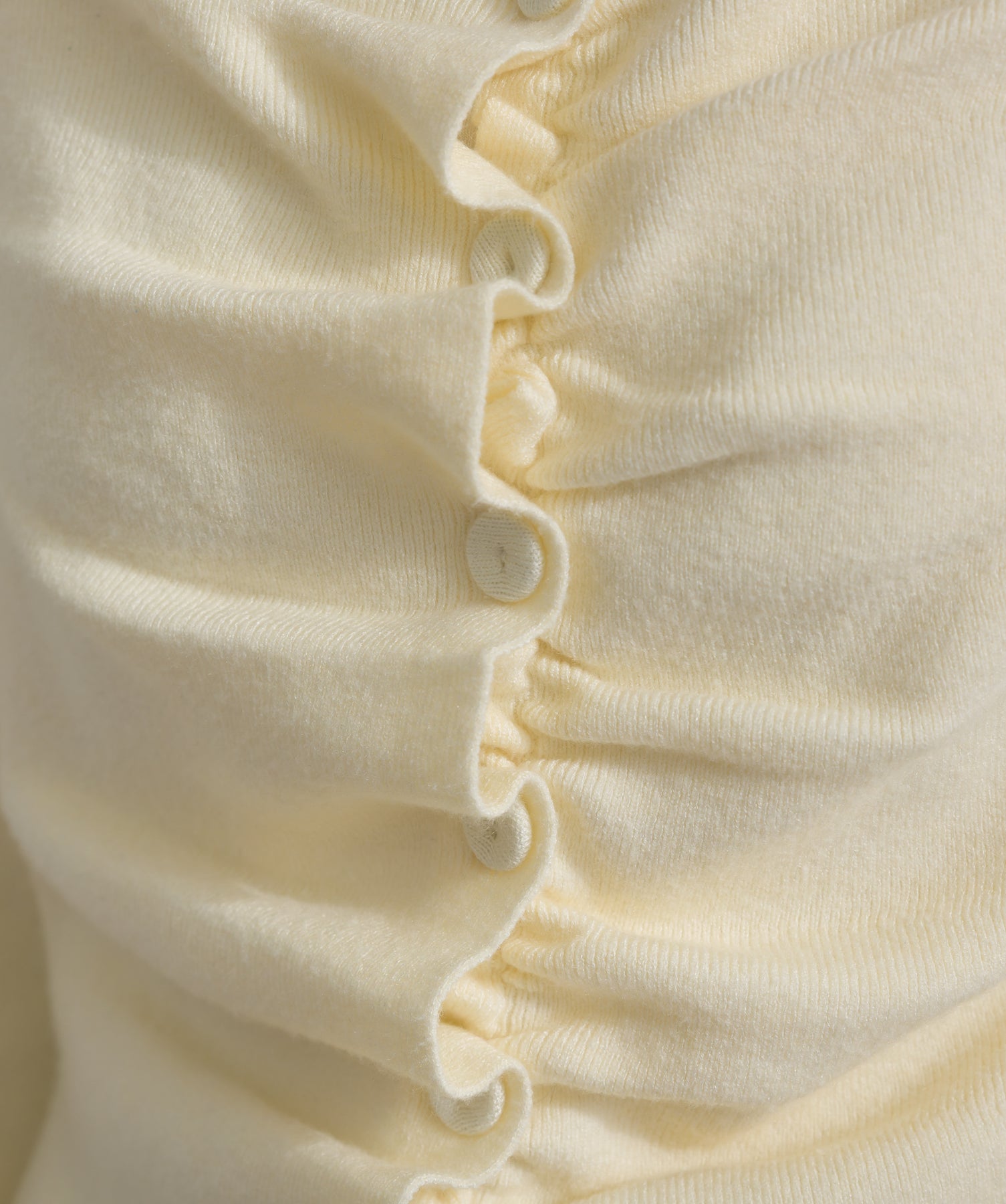 センシュアルに魅せる、計算されたギャザーデザイン。甘さ控えめ、なのにフェミニン。センターのギャザーが視線を引き寄せる、洗練カーディガン。-material-程よい厚みと柔らかさを備えたレーヨン混ニット素材を使用。ストレッチ性があり、心地よく身体にフィット。シーズンレスで着用できるライトな質感で、インナー使いにも活躍します。-design-フロントにあしらわれた大胆かつ繊細なギャザーが、豊かな陰影とリズムを生み出し、シンプルながらも奥行きのある表情を演出します。身体のラインを美しく魅せるコンパクトなシルエットで、ハイウエストのボトムスや、裾からレースを覗かせるレイヤードスタイルとも相性抜群。袖口はやや長めに設計され、手元にニュアンスを加えながら華奢見えも叶えます。大人の日常に洗練されたアクセントを加える一着です。