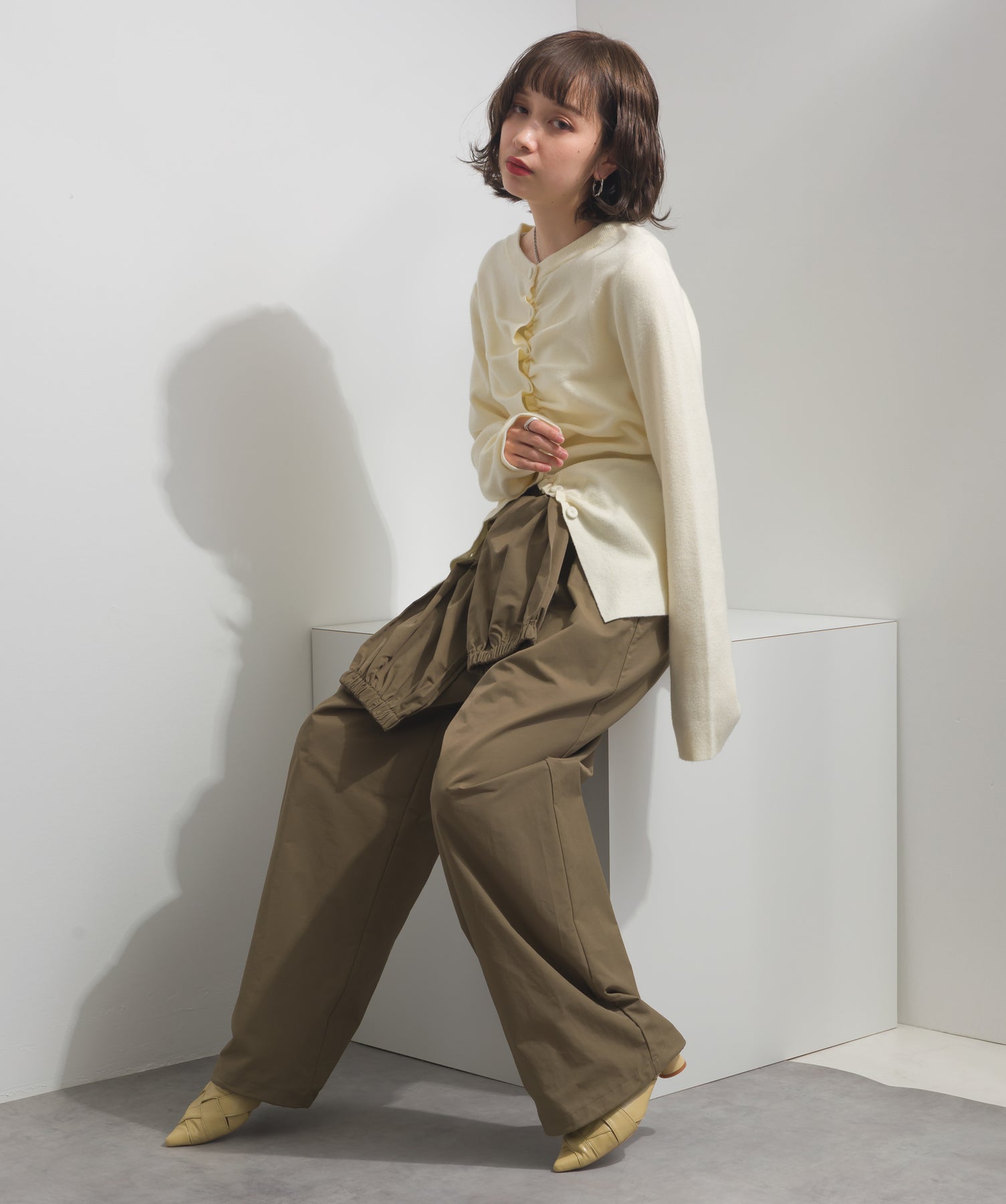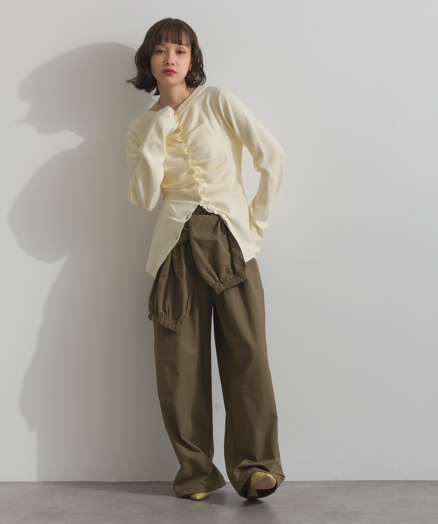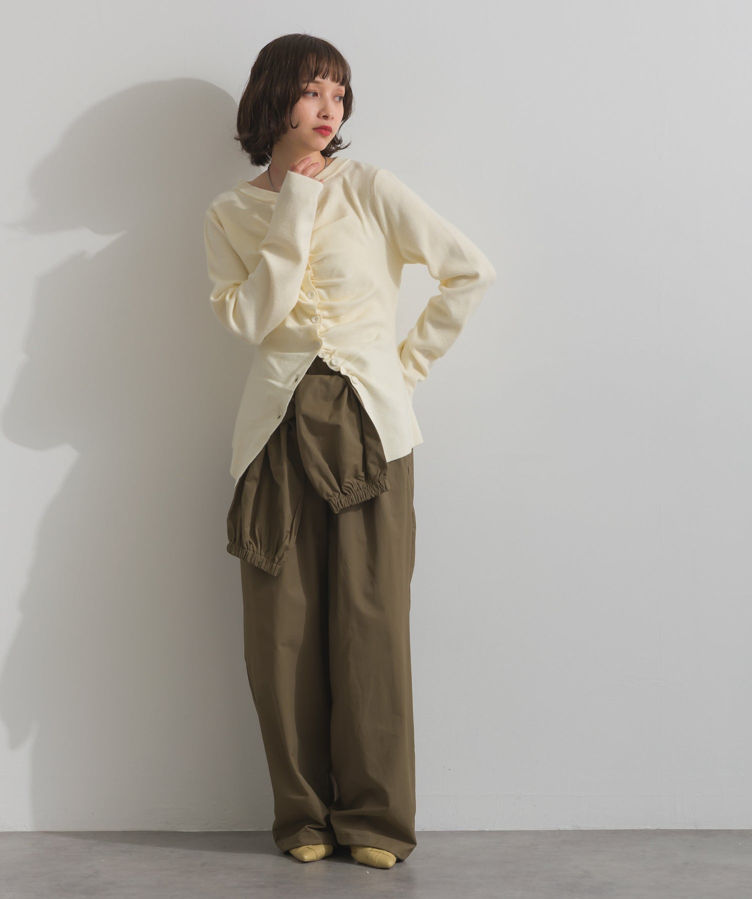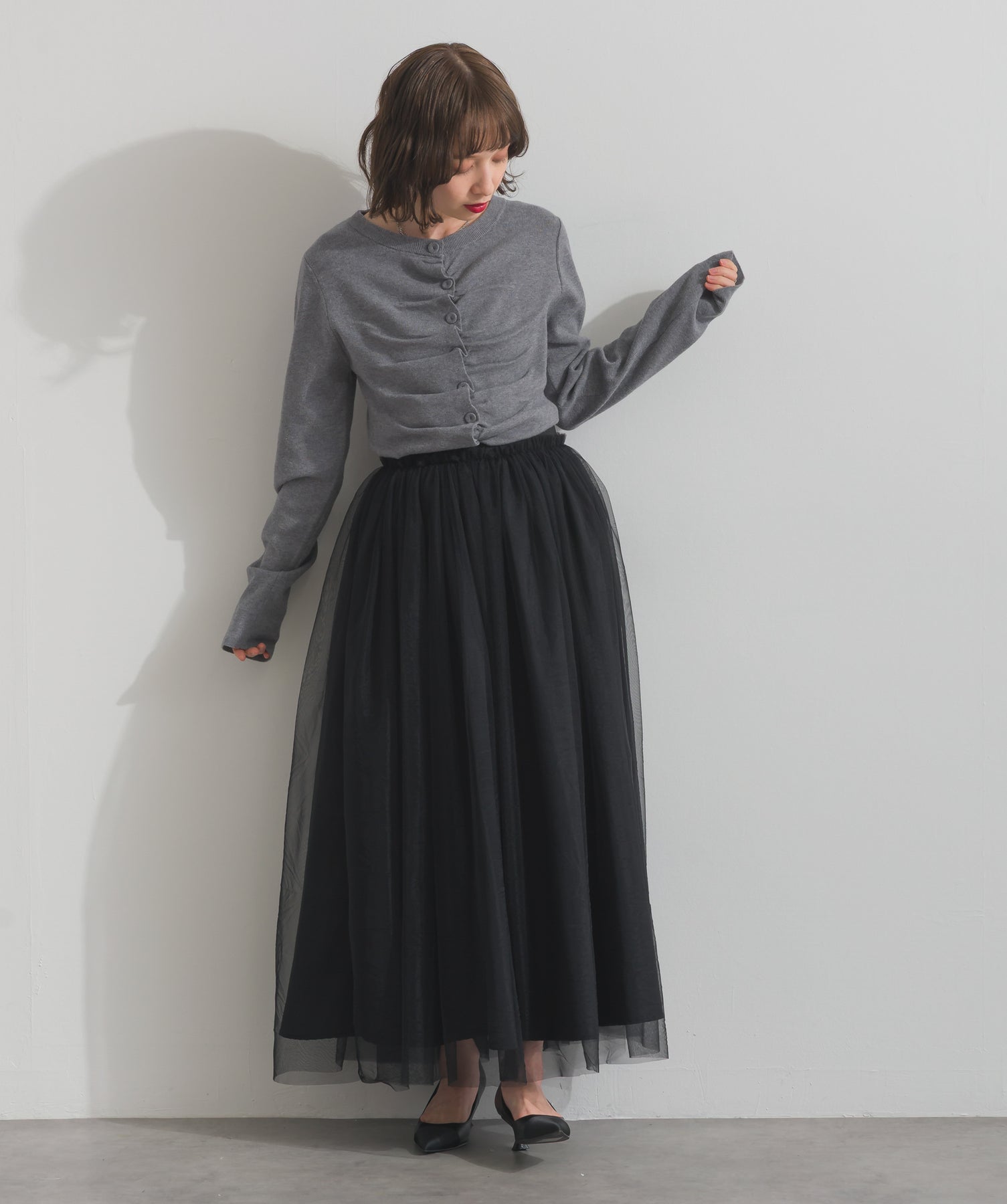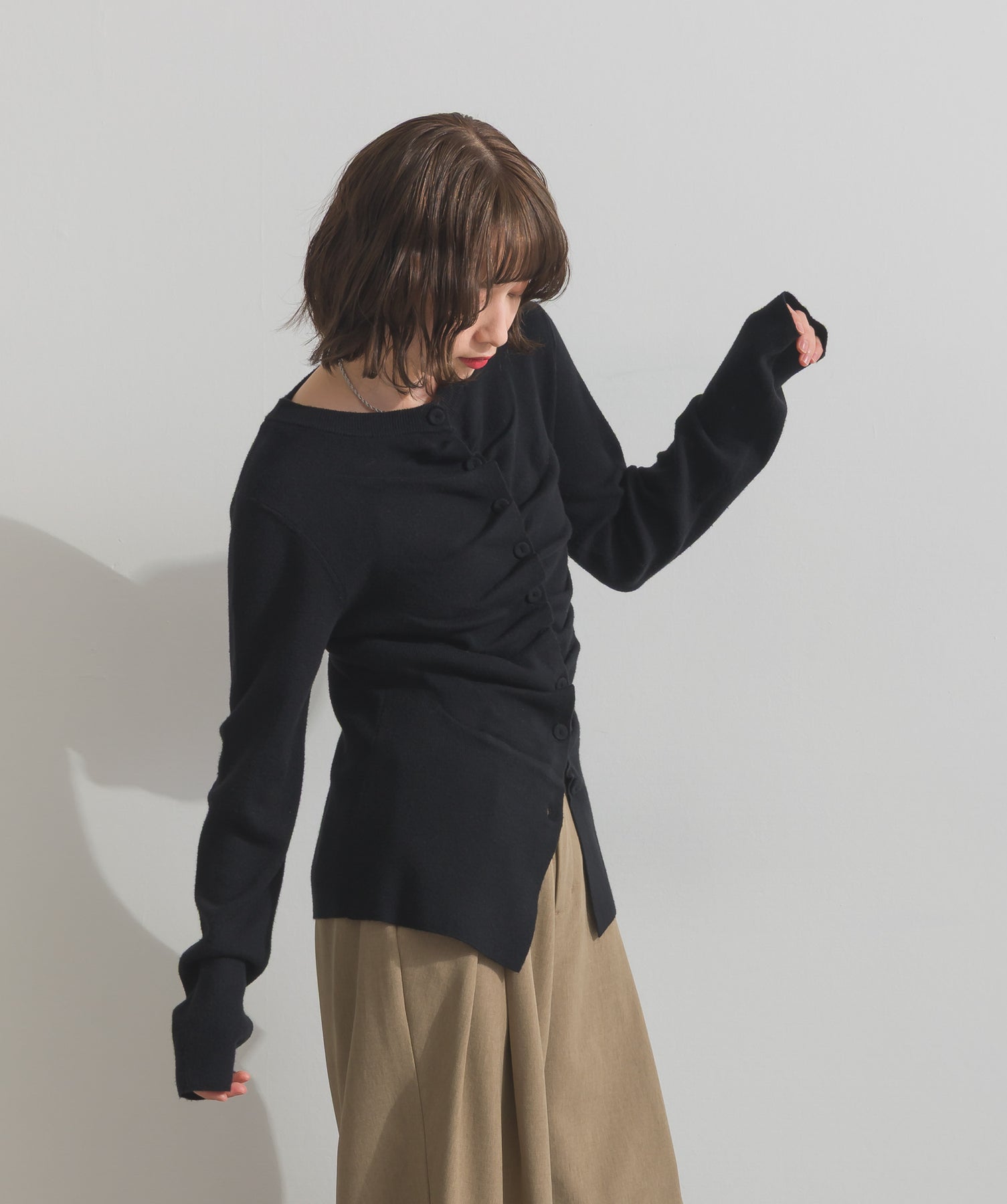 センシュアルに魅せる、計算されたギャザーデザイン。甘さ控えめ、なのにフェミニン。センターのギャザーが視線を引き寄せる、洗練カーディガン。-material-程よい厚みと柔らかさを備えたレーヨン混ニット素材を使用。ストレッチ性があり、心地よく身体にフィット。シーズンレスで着用できるライトな質感で、インナー使いにも活躍します。-design-フロントにあしらわれた大胆かつ繊細なギャザーが、豊かな陰影とリズムを生み出し、シンプルながらも奥行きのある表情を演出します。身体のラインを美しく魅せるコンパクトなシルエットで、ハイウエストのボトムスや、裾からレースを覗かせるレイヤードスタイルとも相性抜群。袖口はやや長めに設計され、手元にニュアンスを加えながら華奢見えも叶えます。大人の日常に洗練されたアクセントを加える一着です。