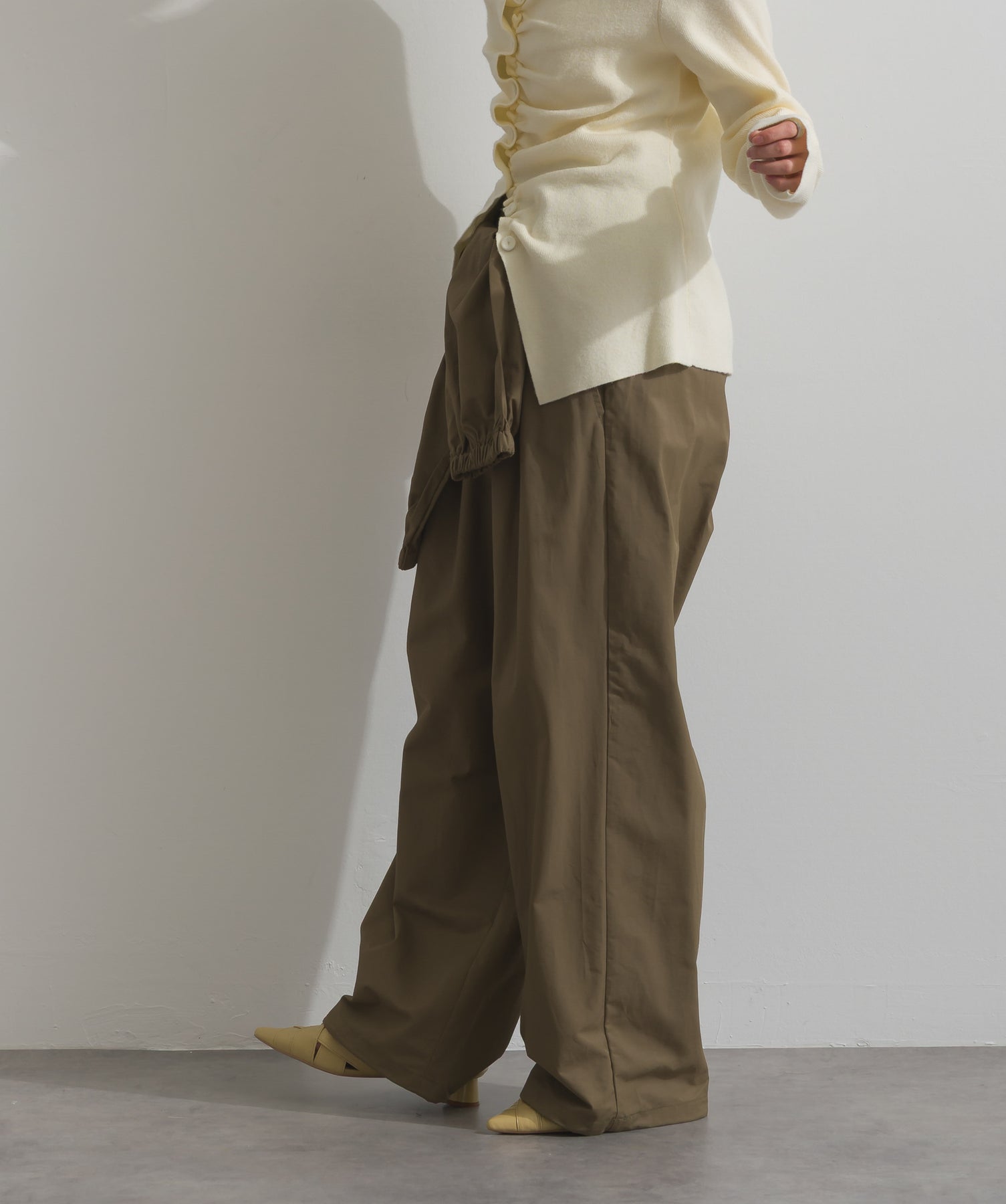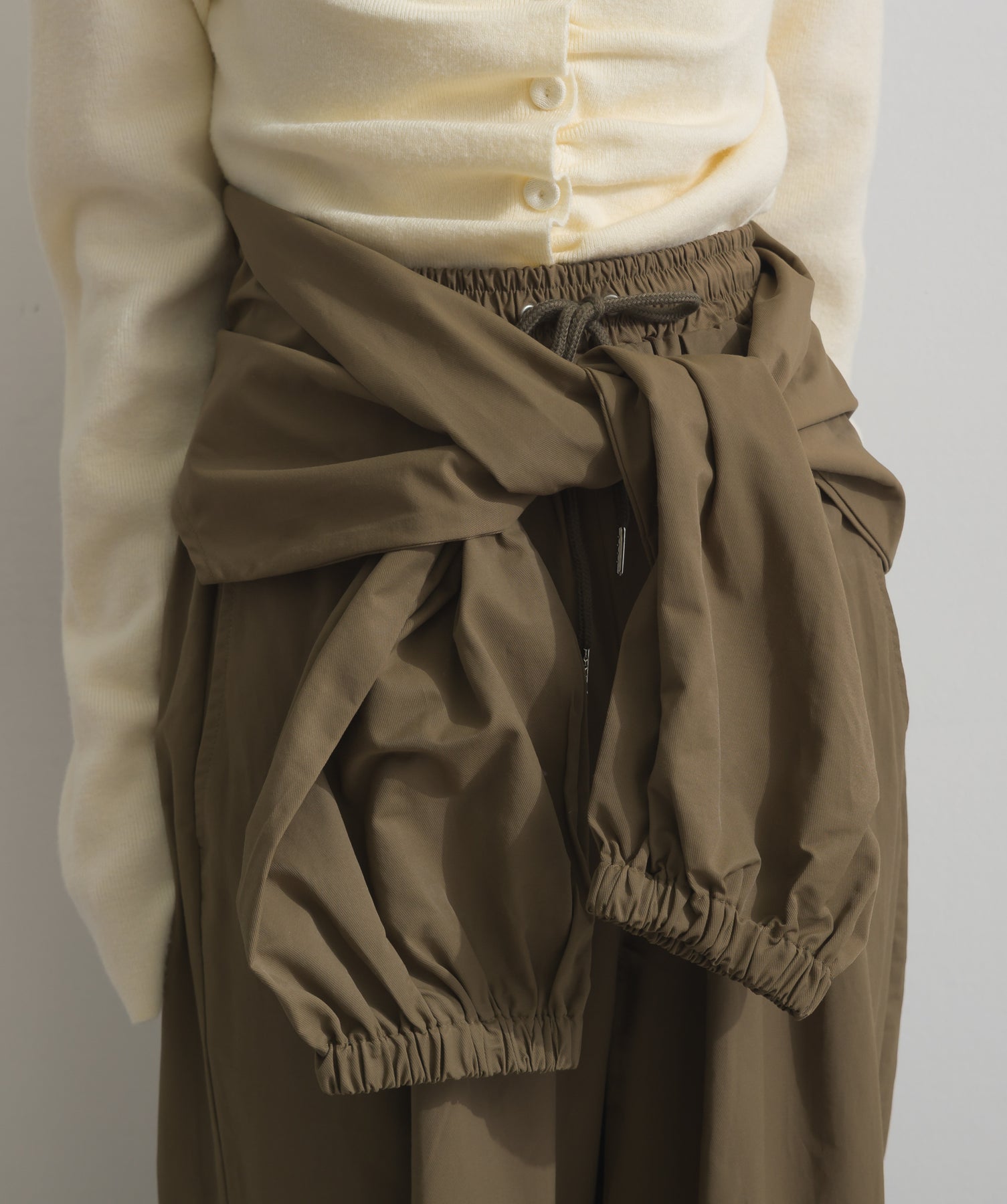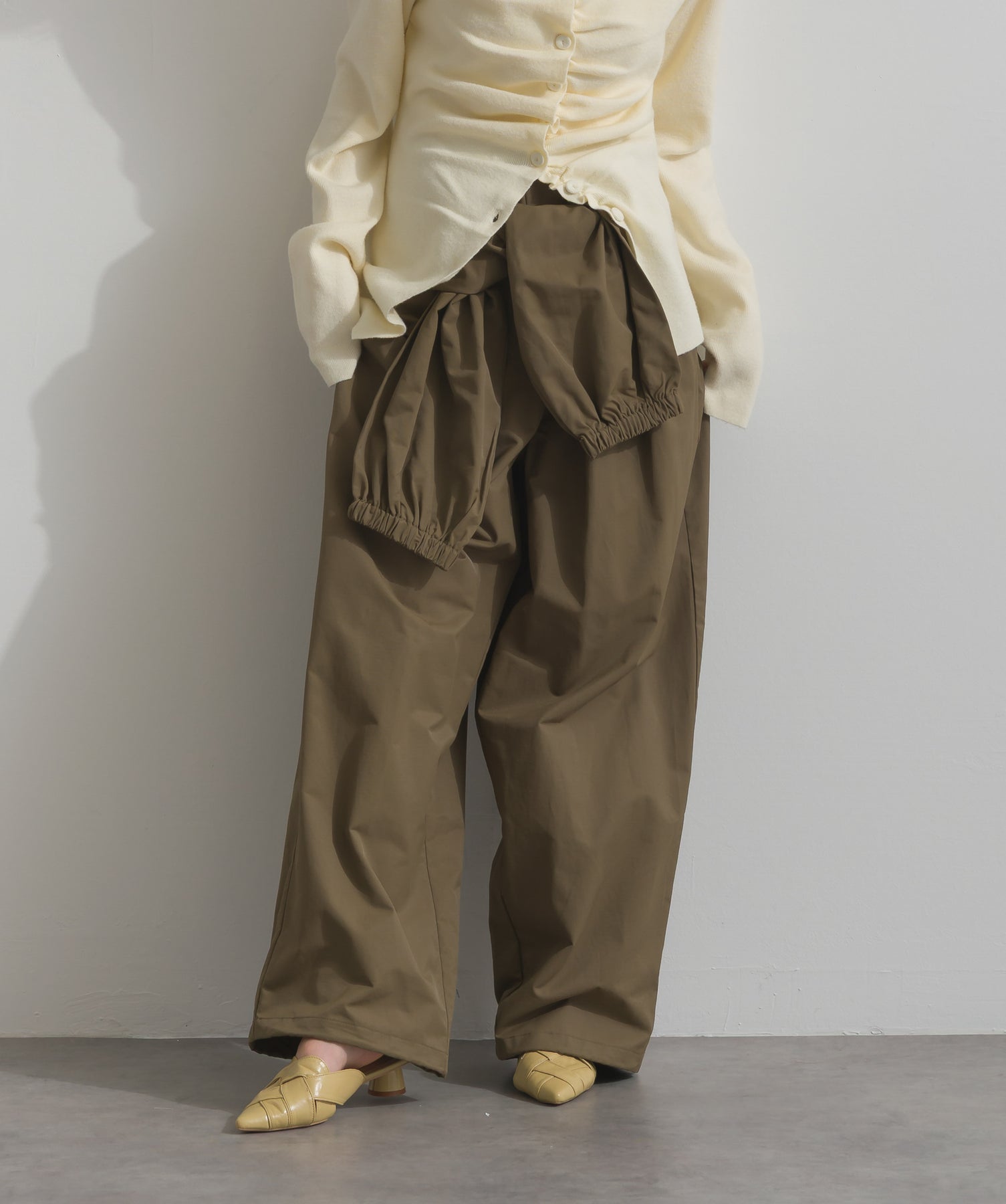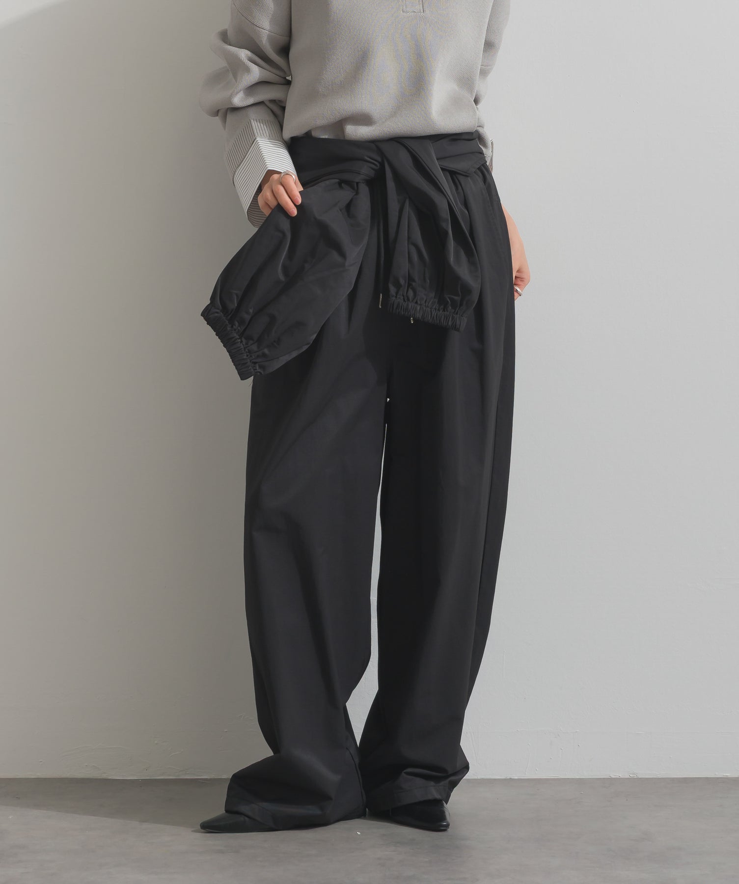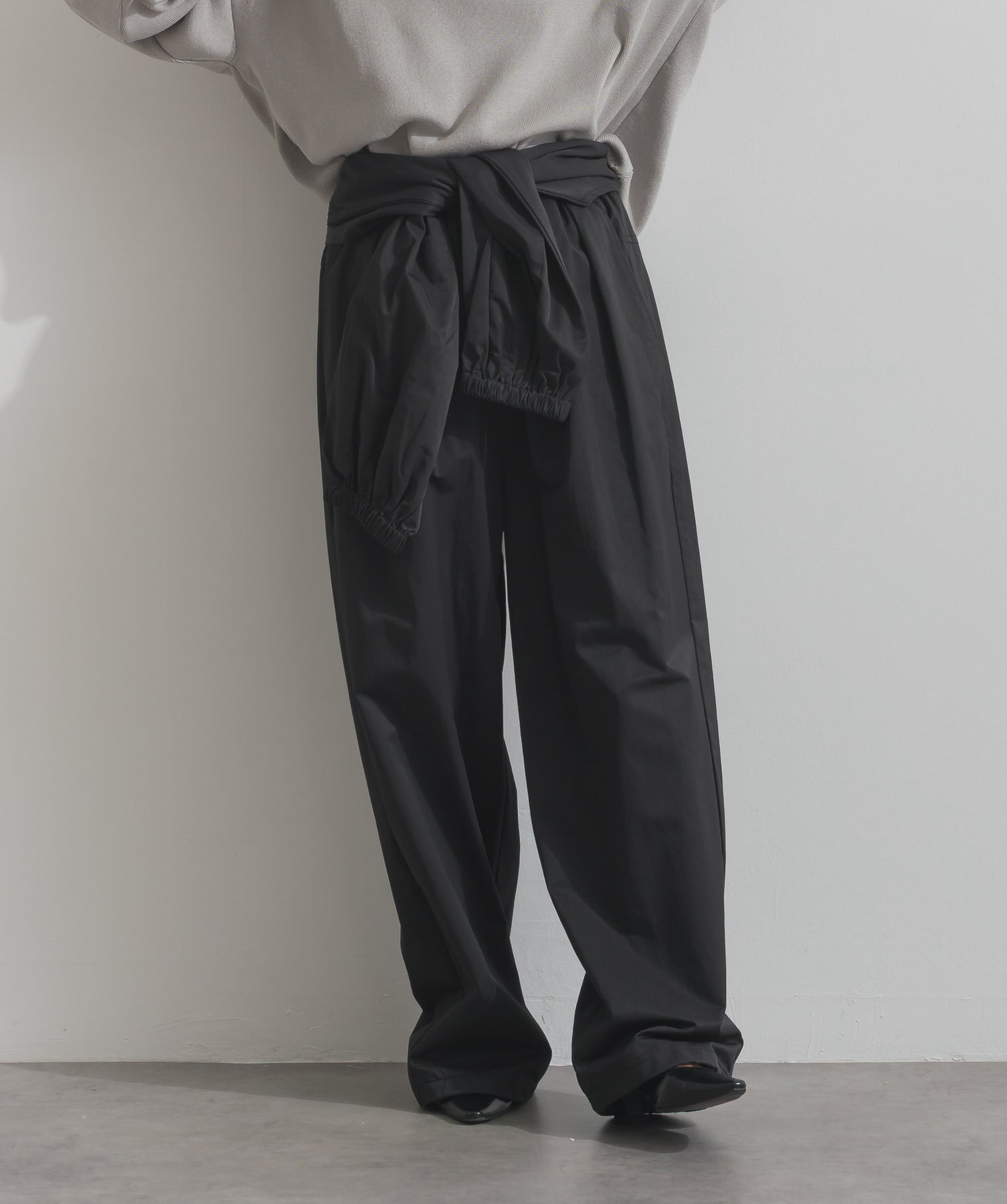 ひと巻きで差がつく。アーバンムードな主役ワイド。腰にラフに巻いた“袖”のようなディテールがアクセント。シンプルな中にエッジを効かせた、感度高めのデザインボトム。-material-軽量でハリのある合繊ツイル素材を使用。さらりとした肌触りでシーズンレスに着用可能。動きやすく、シワになりにくい機能性も備えた高バランス素材で、きれいめにもカジュアルにもマッチします。-design-ウエスト部分に、まるでトップスの袖を腰巻きしたかのようなディテールをあしらった遊び心のあるデザインが最大の特徴。スタイリングに奥行きを生み出す立体的なアクセントが、シンプルなコーディネートを一気にモードへと引き上げます。