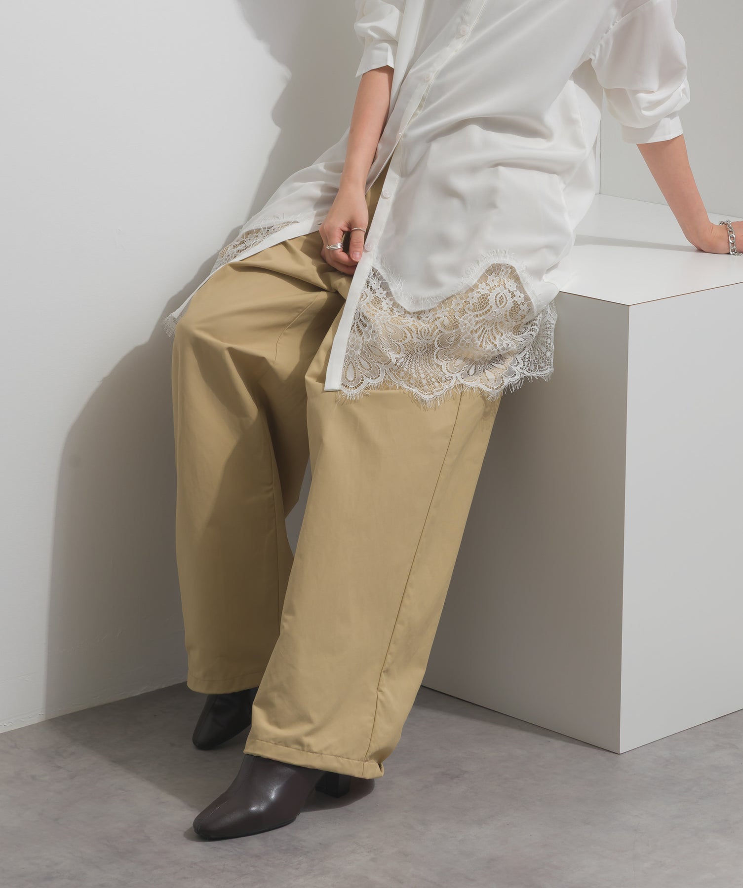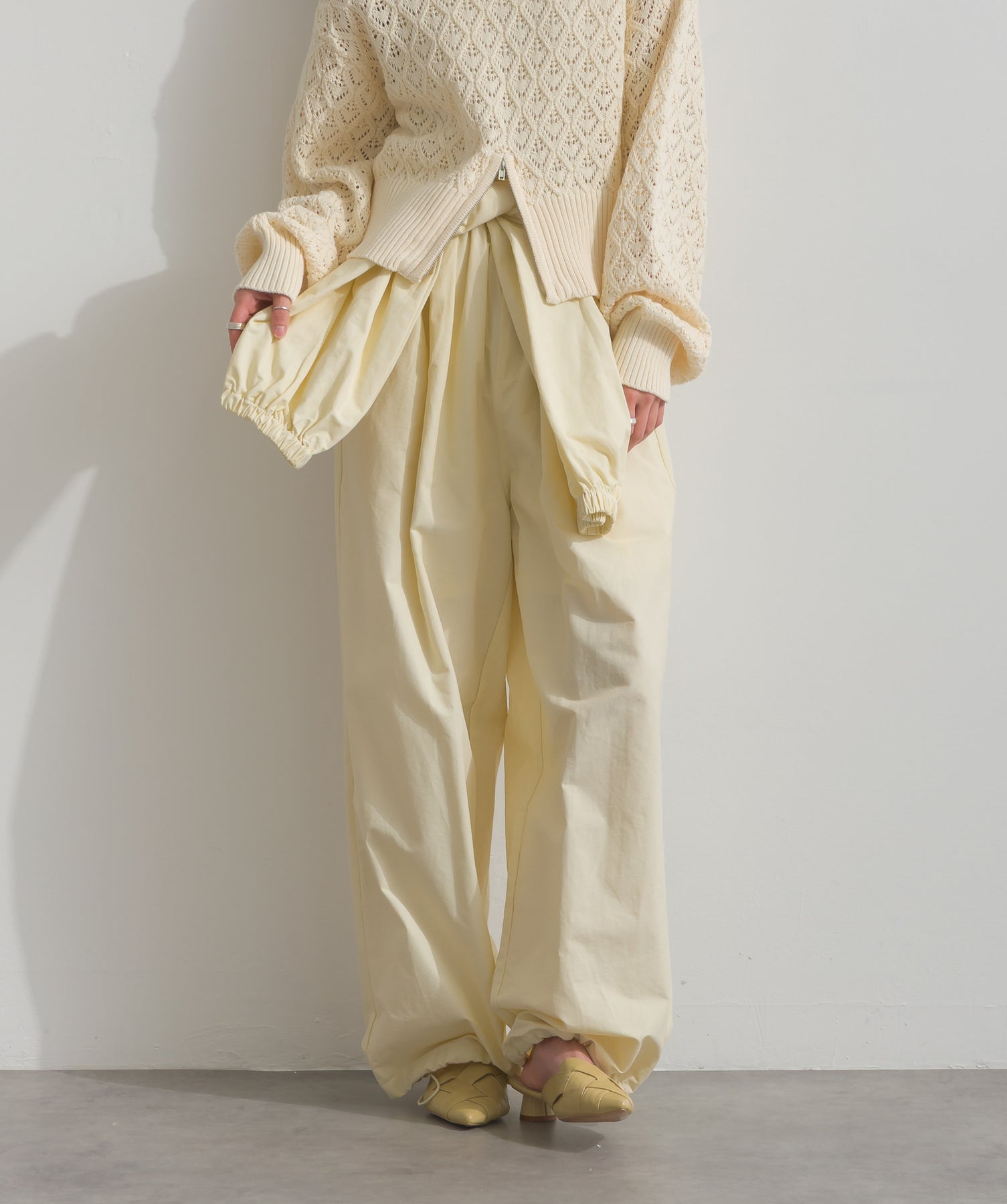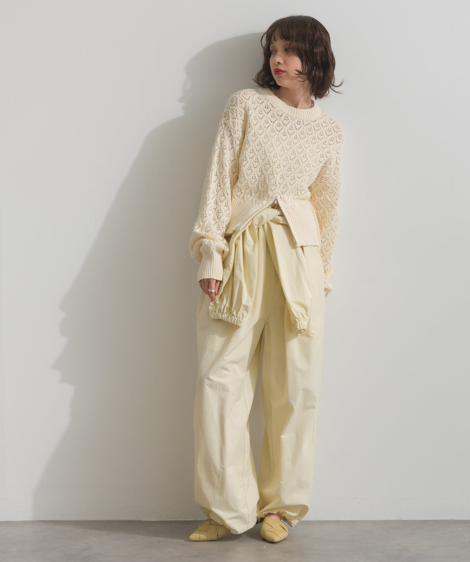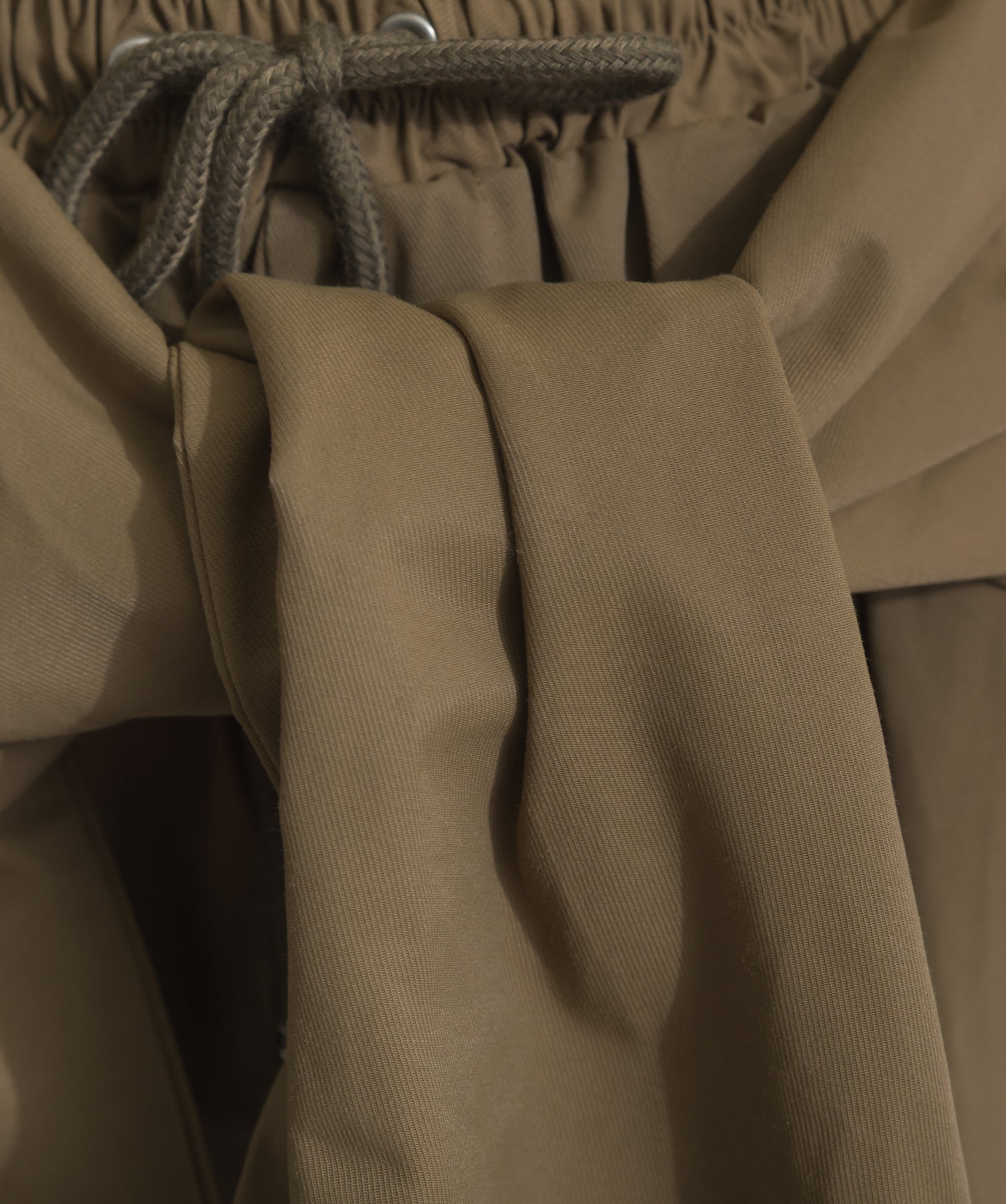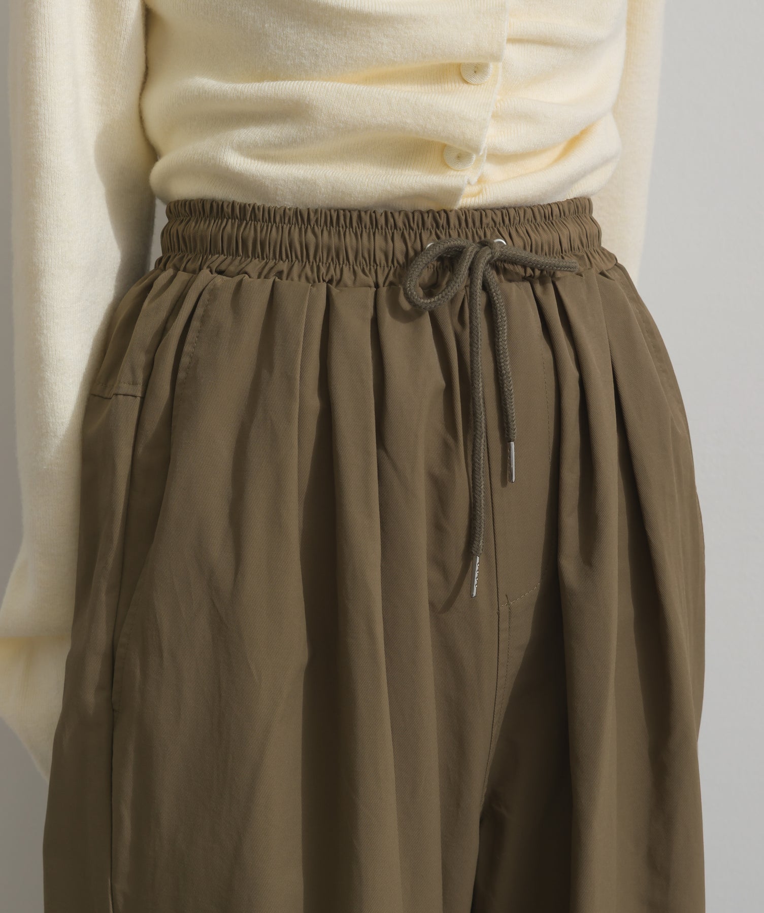 ひと巻きで差がつく。アーバンムードな主役ワイド。腰にラフに巻いた“袖”のようなディテールがアクセント。シンプルな中にエッジを効かせた、感度高めのデザインボトム。-material-軽量でハリのある合繊ツイル素材を使用。さらりとした肌触りでシーズンレスに着用可能。動きやすく、シワになりにくい機能性も備えた高バランス素材で、きれいめにもカジュアルにもマッチします。-design-ウエスト部分に、まるでトップスの袖を腰巻きしたかのようなディテールをあしらった遊び心のあるデザインが最大の特徴。スタイリングに奥行きを生み出す立体的なアクセントが、シンプルなコーディネートを一気にモードへと引き上げます。