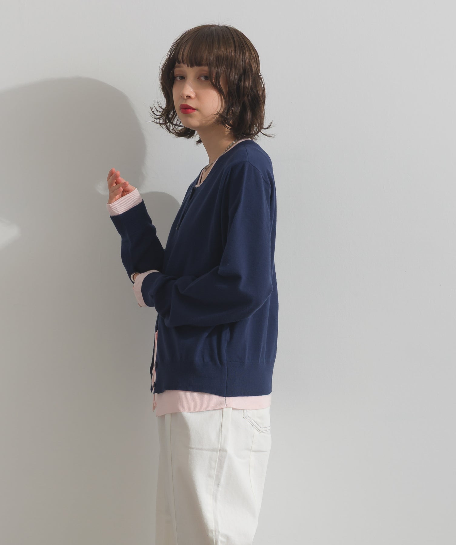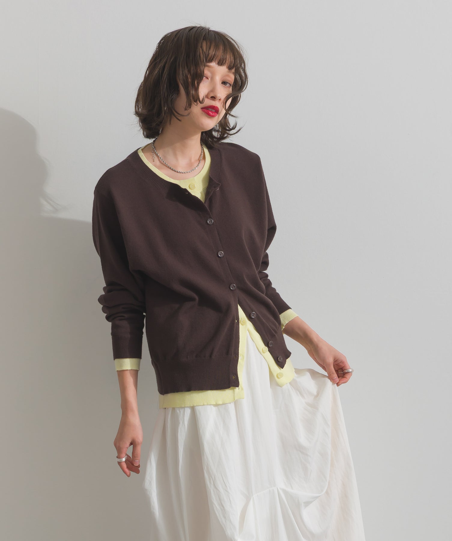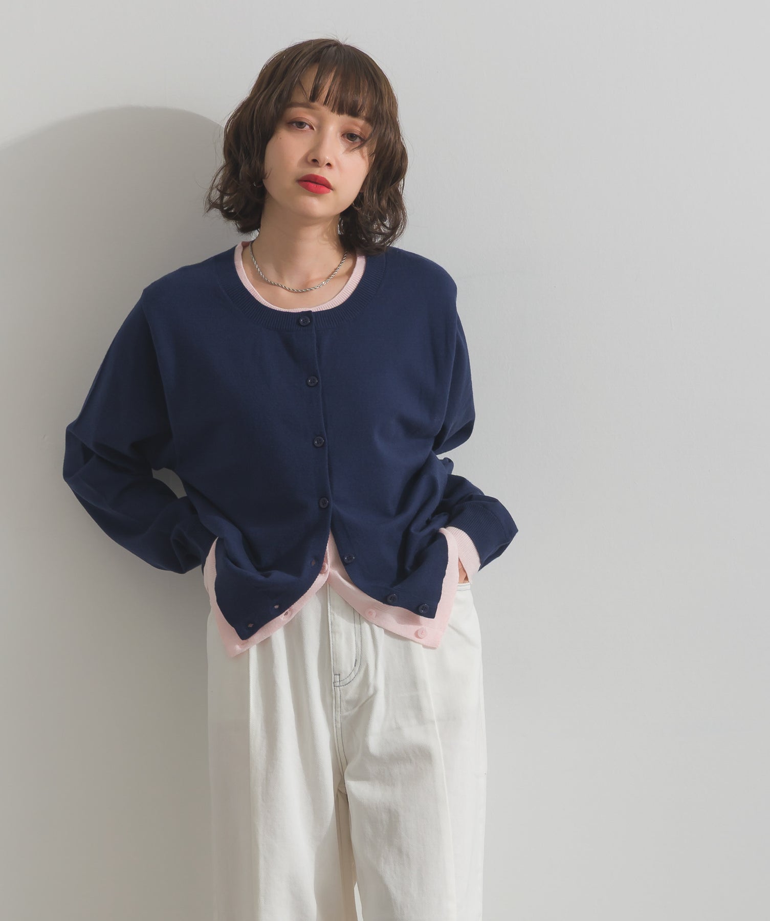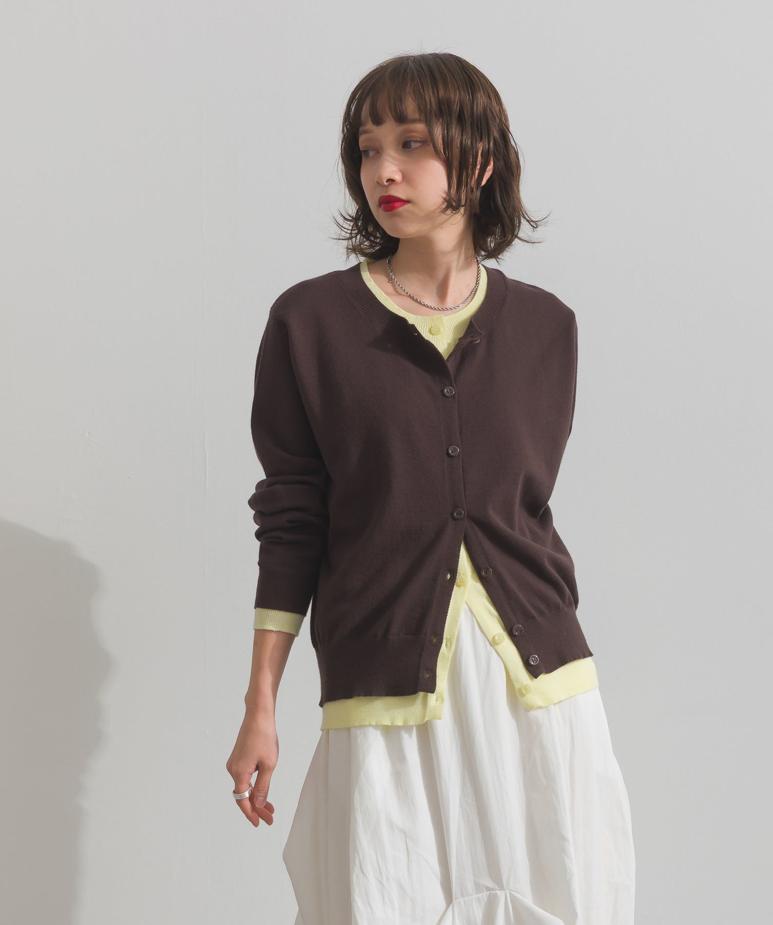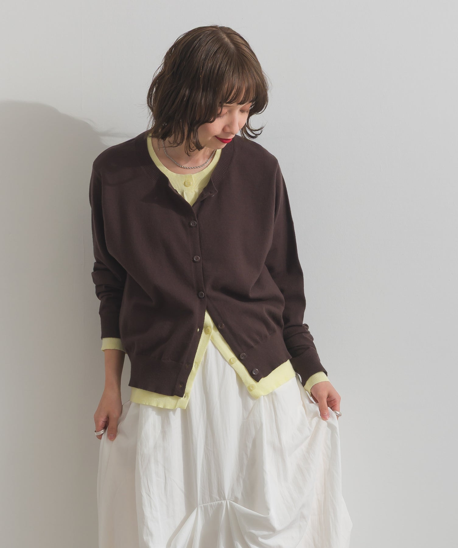 重ね着風ディテールで、シンプルに差がつく一枚。レイヤードしたような配色ラインが効いた、品よく遊べる大人のニットカーデ。-material-滑らかでしっとりとした風合いのレーヨン混ニット素材を採用。伸縮性に優れ、ストレスのない着心地を実現。ほどよい厚みでロングシーズン活躍し、肌寒い季節にはインナーとしても着用可能な万能素材。-design-裾・袖・襟元に異なるカラーをあしらい、レイヤードしているかのようなこなれたデザインがポイント。シンプルなクルーネックとコンパクトすぎないサイズ感で、スカートにもパンツにも合わせやすいシルエット。羽織としてはもちろん、ボタンを留めてトップス感覚でも使える一枚。カラーによって印象が変わり、ベーシックから遊び心ある配色までラインナップ。