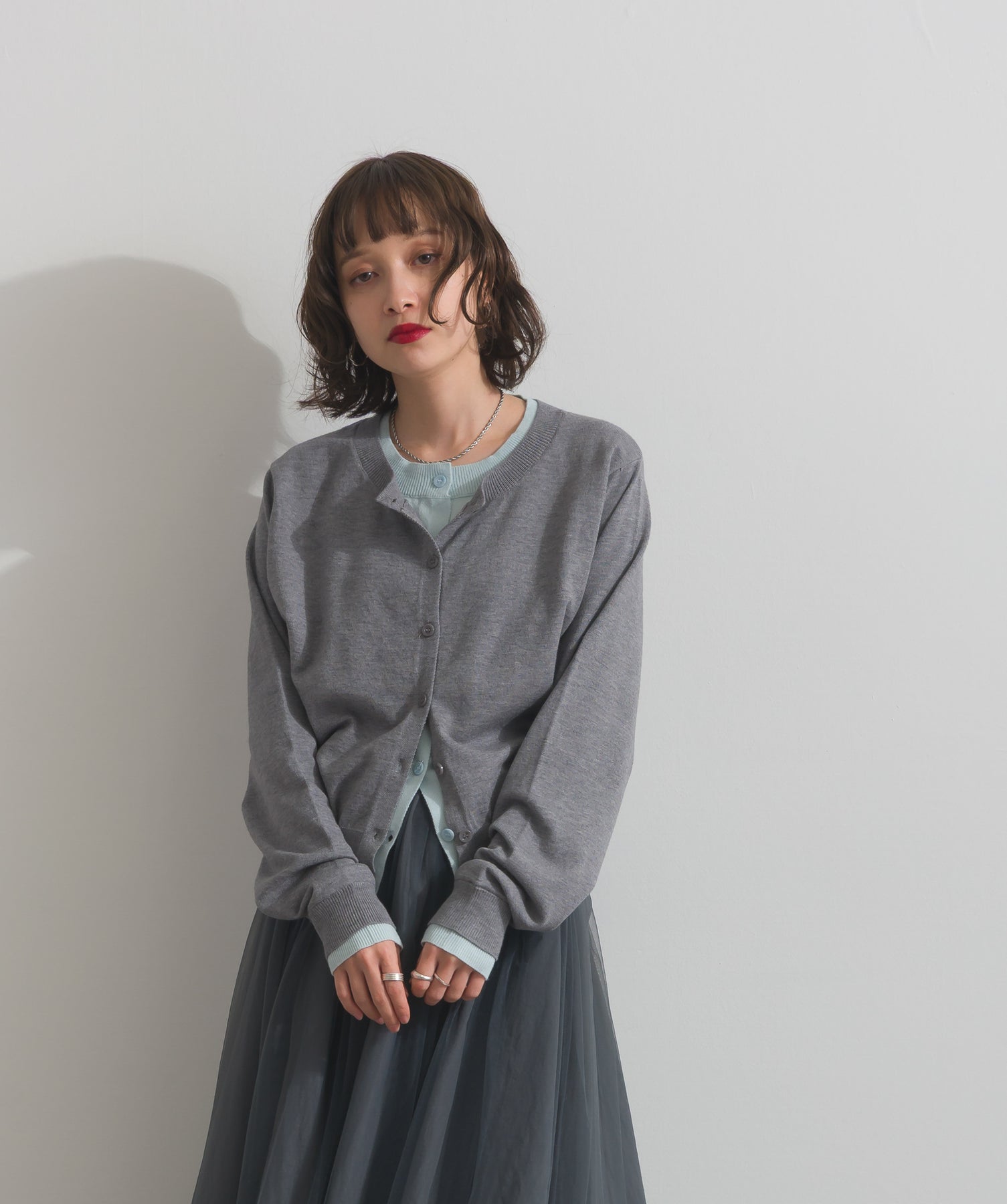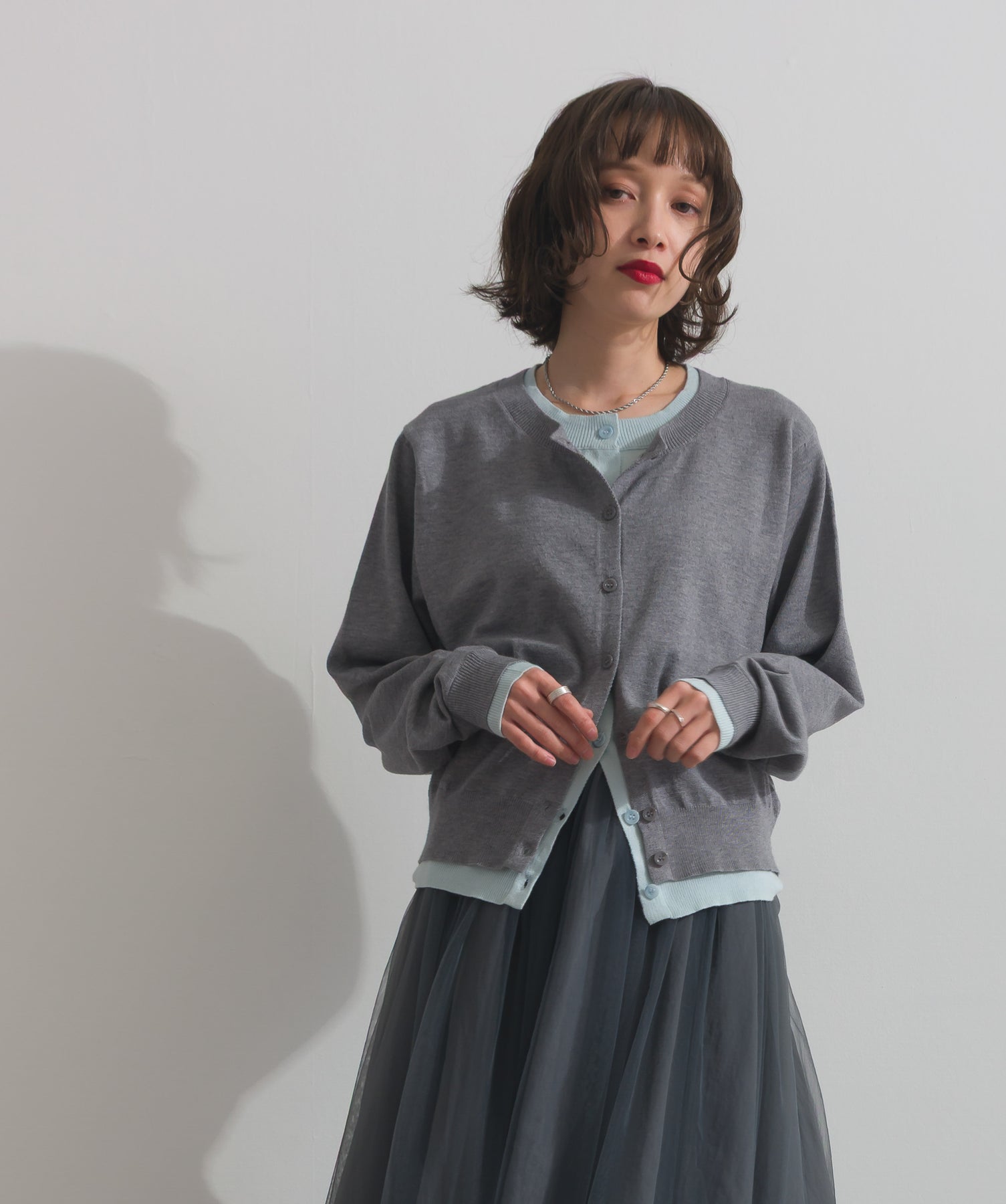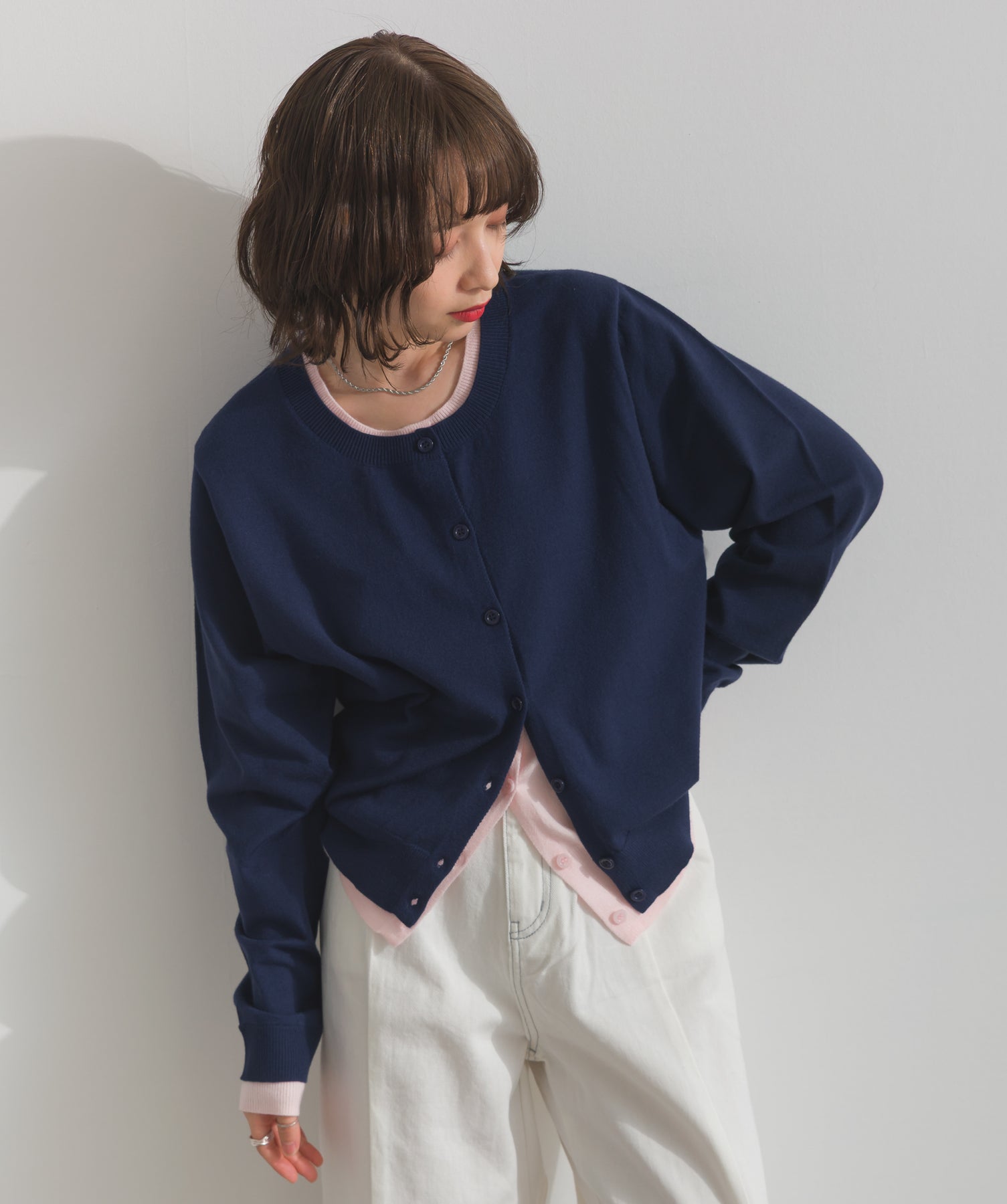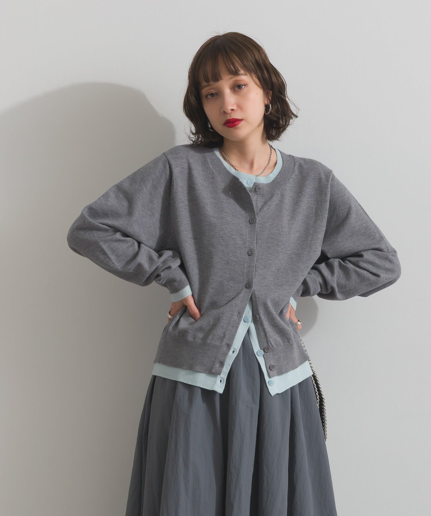 重ね着風ディテールで、シンプルに差がつく一枚。レイヤードしたような配色ラインが効いた、品よく遊べる大人のニットカーデ。-material-滑らかでしっとりとした風合いのレーヨン混ニット素材を採用。伸縮性に優れ、ストレスのない着心地を実現。ほどよい厚みでロングシーズン活躍し、肌寒い季節にはインナーとしても着用可能な万能素材。-design-裾・袖・襟元に異なるカラーをあしらい、レイヤードしているかのようなこなれたデザインがポイント。シンプルなクルーネックとコンパクトすぎないサイズ感で、スカートにもパンツにも合わせやすいシルエット。羽織としてはもちろん、ボタンを留めてトップス感覚でも使える一枚。カラーによって印象が変わり、ベーシックから遊び心ある配色までラインナップ。