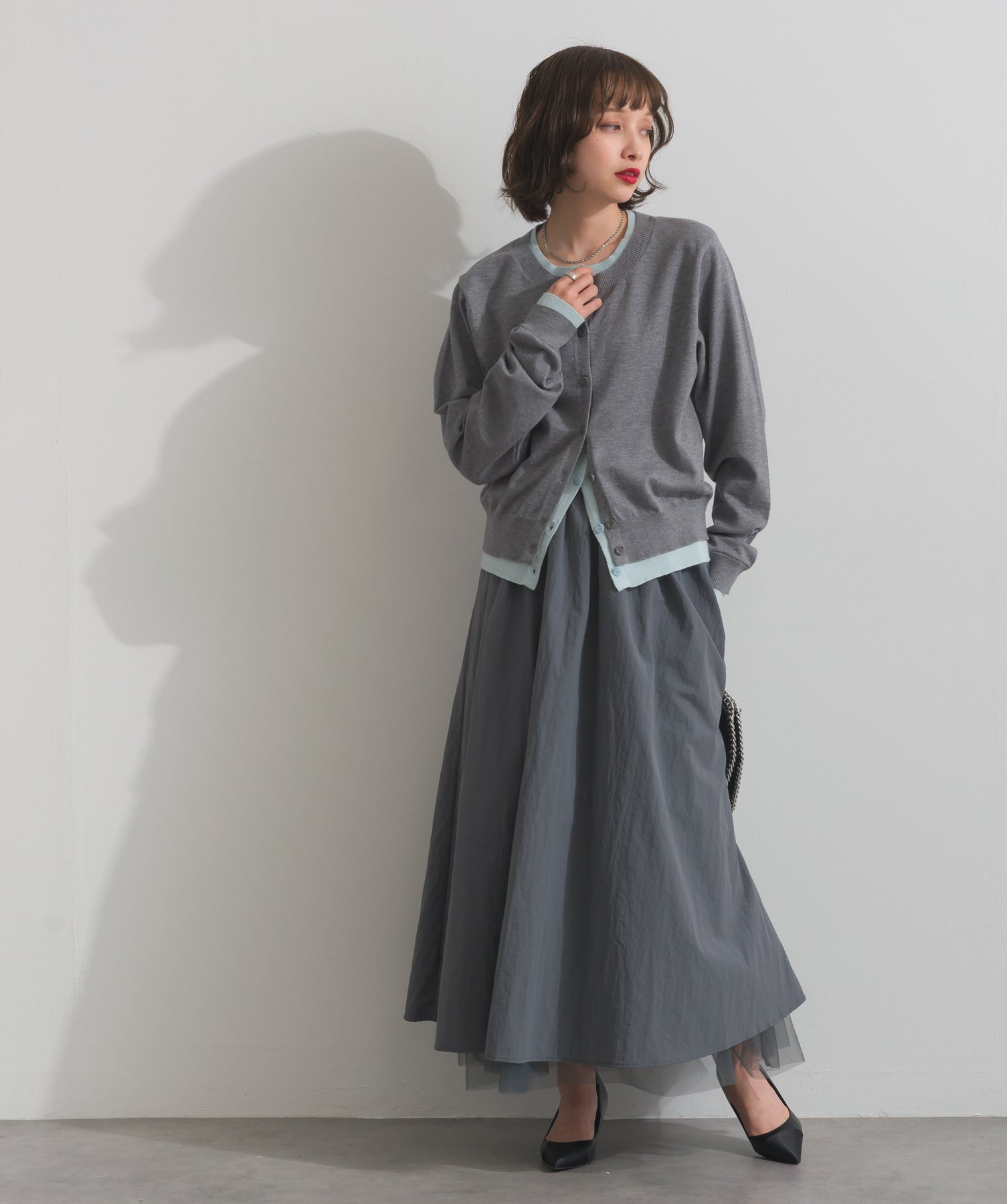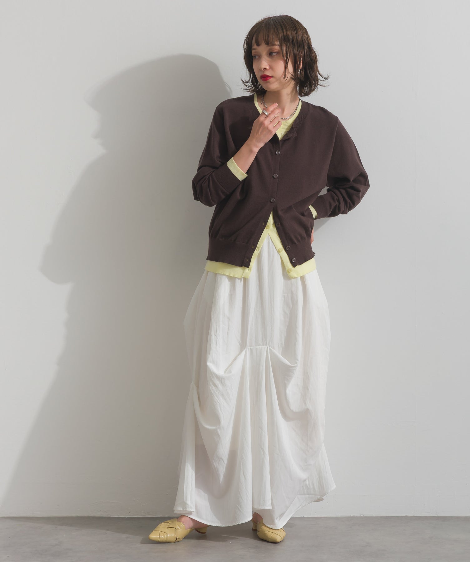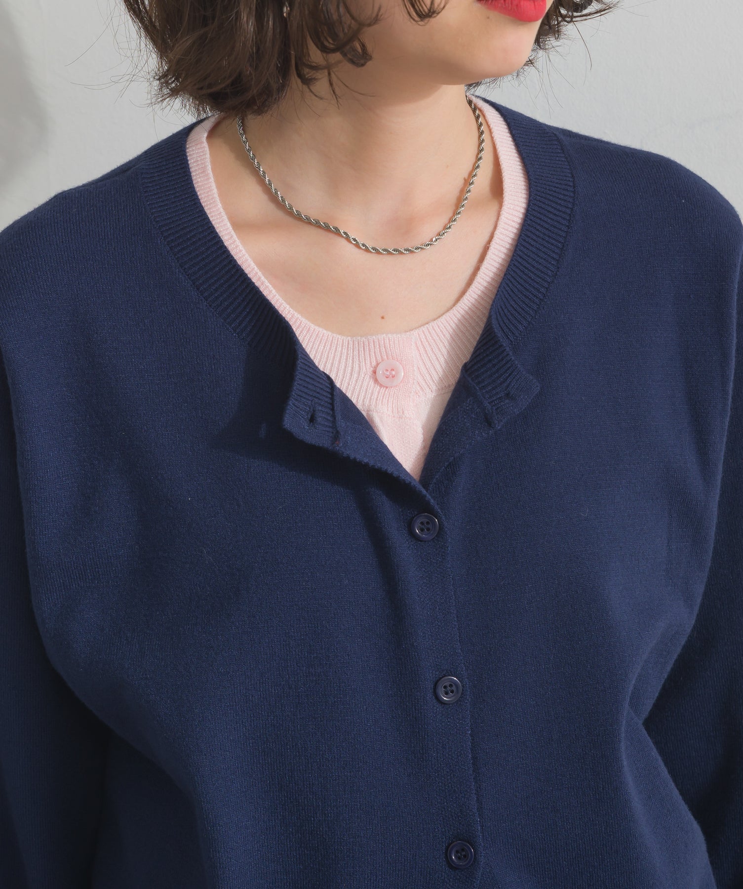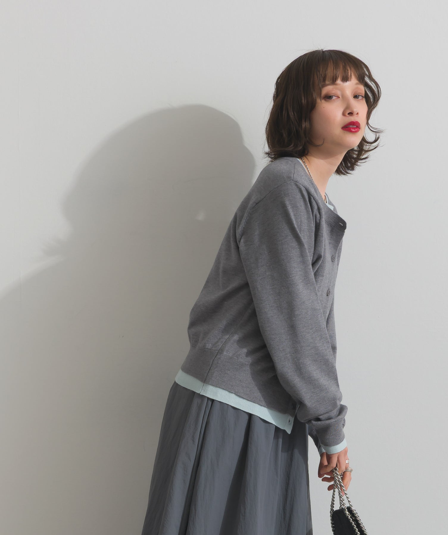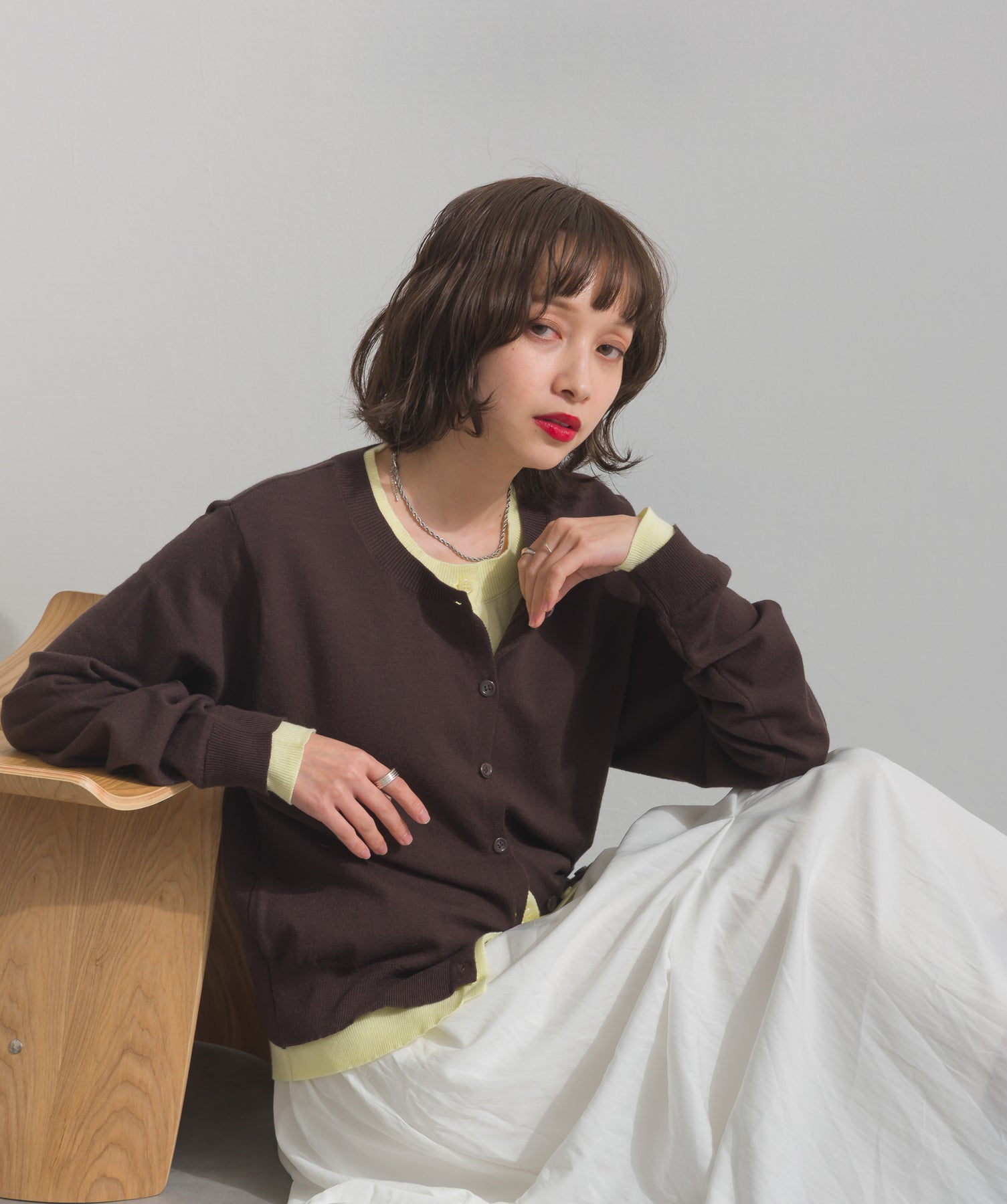 重ね着風ディテールで、シンプルに差がつく一枚。レイヤードしたような配色ラインが効いた、品よく遊べる大人のニットカーデ。-material-滑らかでしっとりとした風合いのレーヨン混ニット素材を採用。伸縮性に優れ、ストレスのない着心地を実現。ほどよい厚みでロングシーズン活躍し、肌寒い季節にはインナーとしても着用可能な万能素材。-design-裾・袖・襟元に異なるカラーをあしらい、レイヤードしているかのようなこなれたデザインがポイント。シンプルなクルーネックとコンパクトすぎないサイズ感で、スカートにもパンツにも合わせやすいシルエット。羽織としてはもちろん、ボタンを留めてトップス感覚でも使える一枚。カラーによって印象が変わり、ベーシックから遊び心ある配色までラインナップ。