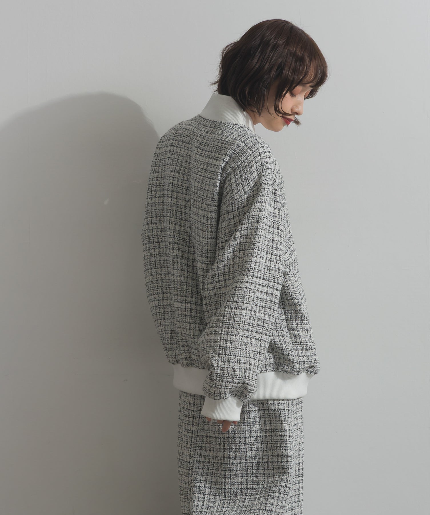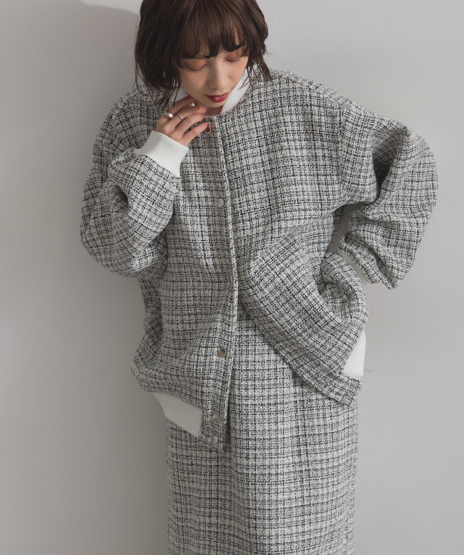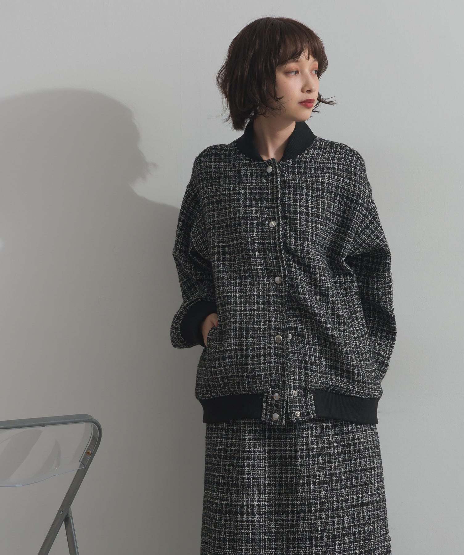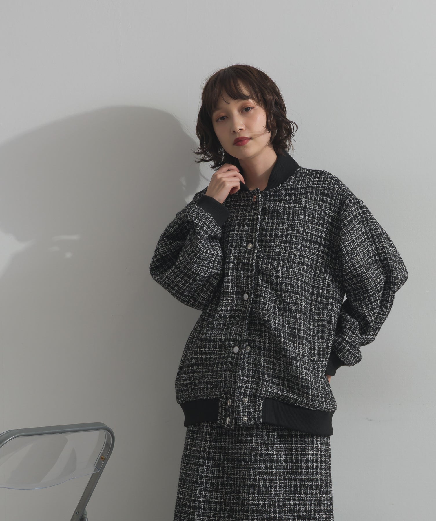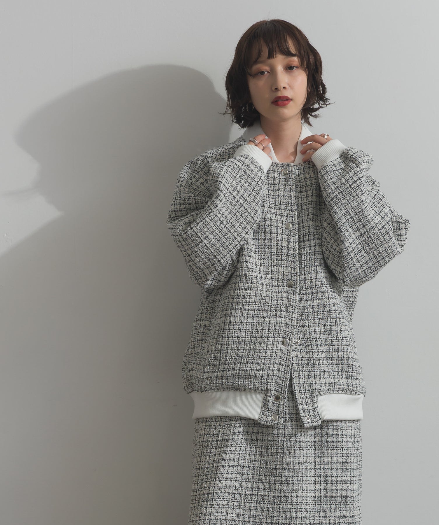 クラシカルを纏う、新感覚スタジャン。-material-上品な表情を演出するツイード調生地を使用。しっかりとした肉感がありながらも軽やかな着心地で、秋冬の羽織として活躍。リブ部分には伸縮性のあるニットを採用し、保温性と快適な着用感を両立。-design-クラシックなスタジャンを、ツイード素材で都会的にアップデート。ゆとりのあるシルエットと腰回りまで隠れる絶妙な丈感で、モードな抜け感を演出。フロントのボタンや裾リブの切り替えがアクセントとなり、セットアップでの着用はもちろん、デニムやスラックスとも好相性。スタイリングに品と存在感をプラスする主役級アウター。