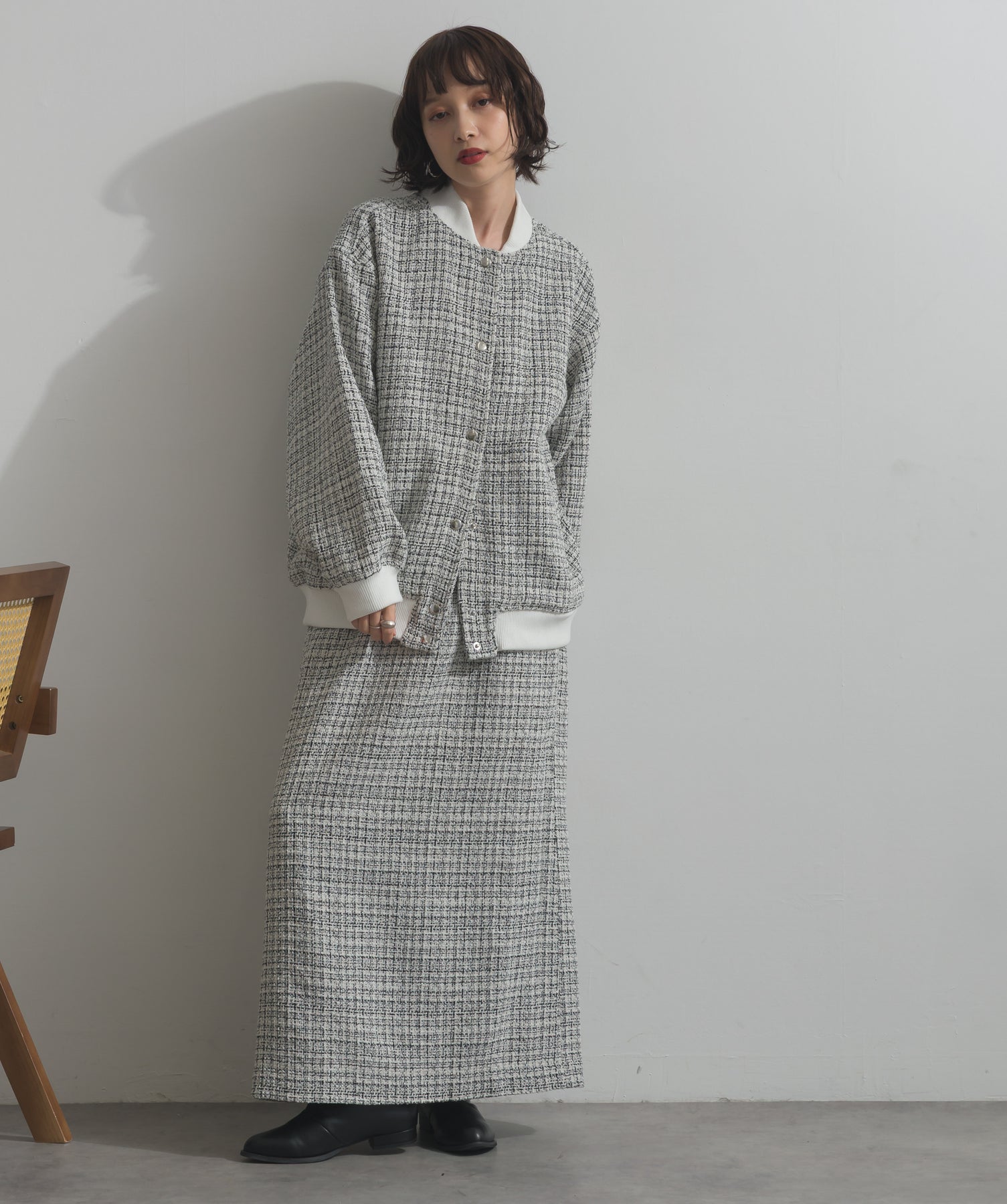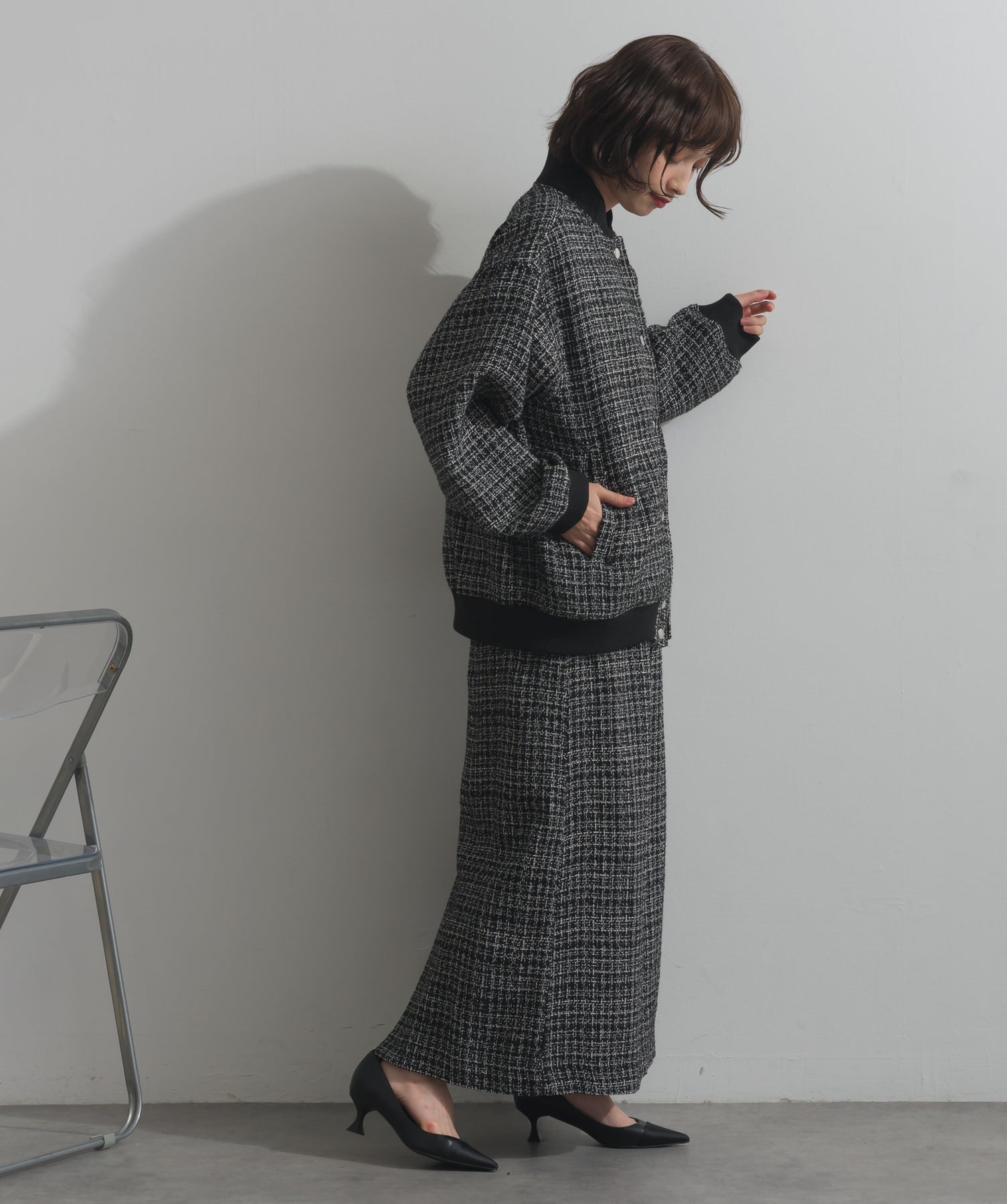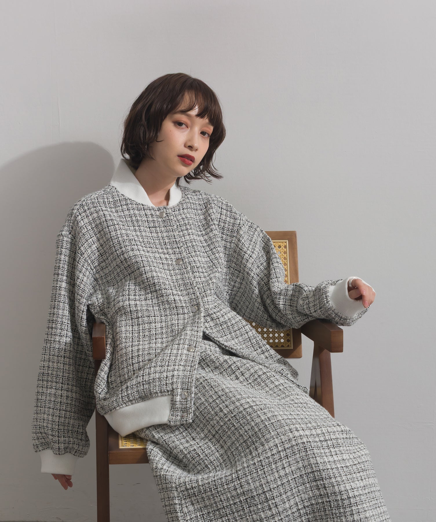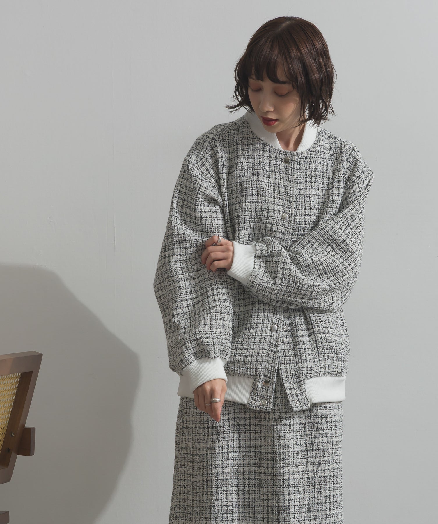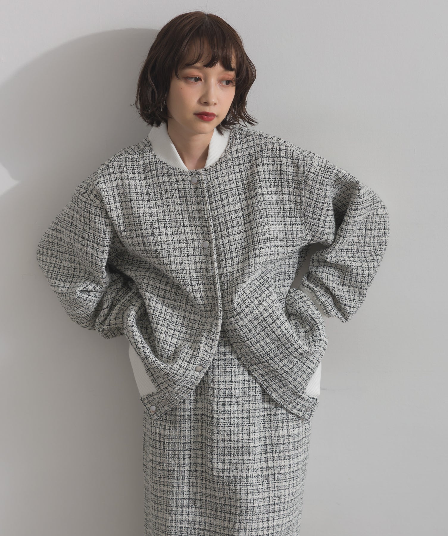 クラシカルを纏う、新感覚スタジャン。-material-上品な表情を演出するツイード調生地を使用。しっかりとした肉感がありながらも軽やかな着心地で、秋冬の羽織として活躍。リブ部分には伸縮性のあるニットを採用し、保温性と快適な着用感を両立。-design-クラシックなスタジャンを、ツイード素材で都会的にアップデート。ゆとりのあるシルエットと腰回りまで隠れる絶妙な丈感で、モードな抜け感を演出。フロントのボタンや裾リブの切り替えがアクセントとなり、セットアップでの着用はもちろん、デニムやスラックスとも好相性。スタイリングに品と存在感をプラスする主役級アウター。