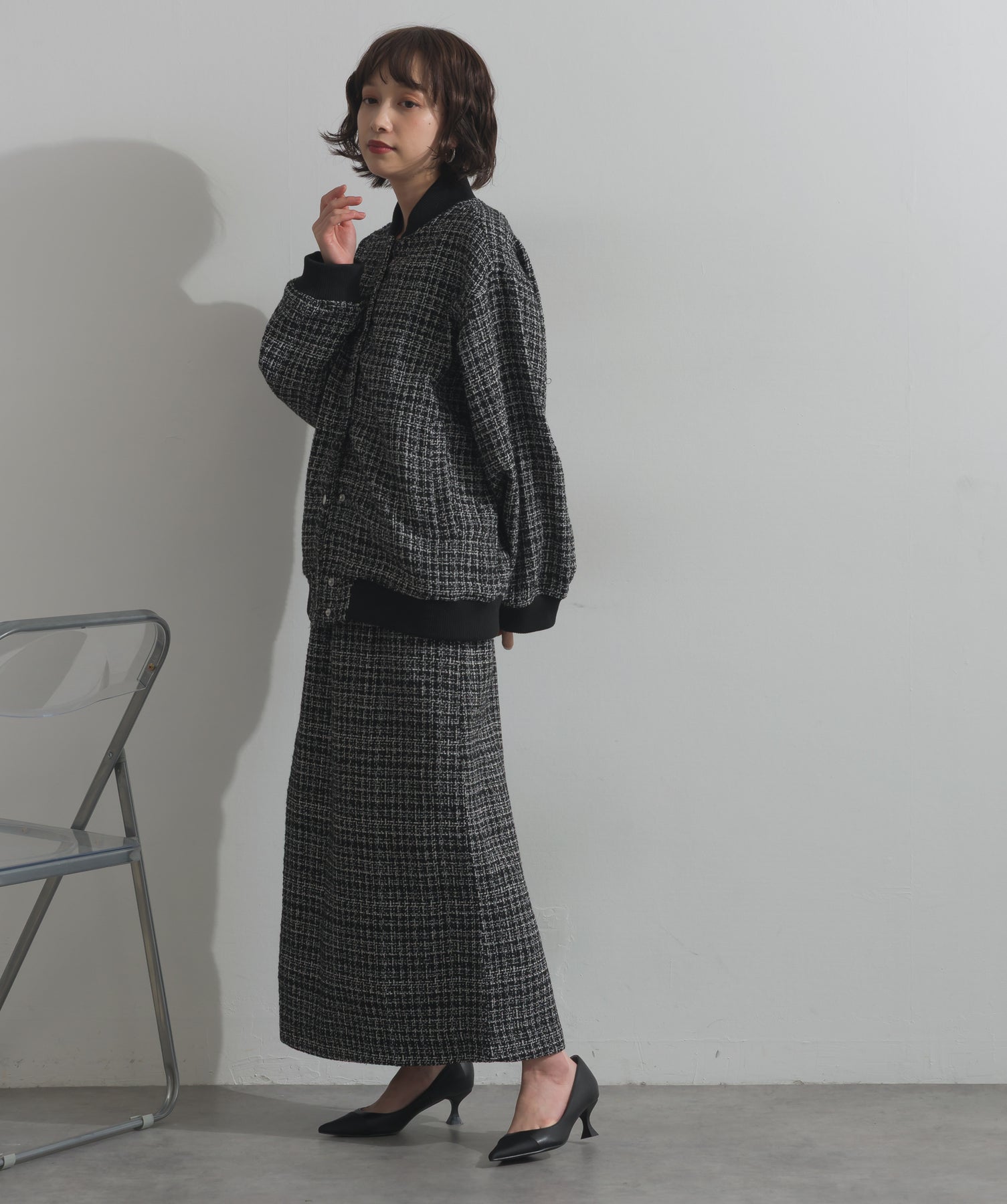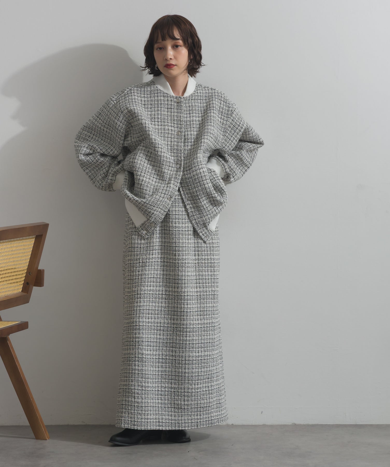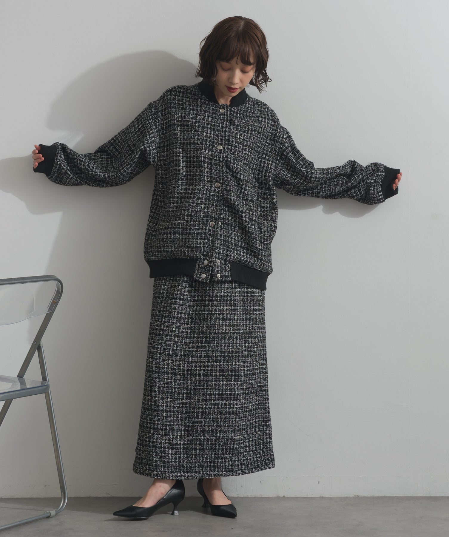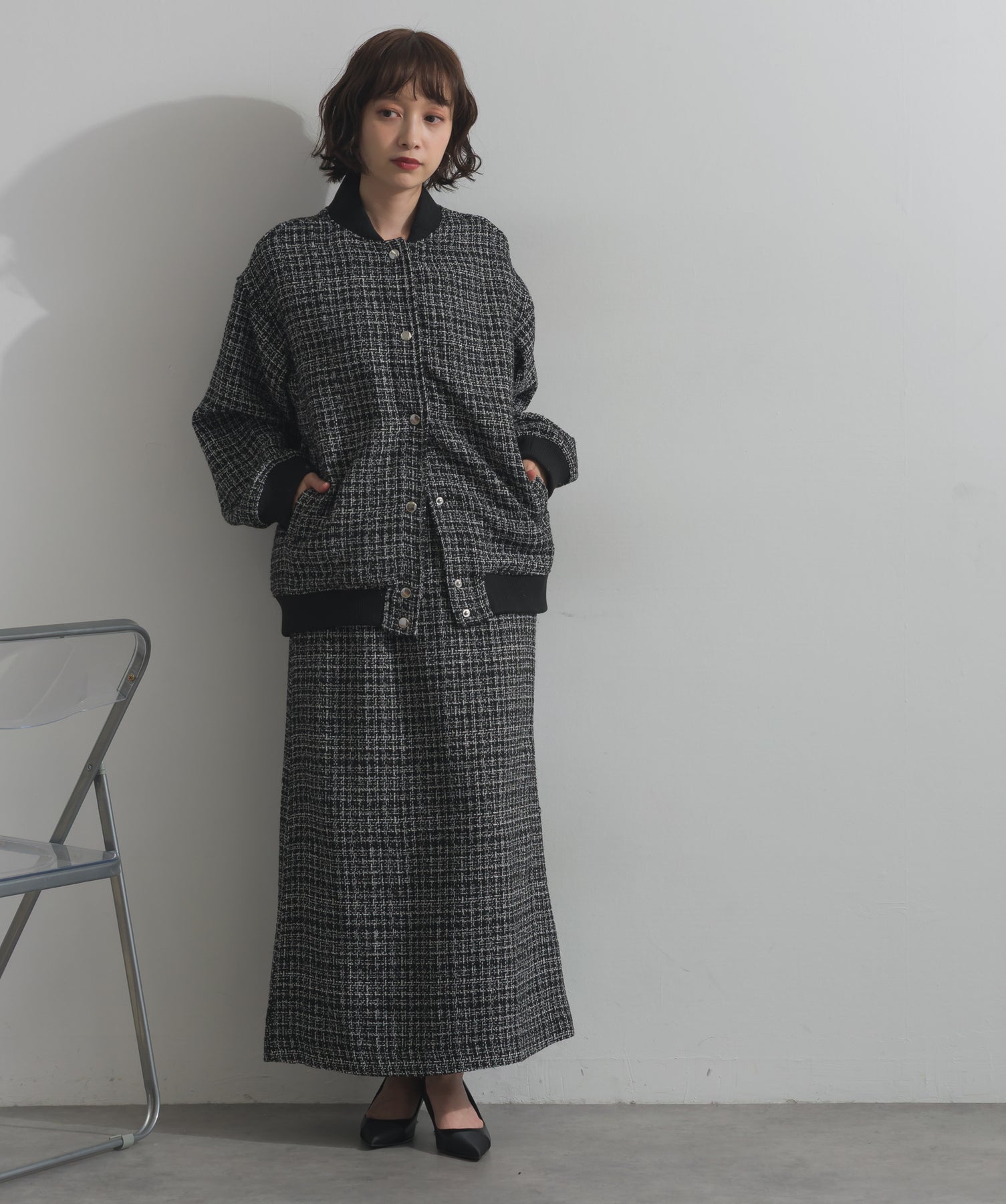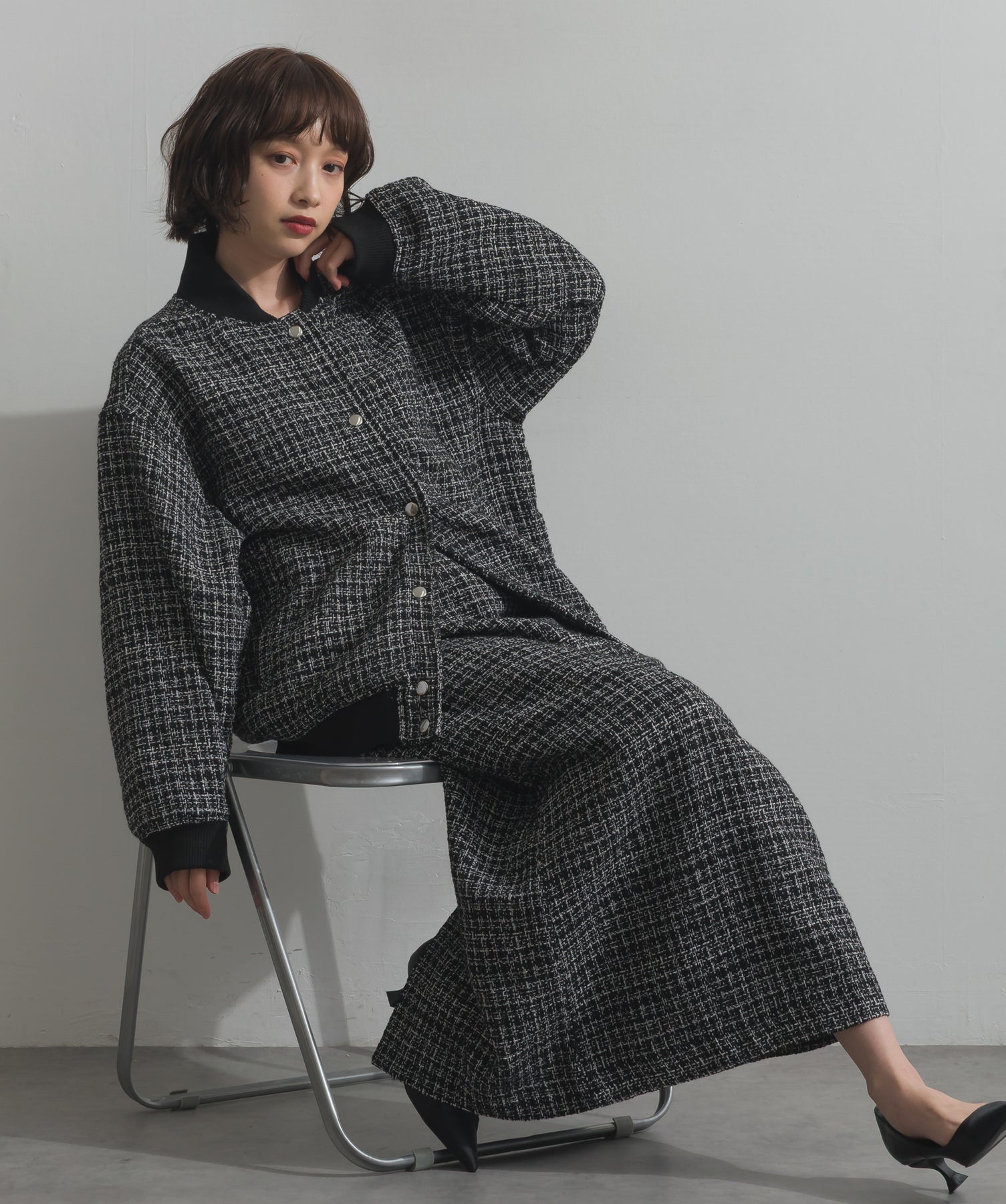 クラシカルを纏う、新感覚スタジャン。-material-上品な表情を演出するツイード調生地を使用。しっかりとした肉感がありながらも軽やかな着心地で、秋冬の羽織として活躍。リブ部分には伸縮性のあるニットを採用し、保温性と快適な着用感を両立。-design-クラシックなスタジャンを、ツイード素材で都会的にアップデート。ゆとりのあるシルエットと腰回りまで隠れる絶妙な丈感で、モードな抜け感を演出。フロントのボタンや裾リブの切り替えがアクセントとなり、セットアップでの着用はもちろん、デニムやスラックスとも好相性。スタイリングに品と存在感をプラスする主役級アウター。