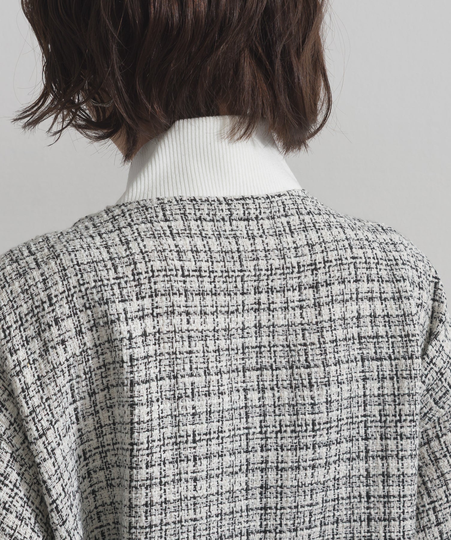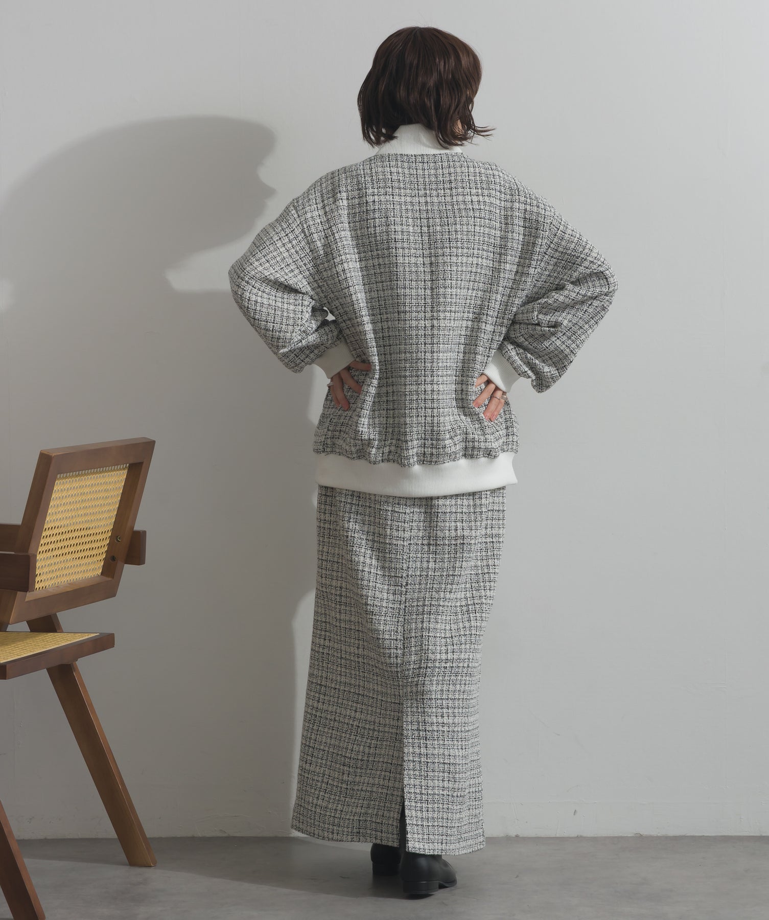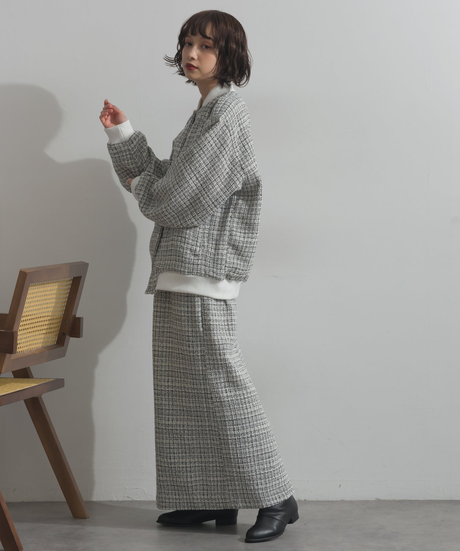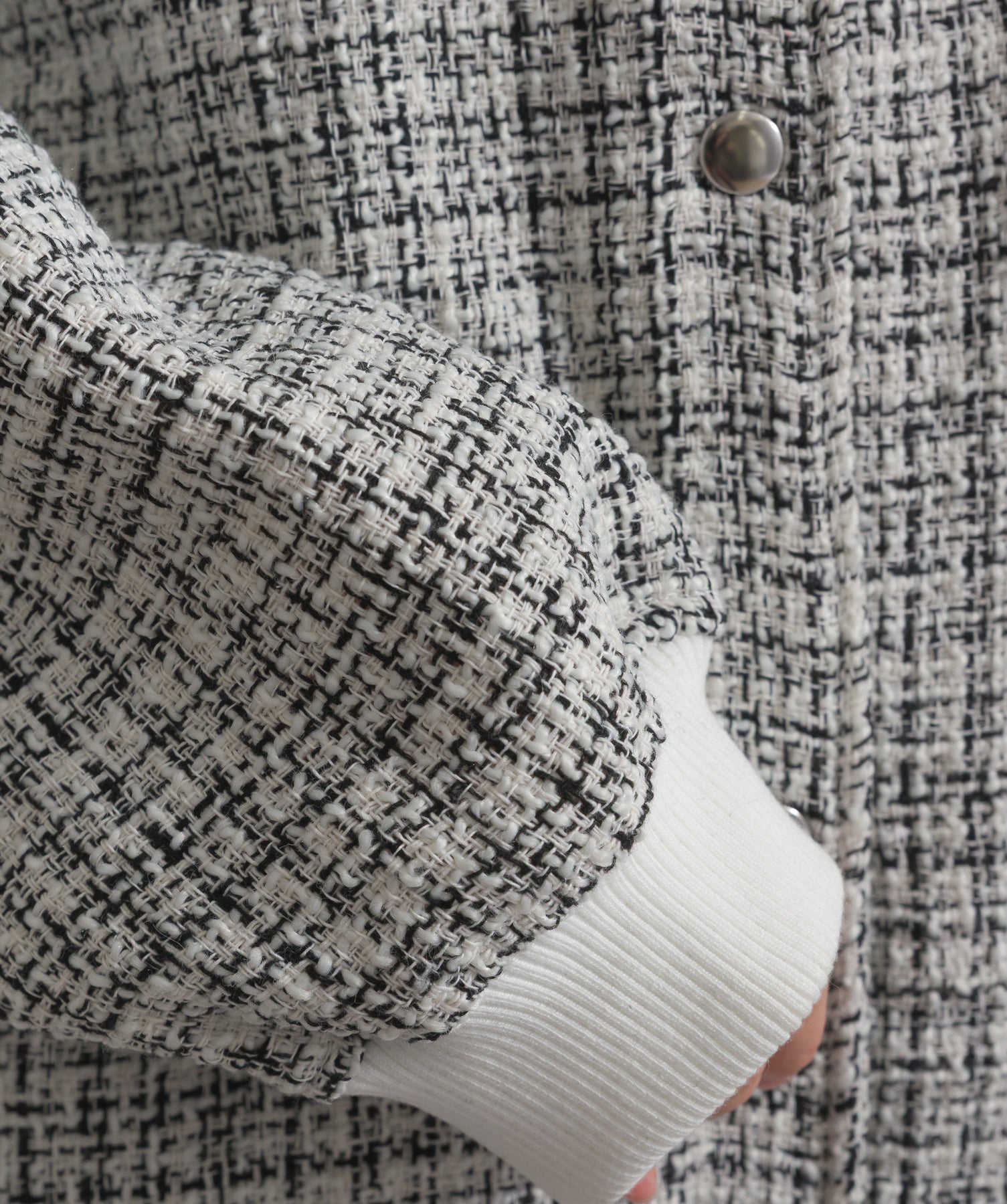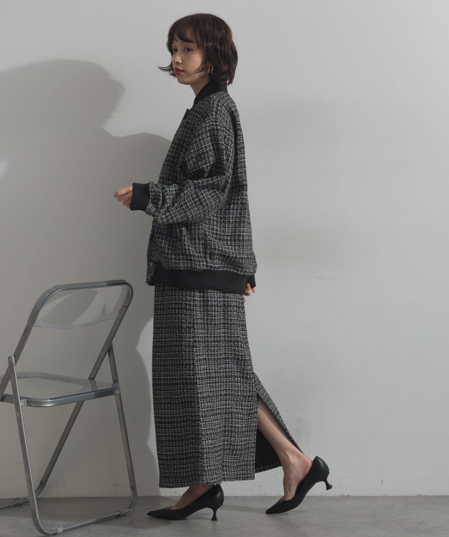クラシカルを纏う、新感覚スタジャン。-material-上品な表情を演出するツイード調生地を使用。しっかりとした肉感がありながらも軽やかな着心地で、秋冬の羽織として活躍。リブ部分には伸縮性のあるニットを採用し、保温性と快適な着用感を両立。-design-クラシックなスタジャンを、ツイード素材で都会的にアップデート。ゆとりのあるシルエットと腰回りまで隠れる絶妙な丈感で、モードな抜け感を演出。フロントのボタンや裾リブの切り替えがアクセントとなり、セットアップでの着用はもちろん、デニムやスラックスとも好相性。スタイリングに品と存在感をプラスする主役級アウター。