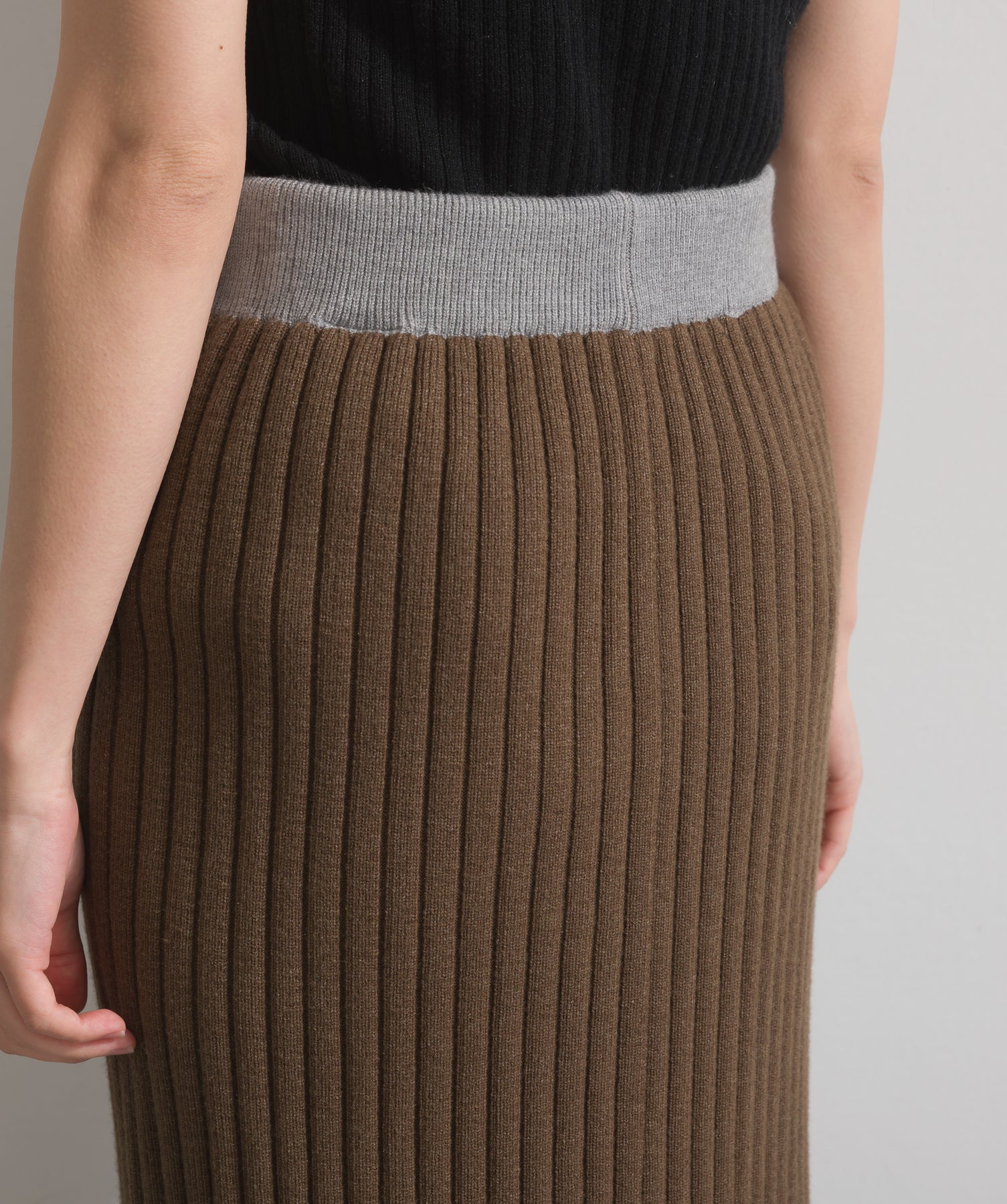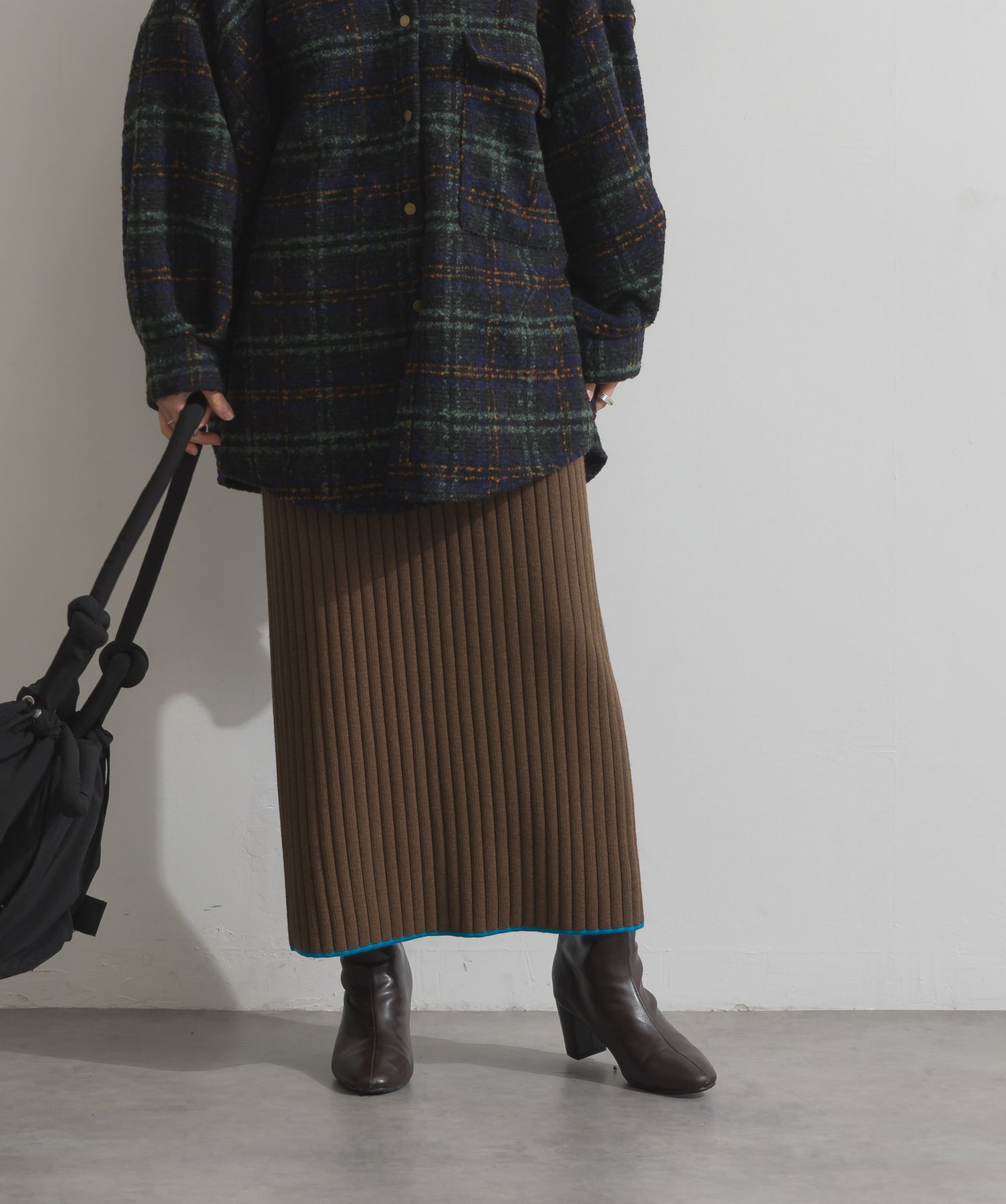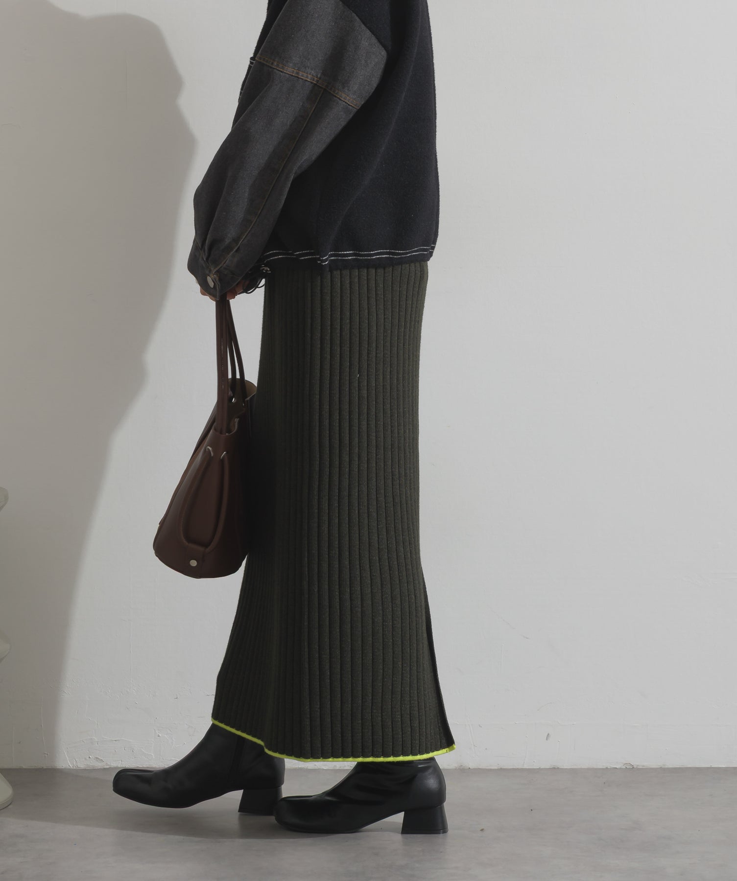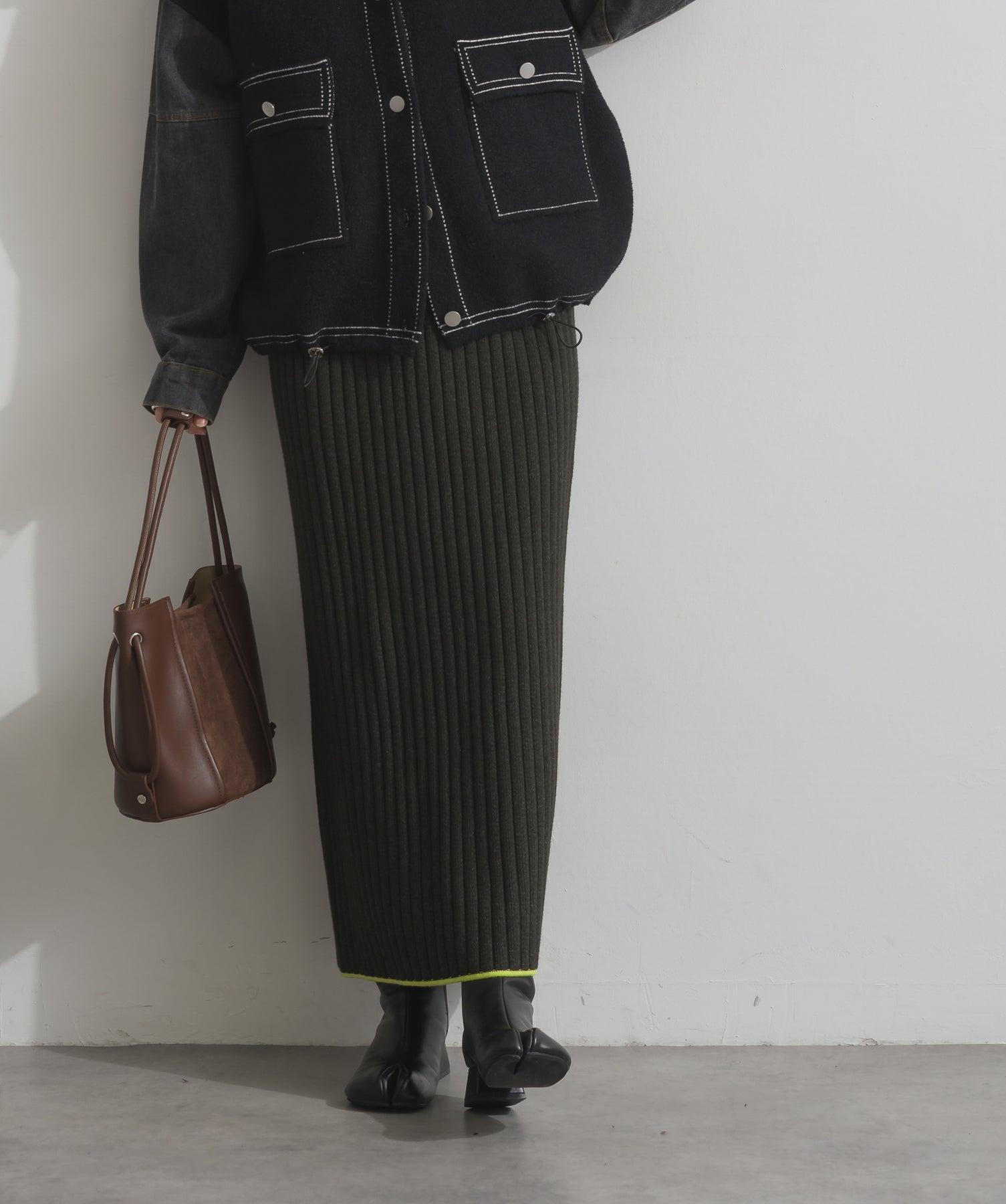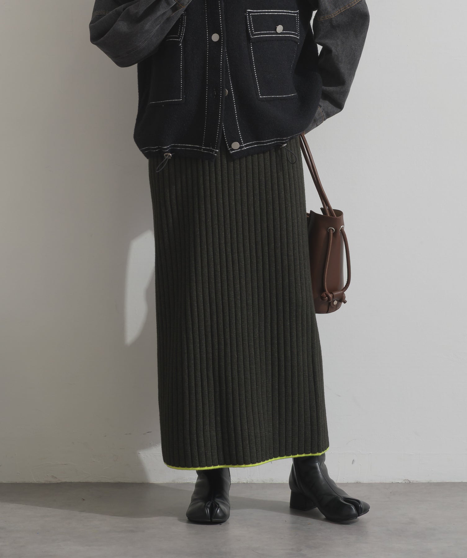 差し色で魅せる。大人のための洗練ニットスカート。-material-しっかりとした肉厚感と伸縮性を備えたリブニット素材を使用。程よいハリと柔らかさが両立し、ボディラインを拾いすぎず快適な穿き心地に仕上げています。-design-ワイドピッチの縦リブがすっきりとしたIラインを強調。裾には鮮やかなカラーラインを施し、シンプルな中にもエッジの効いたアクセントをプラス。ウエストは総ゴム仕様でノンストレス。スニーカーからショートブーツまで幅広いスタイリングに馴染む、デイリーに頼れる1本です。