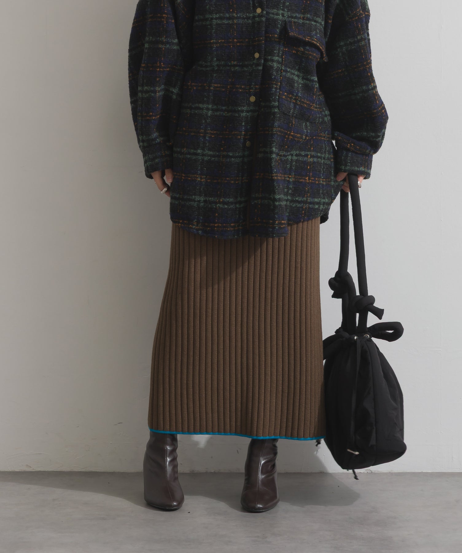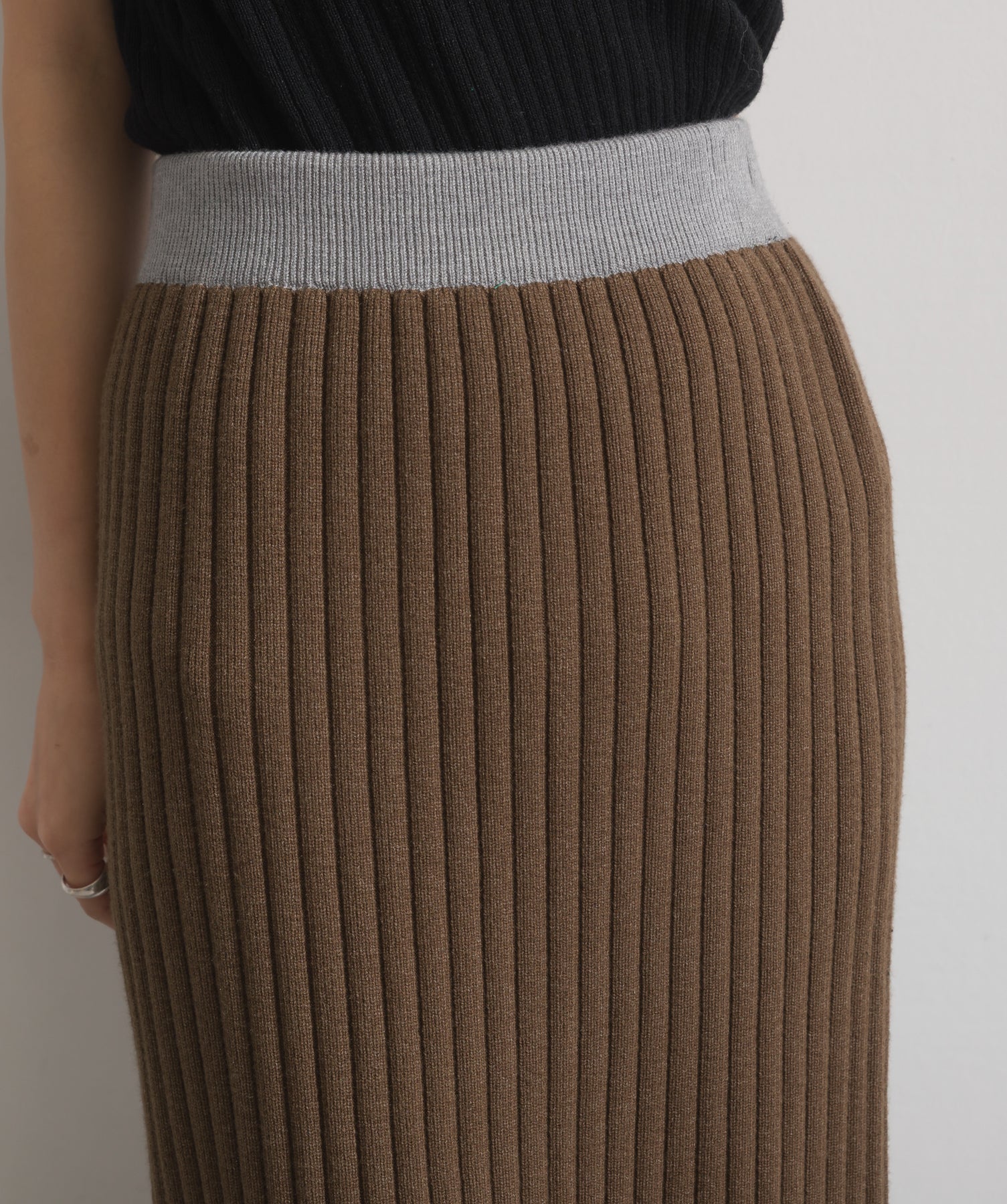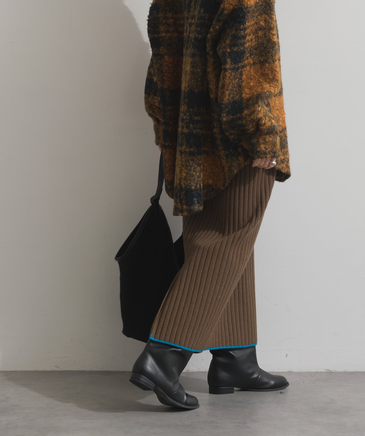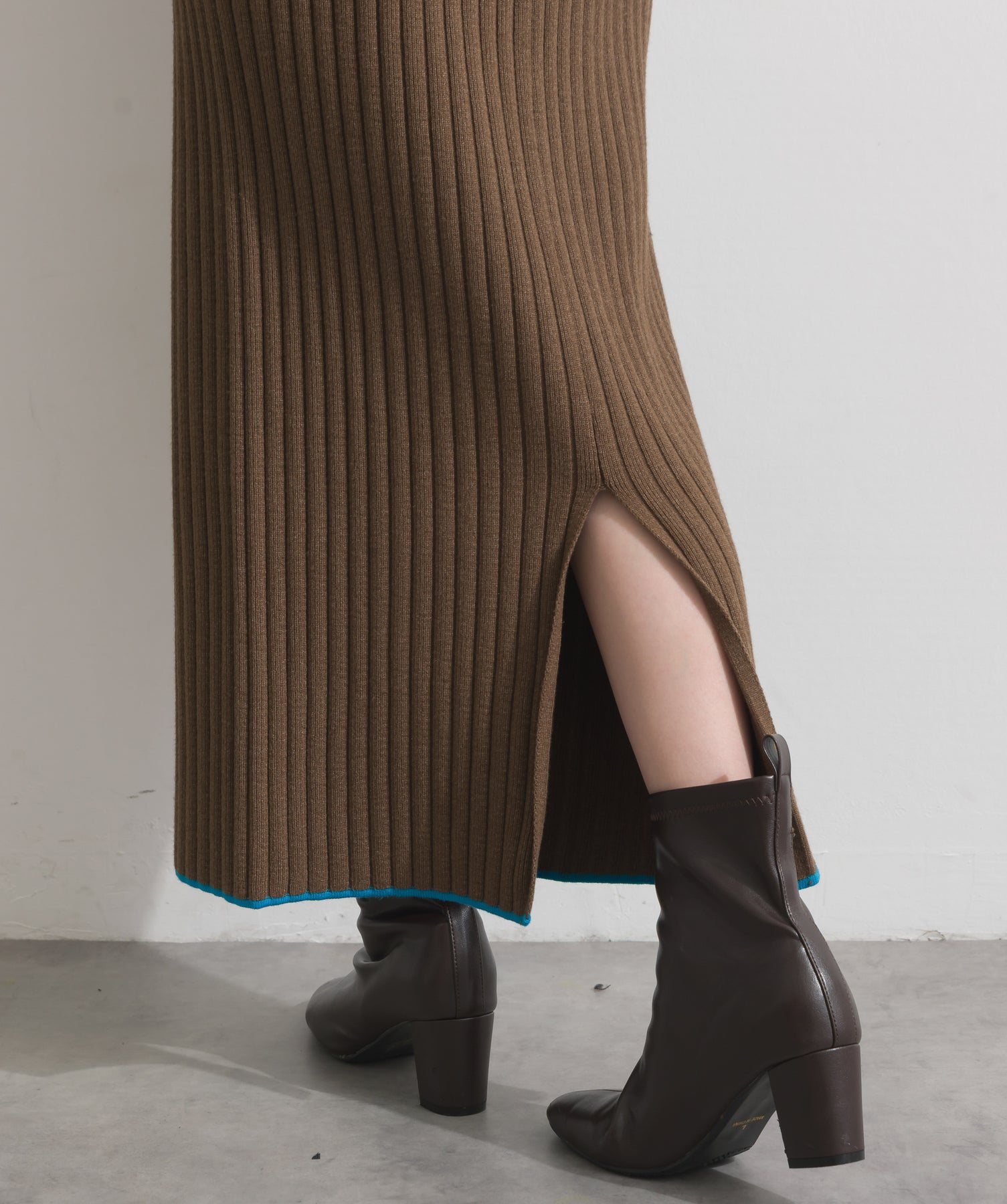 差し色で魅せる。大人のための洗練ニットスカート。-material-しっかりとした肉厚感と伸縮性を備えたリブニット素材を使用。程よいハリと柔らかさが両立し、ボディラインを拾いすぎず快適な穿き心地に仕上げています。-design-ワイドピッチの縦リブがすっきりとしたIラインを強調。裾には鮮やかなカラーラインを施し、シンプルな中にもエッジの効いたアクセントをプラス。ウエストは総ゴム仕様でノンストレス。スニーカーからショートブーツまで幅広いスタイリングに馴染む、デイリーに頼れる1本です。