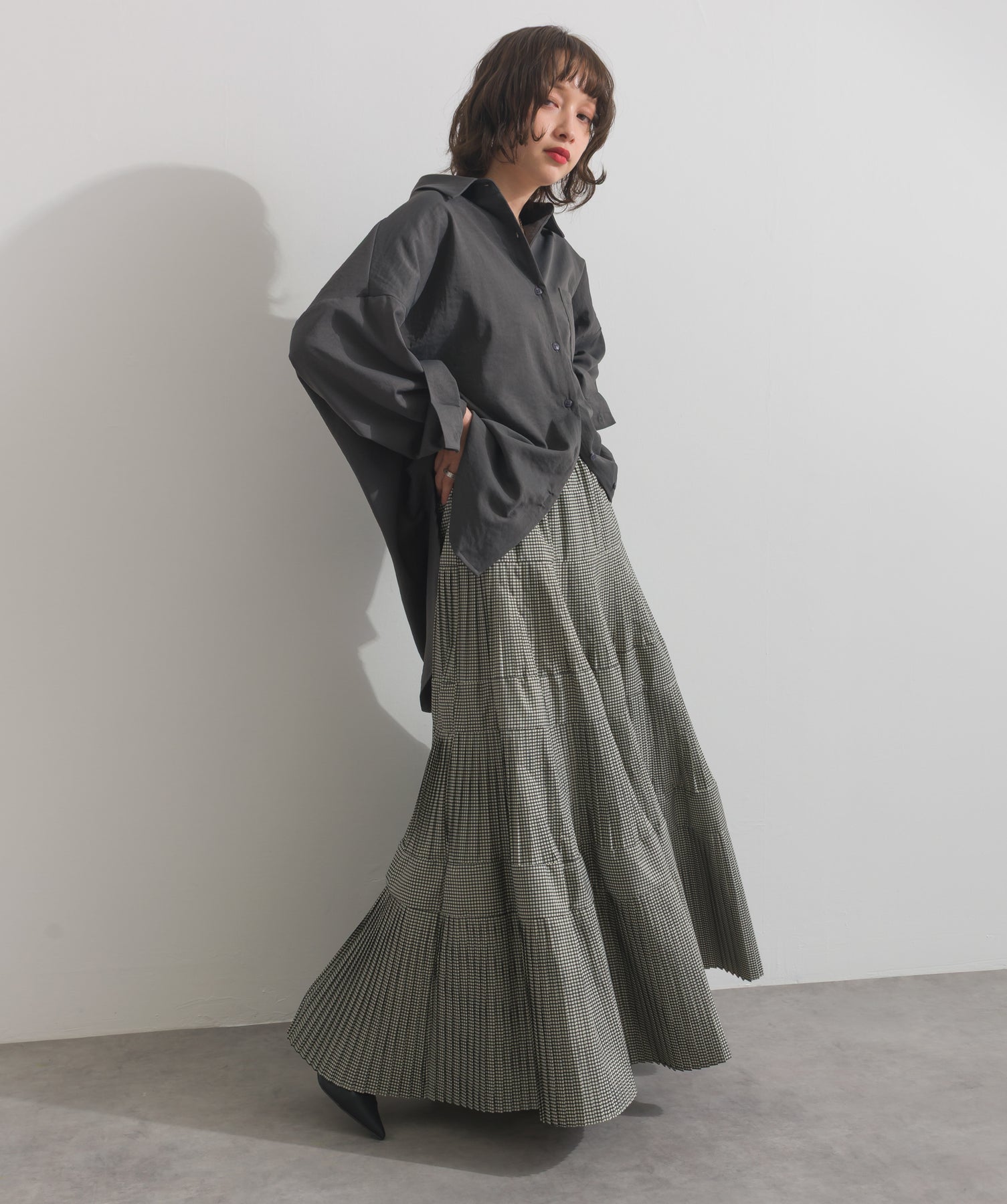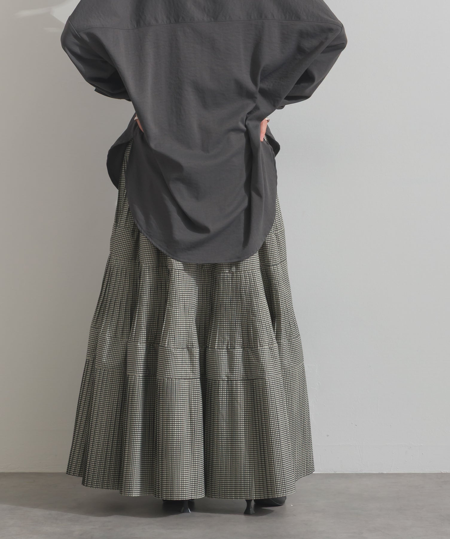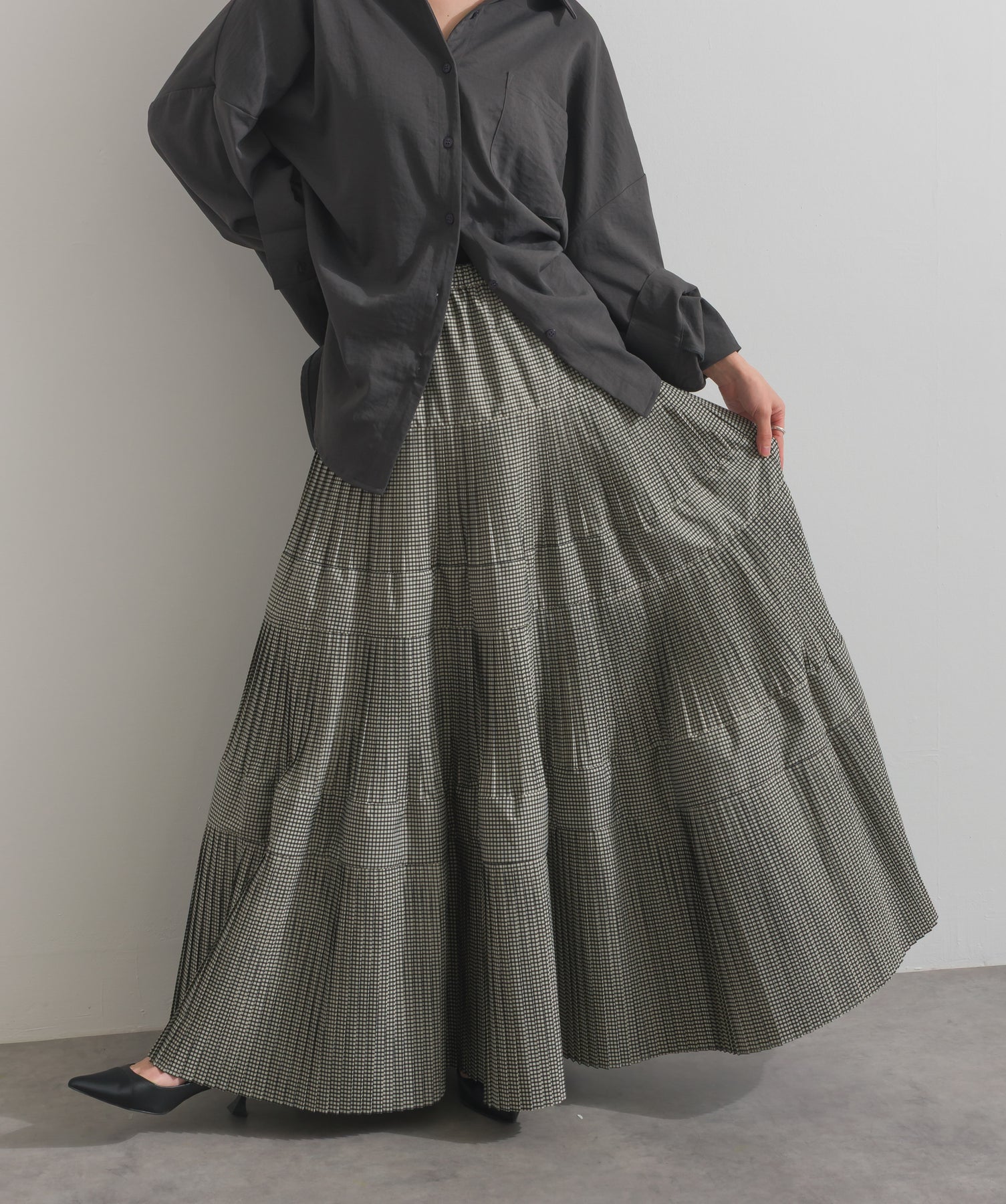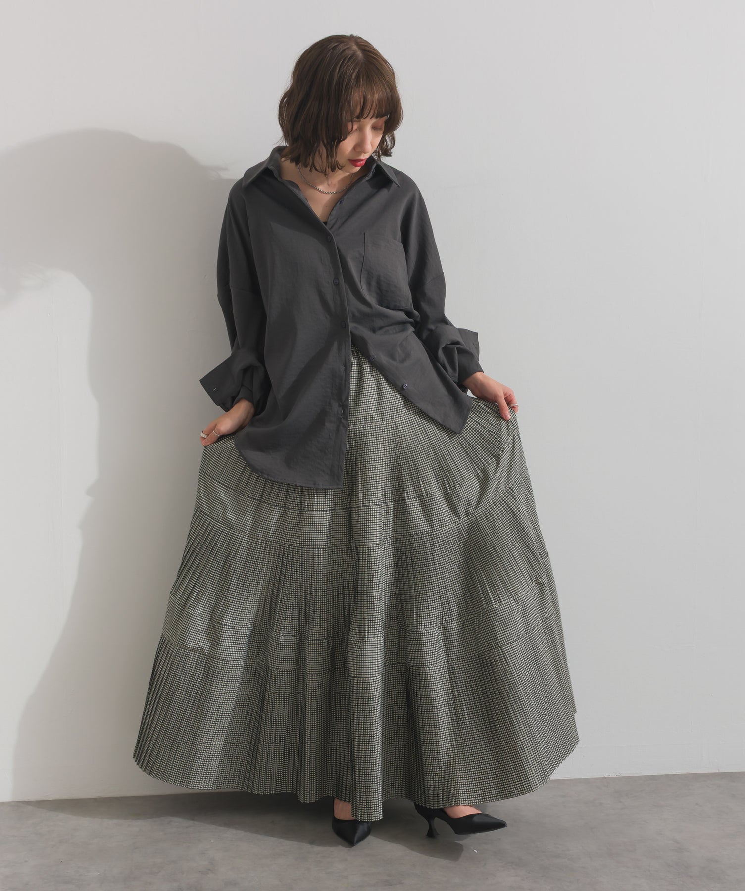 動くたび、存在感。構築的ドレープが魅せる美ラインスカート。-material-ハリ感と軽やかさを兼ね備えたビンテージブロード素材を使用。シワになりにくく、ナチュラルな表情とさらりとした肌触りが特徴。カジュアルながら品のある質感で、シーズンレスに着用可能。-design-フロントからサイドにかけて施されたランダムタックが、立体的で奥行きのあるフォルムを生み出すロングスカート。程よいボリューム感とドレープが足元にニュアンスを与え、シンプルなトップスを合わせるだけで洗練されたスタイリングに。ウエストはゴム仕様で穿き心地も快適。両サイドには便利なポケット付きで実用性も◎。