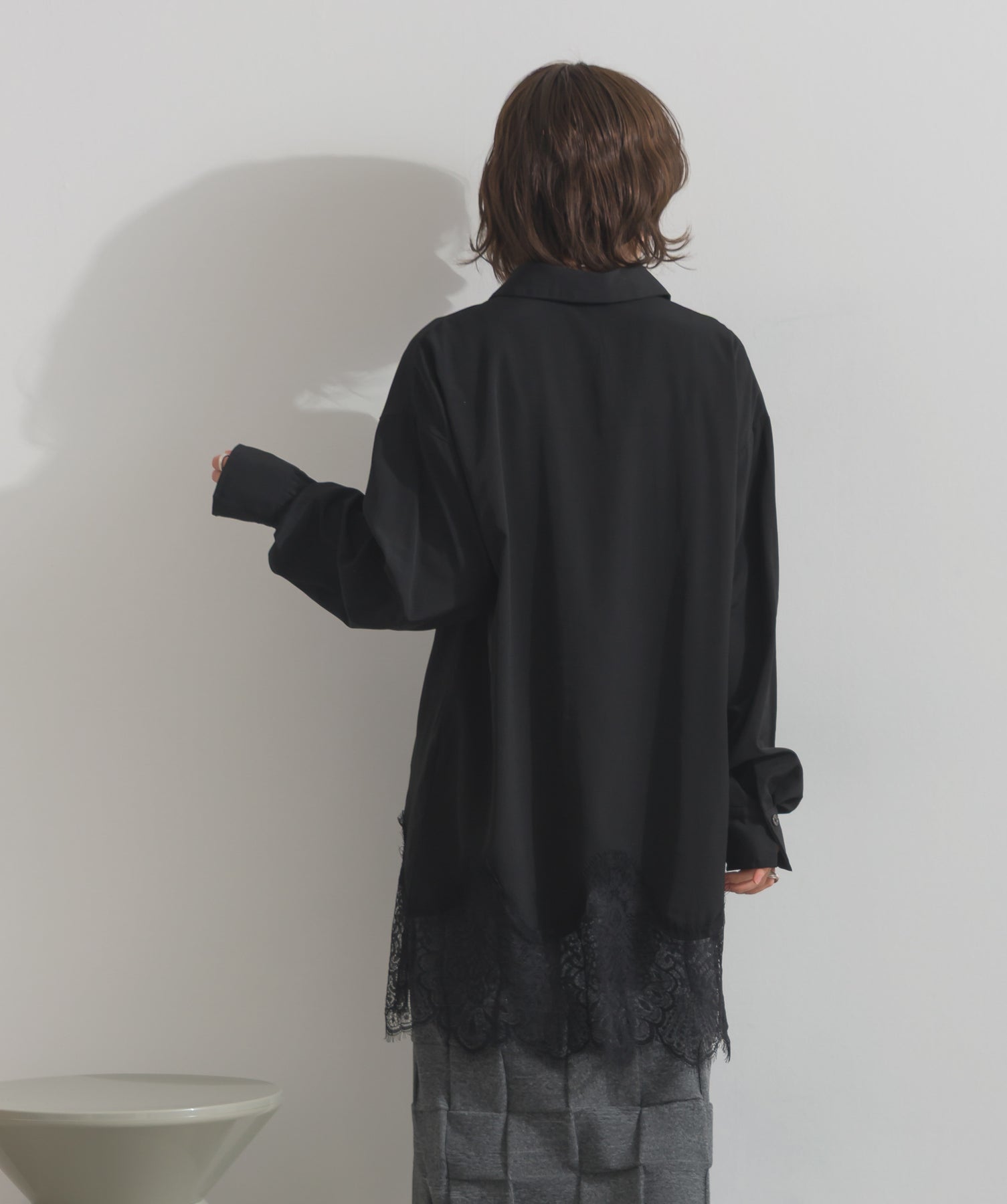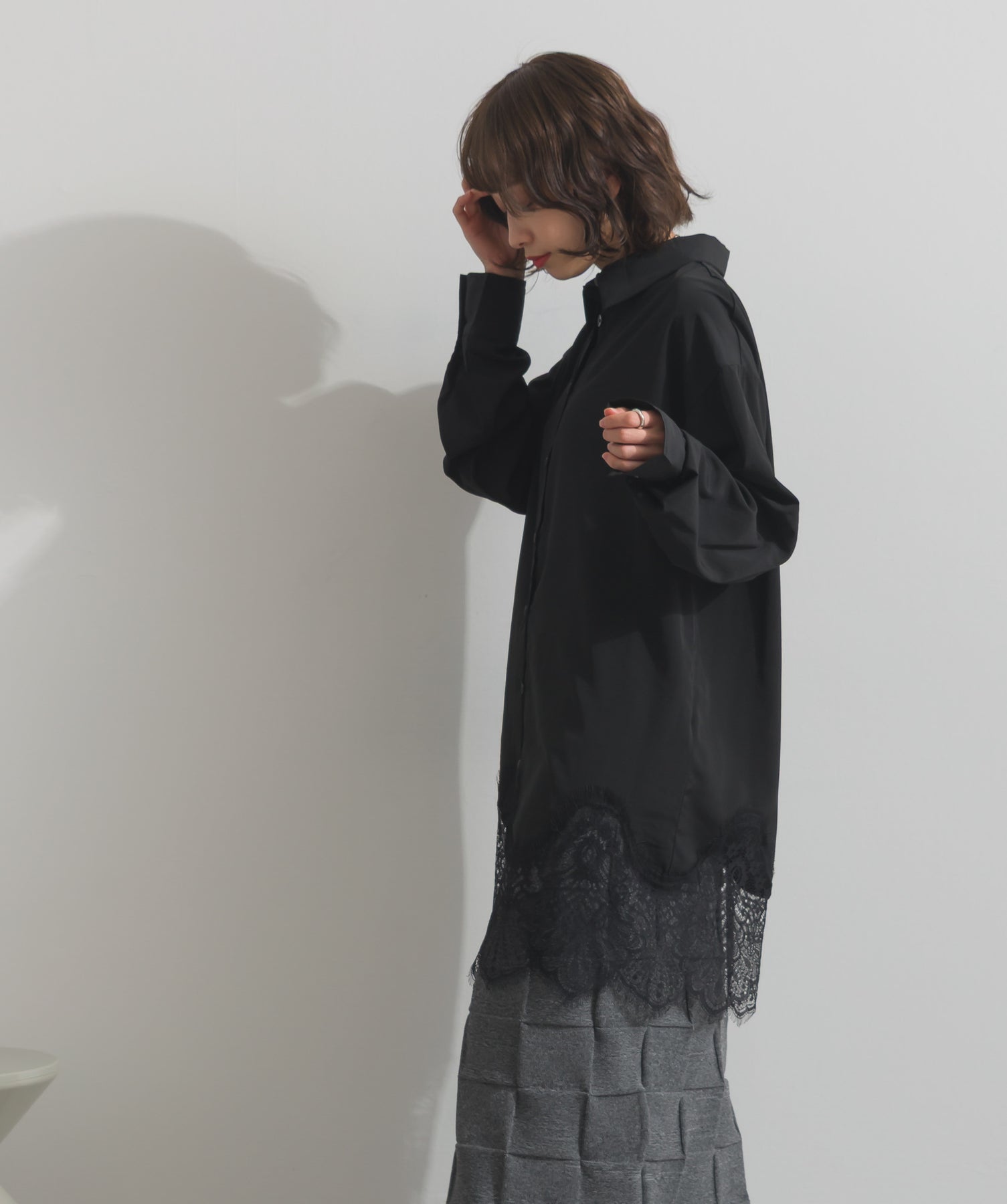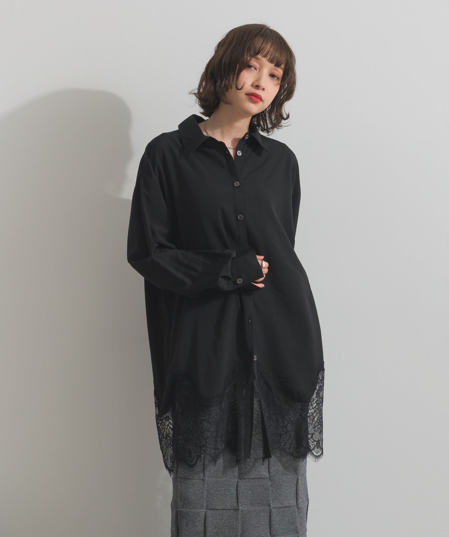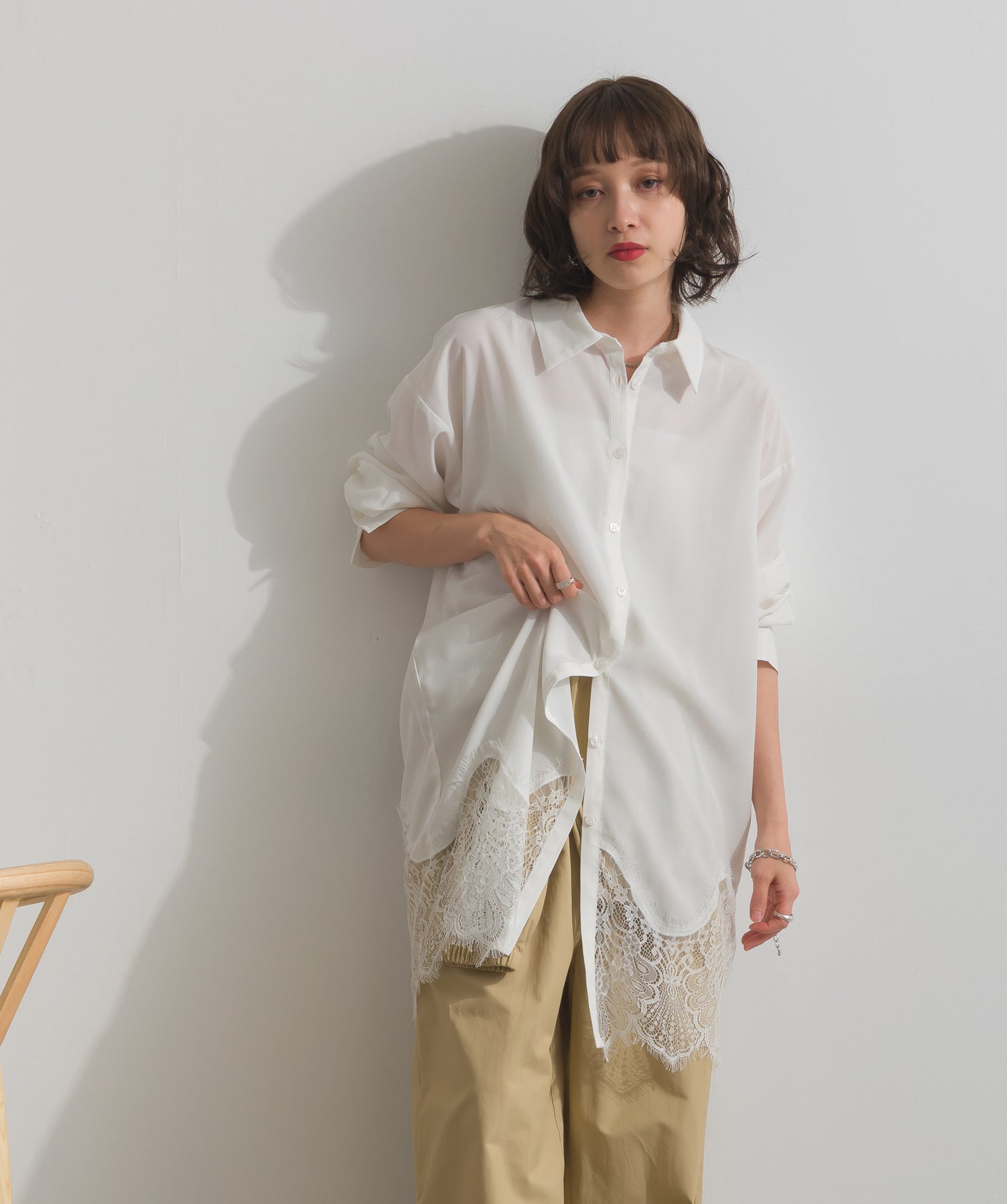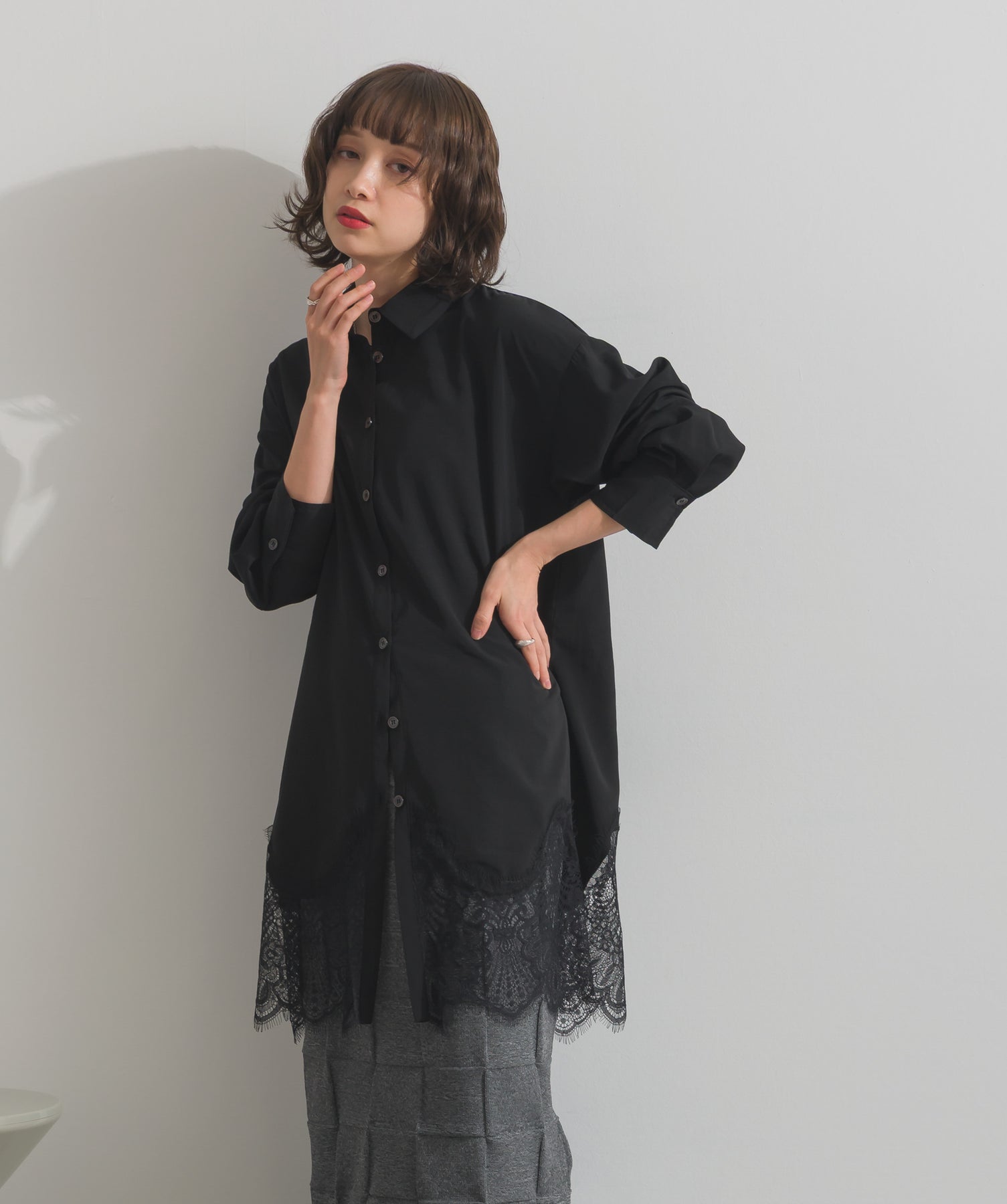 シャツのクリーンな印象とレースの甘さが共存する、洗練されたデザイン。ヒップが隠れる長め丈で、チュニックとしても羽織りとしても着回せる2WAY仕様。ボトムにデニムを合わせてカジュアルダウンも、スラックスやレギンスでモード寄りに仕上げるのも◎。