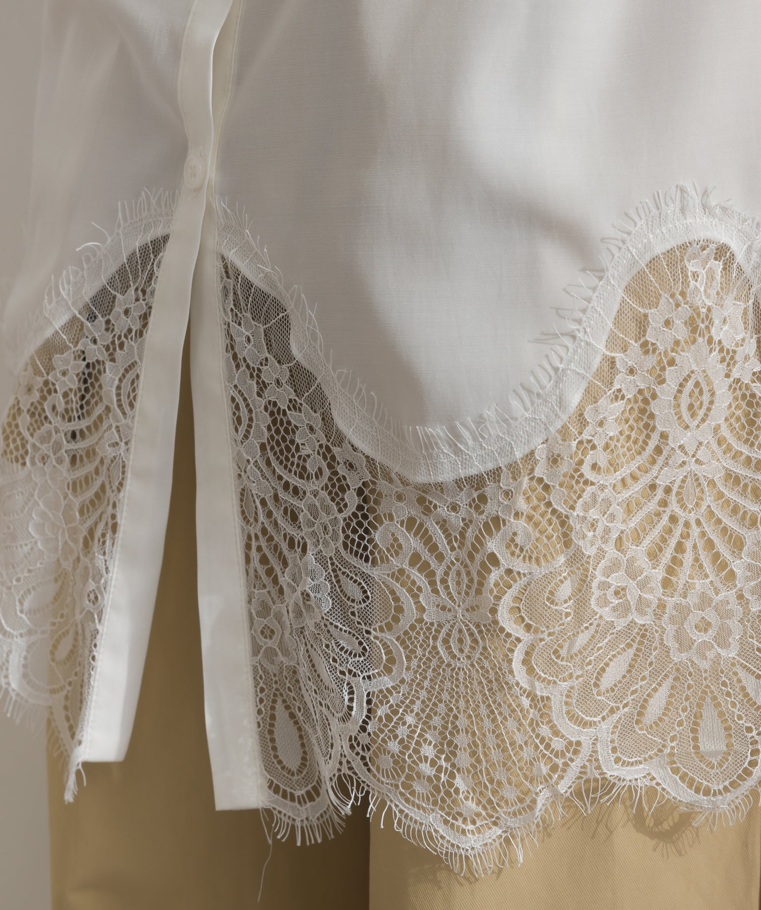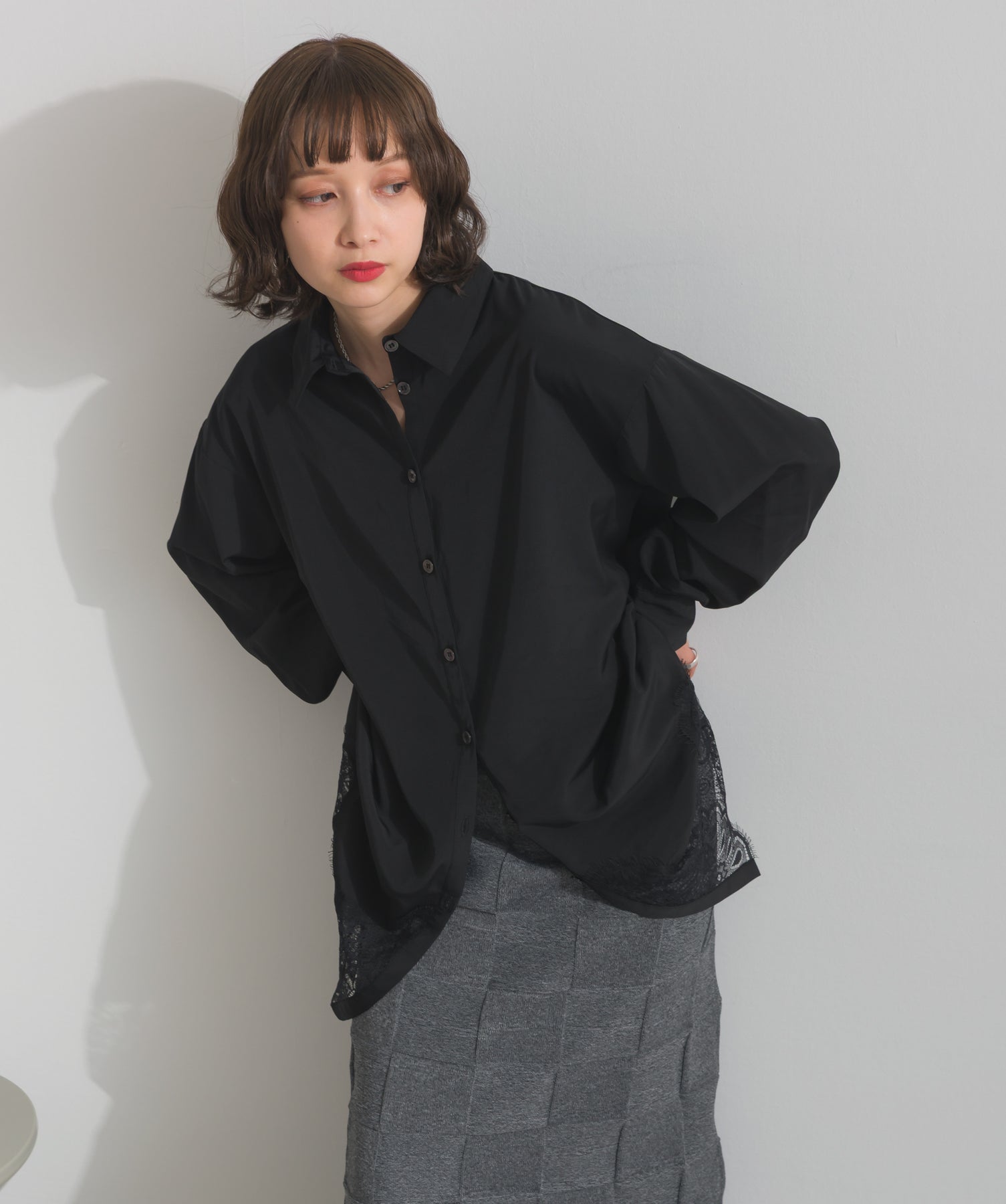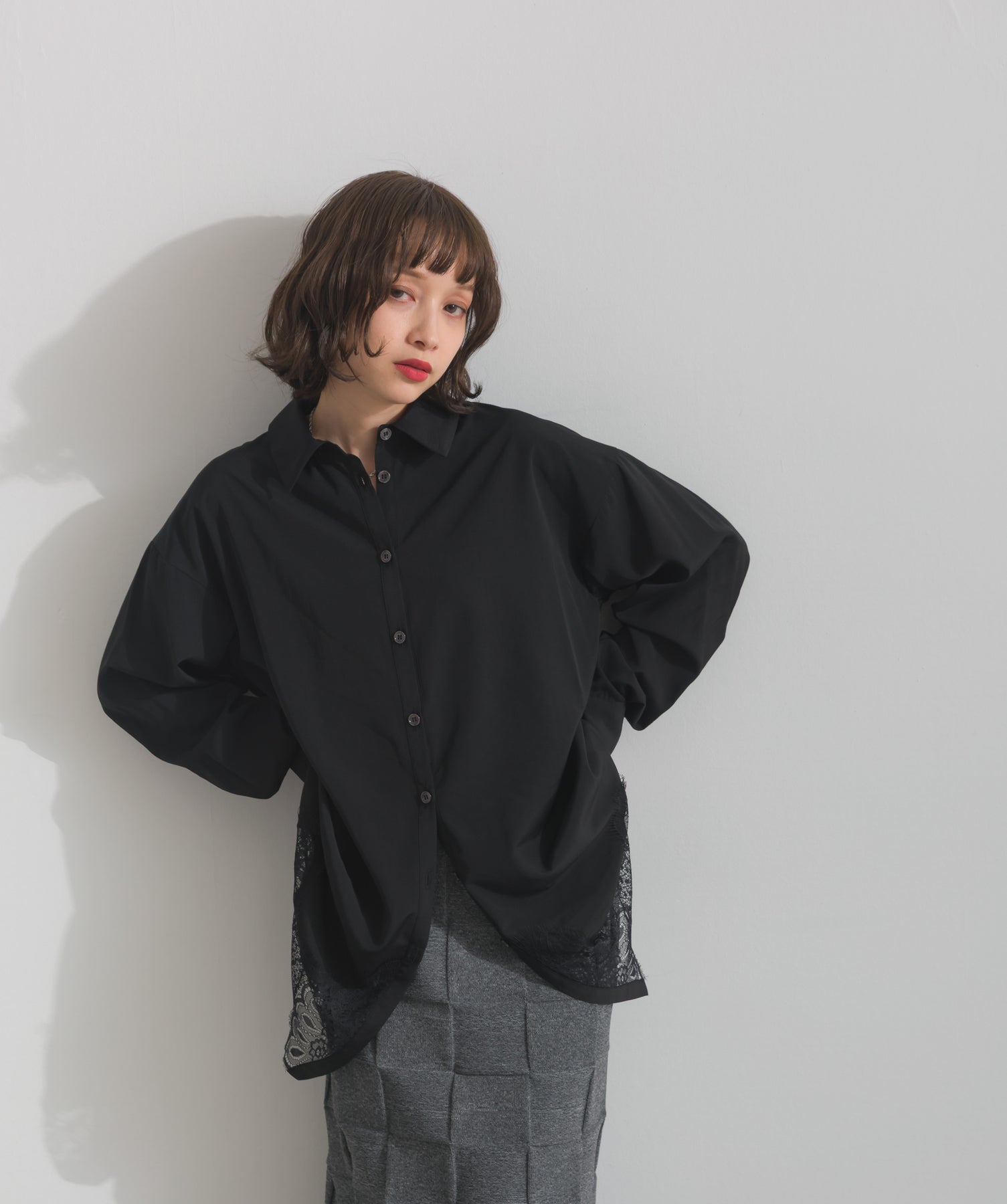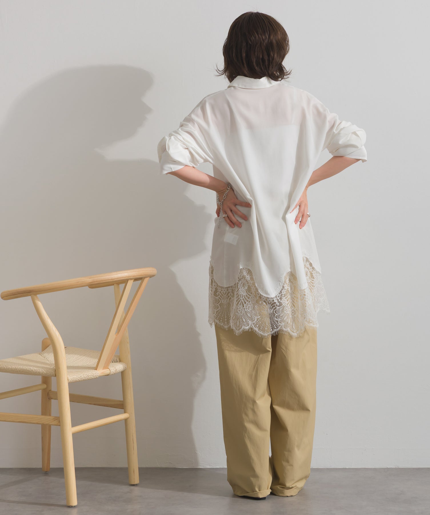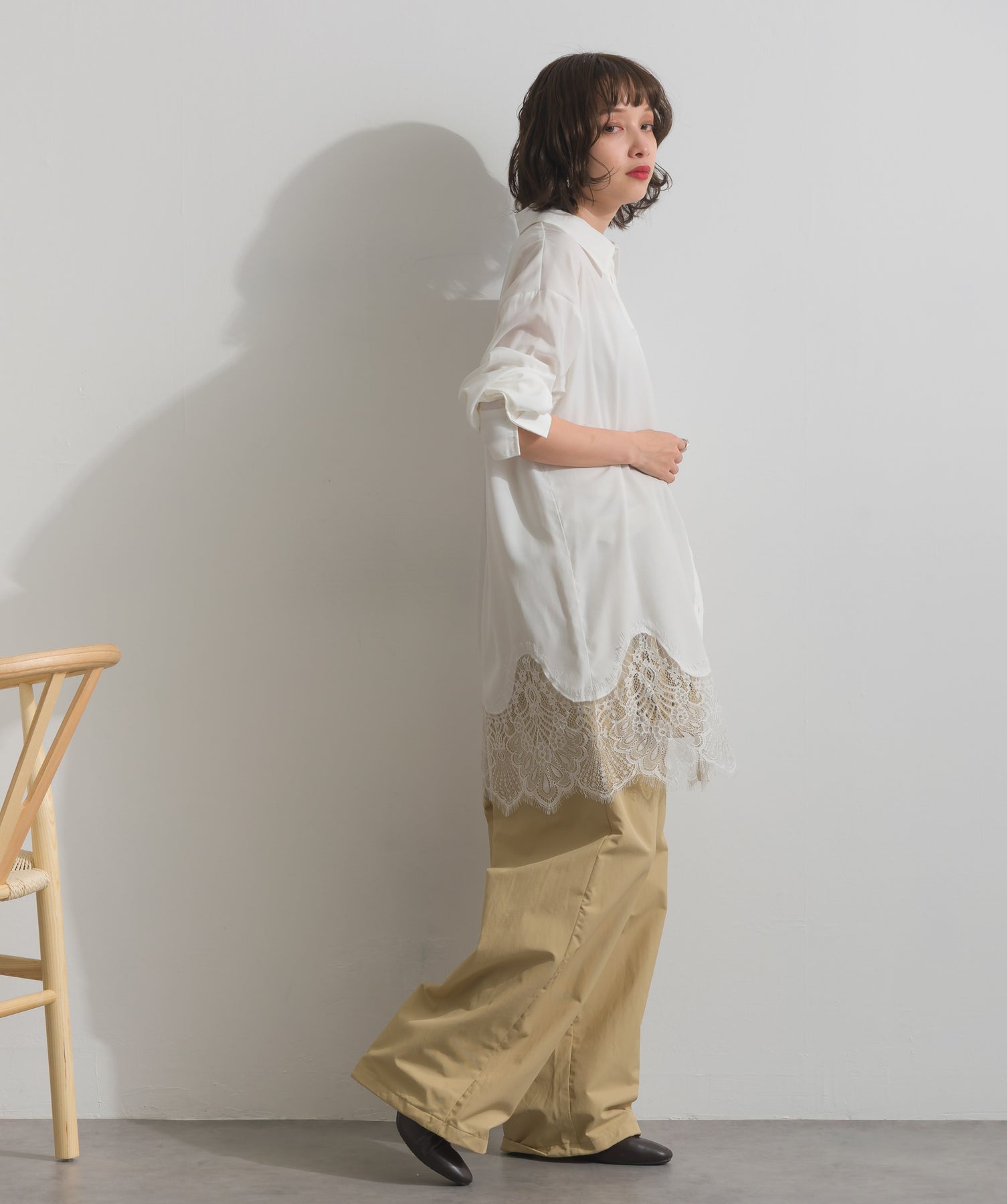 シャツのクリーンな印象とレースの甘さが共存する、洗練されたデザイン。ヒップが隠れる長め丈で、チュニックとしても羽織りとしても着回せる2WAY仕様。ボトムにデニムを合わせてカジュアルダウンも、スラックスやレギンスでモード寄りに仕上げるのも◎。
