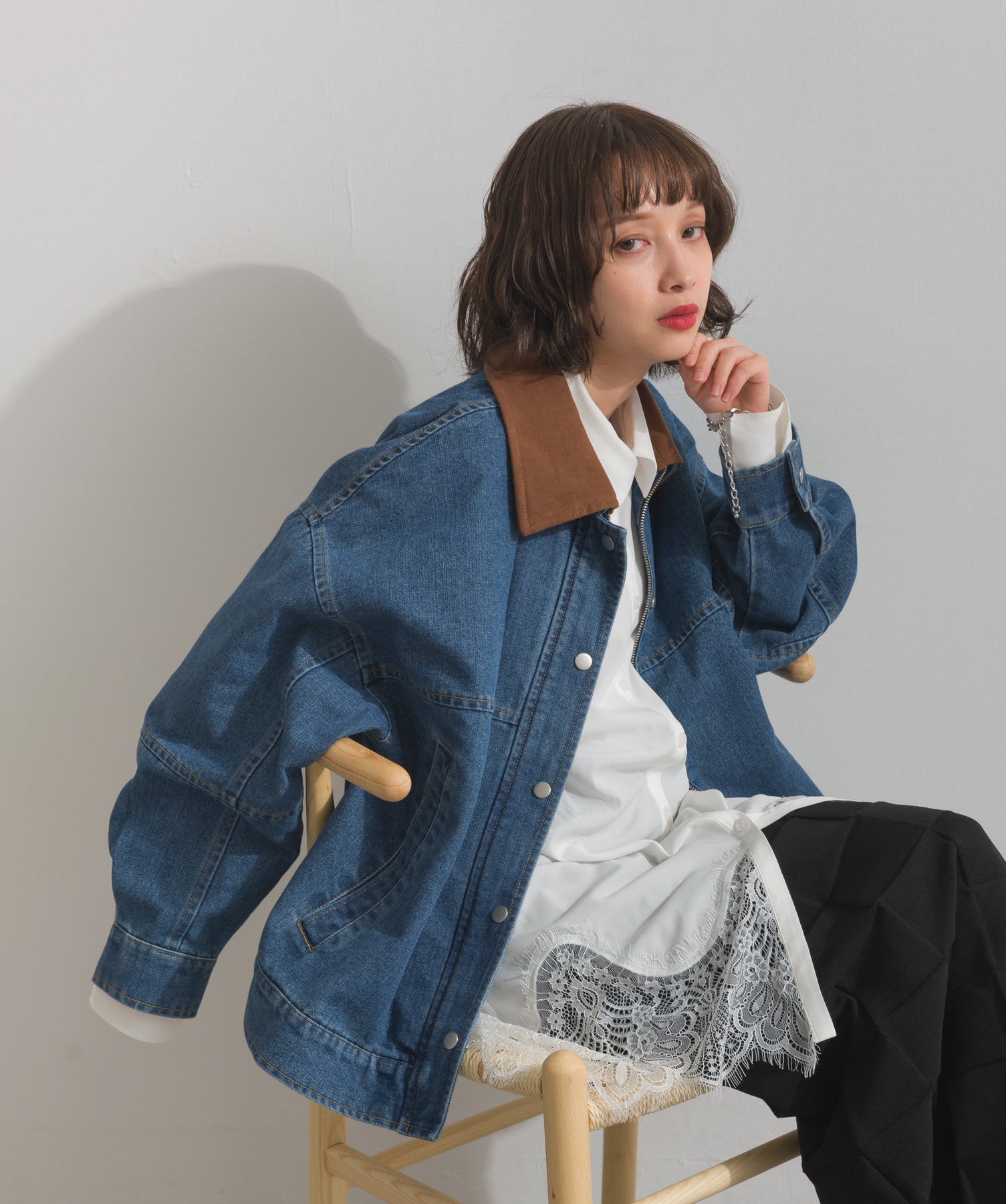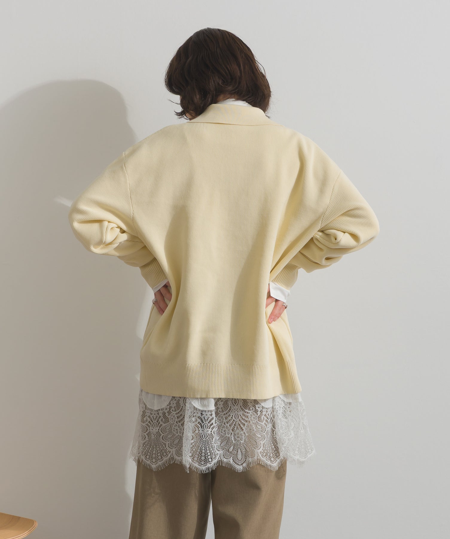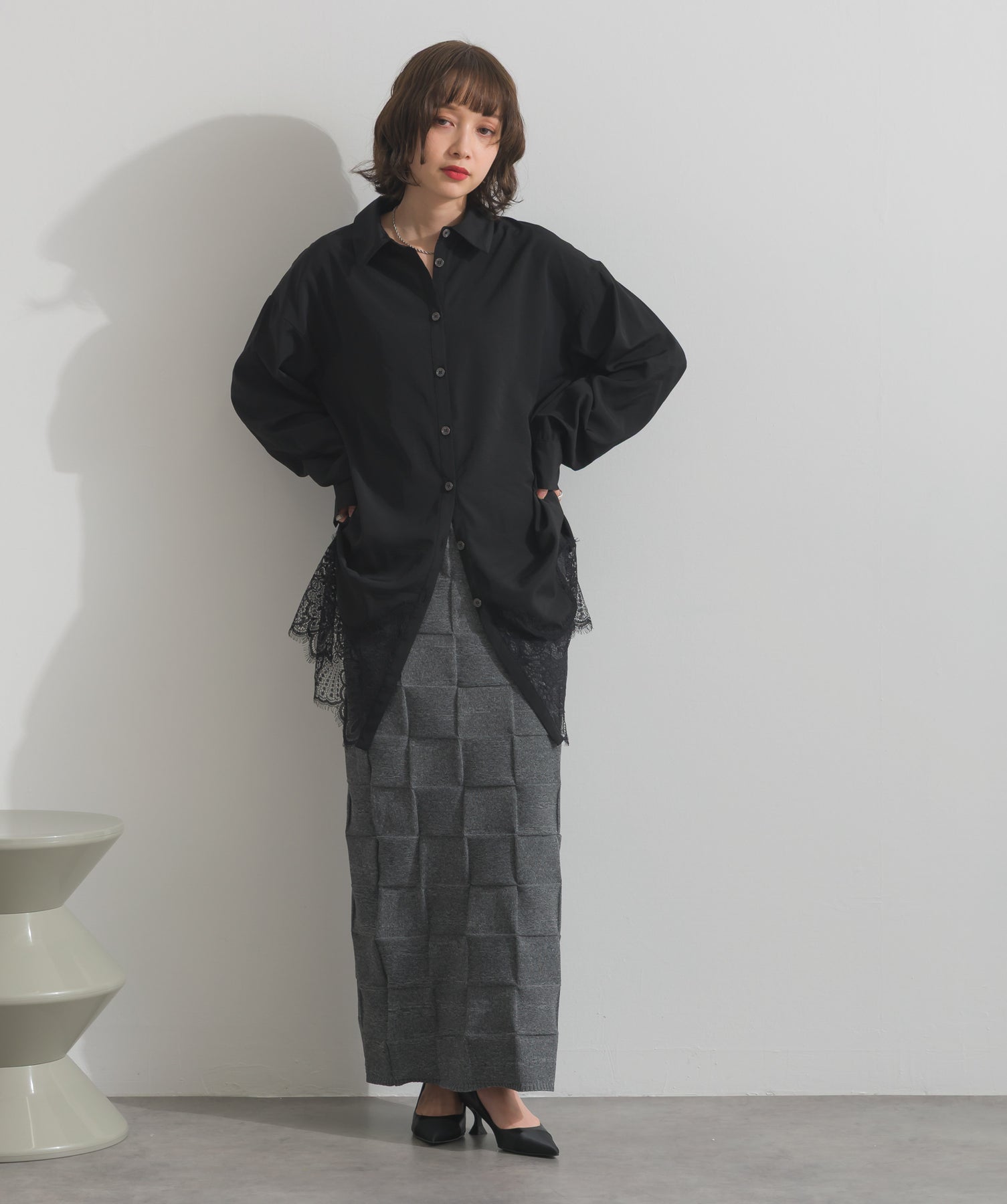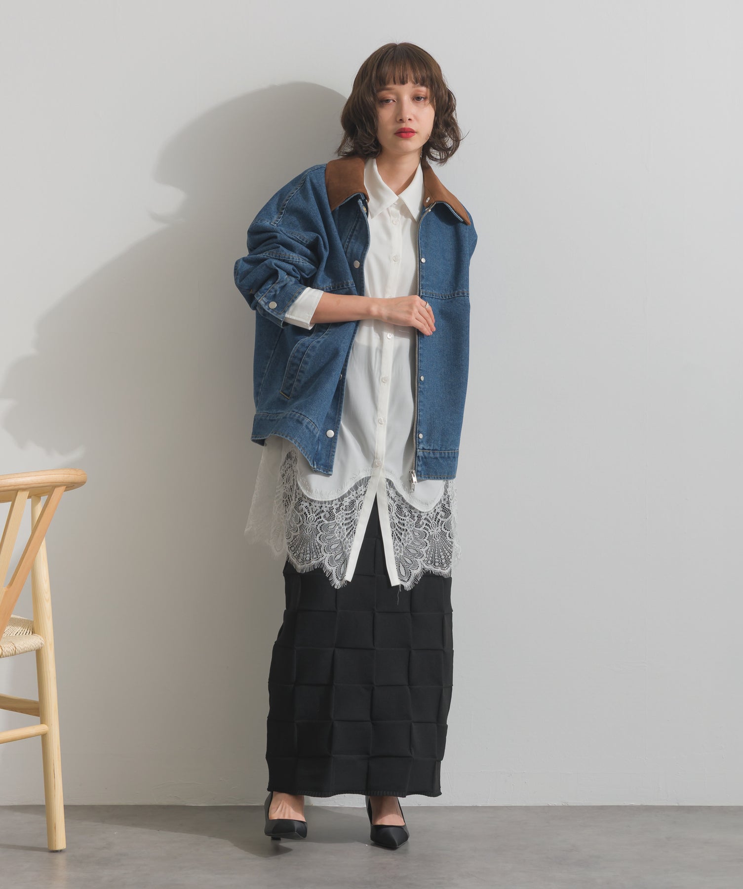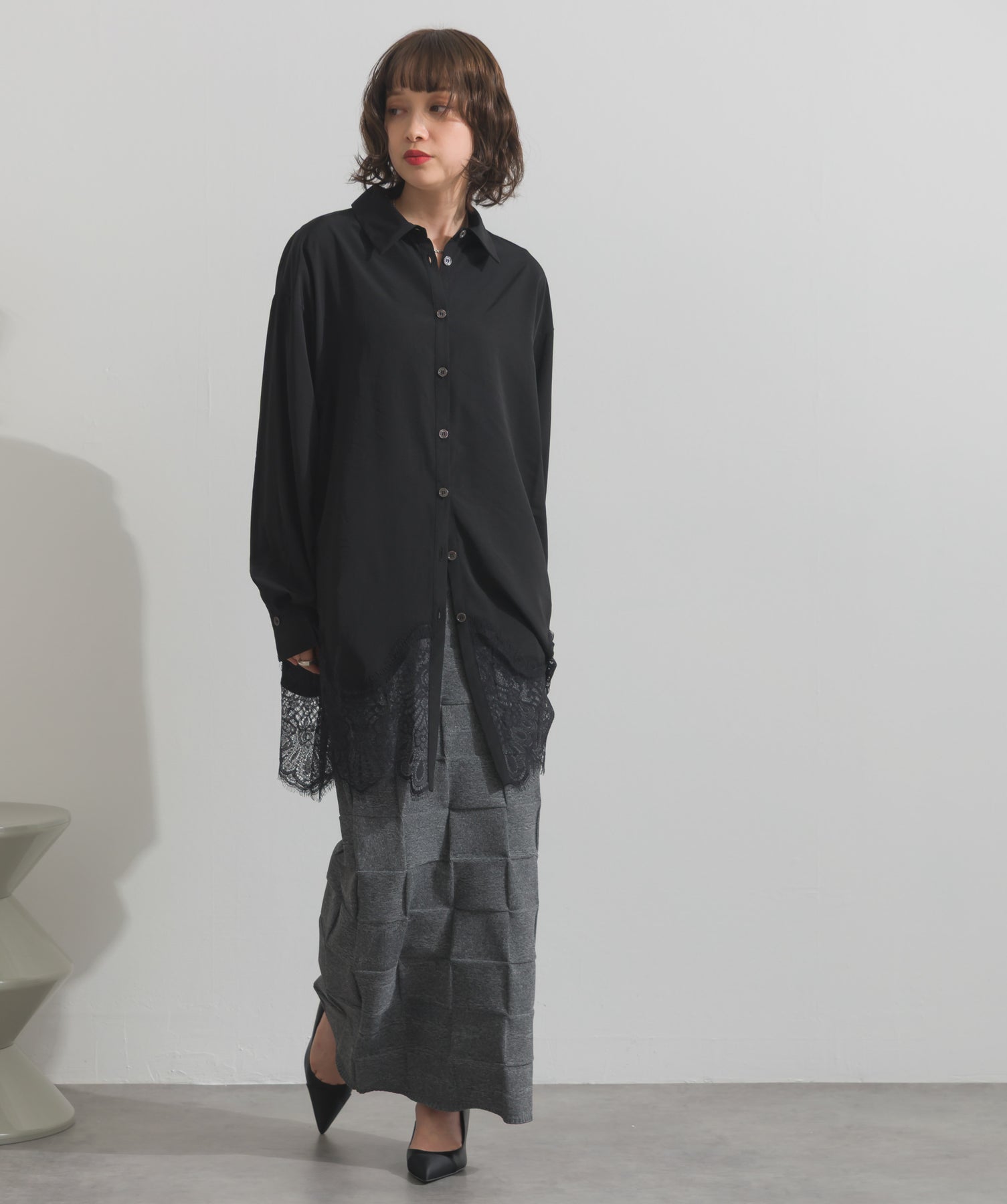 シャツのクリーンな印象とレースの甘さが共存する、洗練されたデザイン。ヒップが隠れる長め丈で、チュニックとしても羽織りとしても着回せる2WAY仕様。ボトムにデニムを合わせてカジュアルダウンも、スラックスやレギンスでモード寄りに仕上げるのも◎。